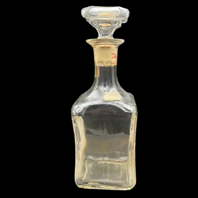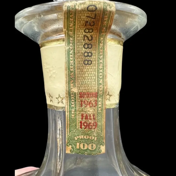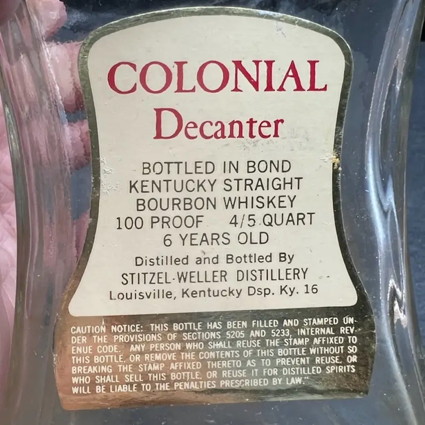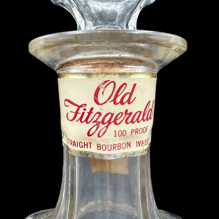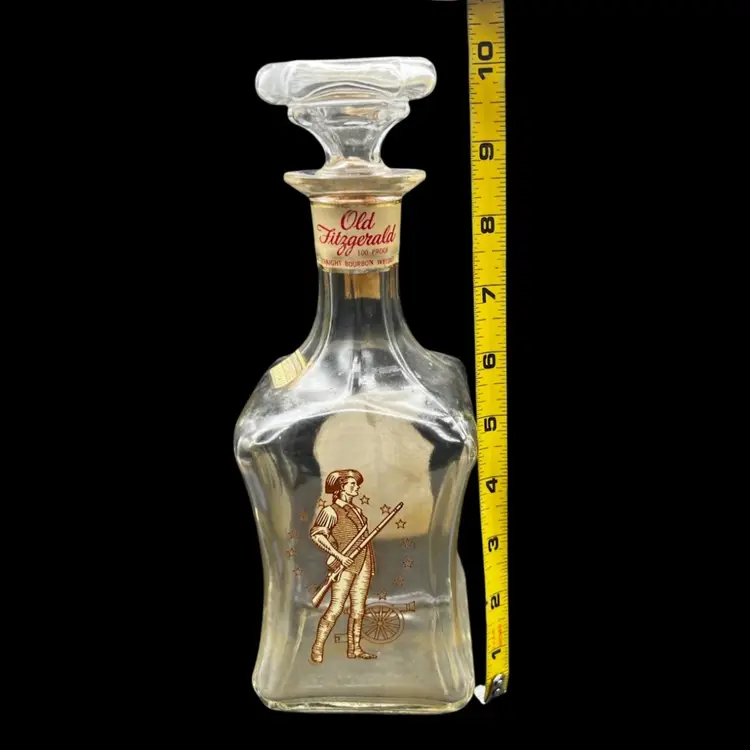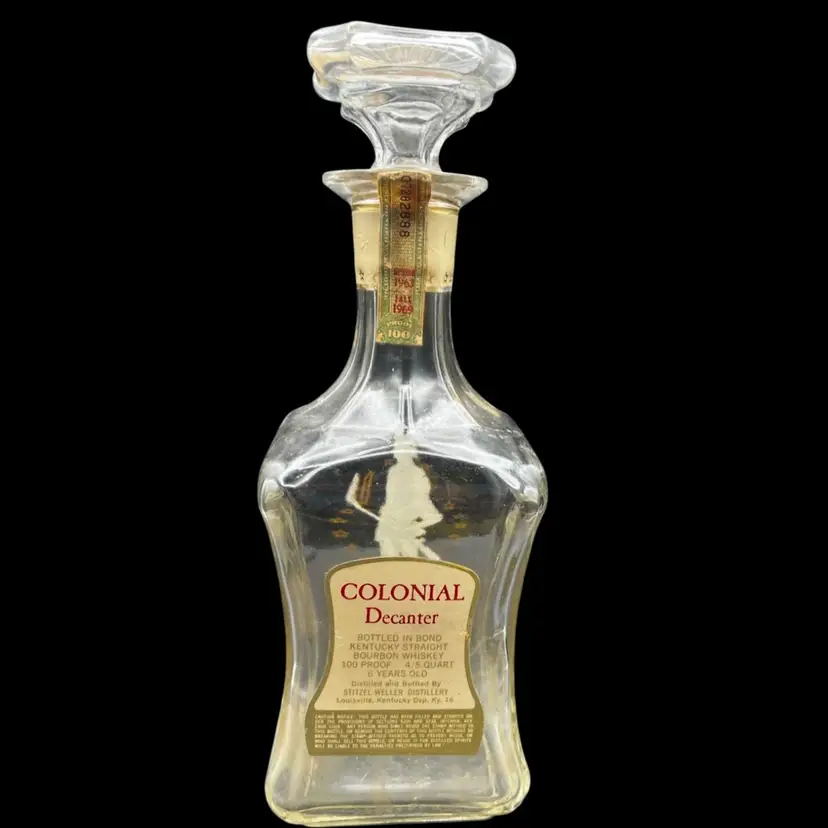 Vintage Old Fitzgerald Collection Colonial Decanter Liquor Bottle 100 Proof Straight Bourbon Whiskey. Bottled In Bond KY 1963 Sold 1969. Several Original Tags Still Attached. Bottled In Bond is in excellent condition, no chips or cracks. Cork around lid is dry and tearing. Date and tax labels still attached. Bottle does have residue inside. I did not want to risk losing the tags on the sides by cleaning. With stopper it stands 10” tall x 3” x3”