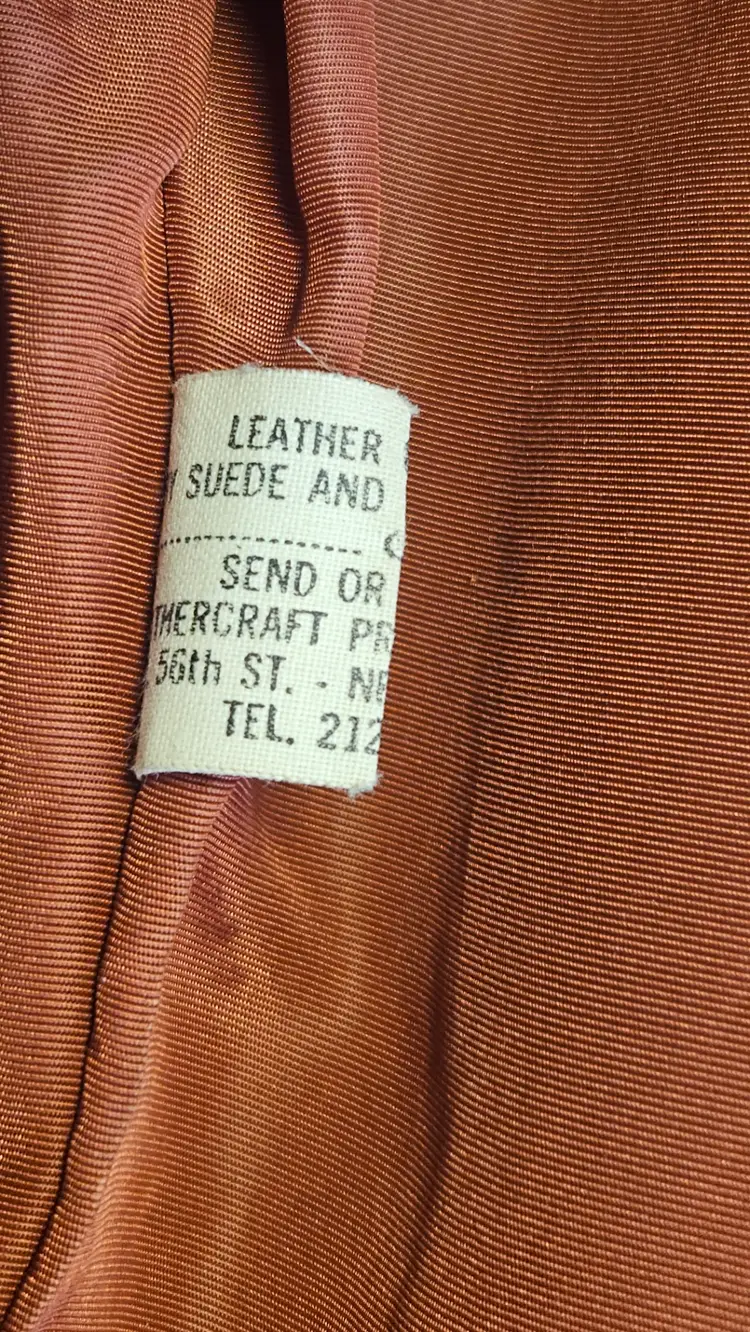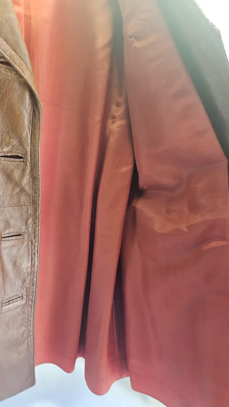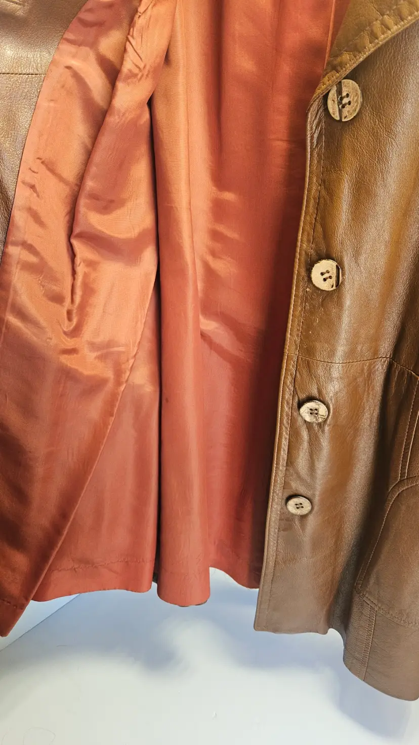 Vintage women’s 24K Glacé lamb leather coat by Dan Di Modes, brown color, single-breasted with buttons, lined interior. Genuine lamb leather exterior. Likely Made in USA. Condition varies by wear/age.