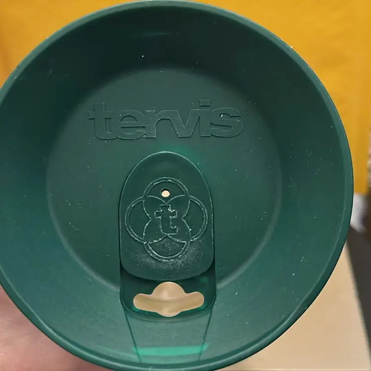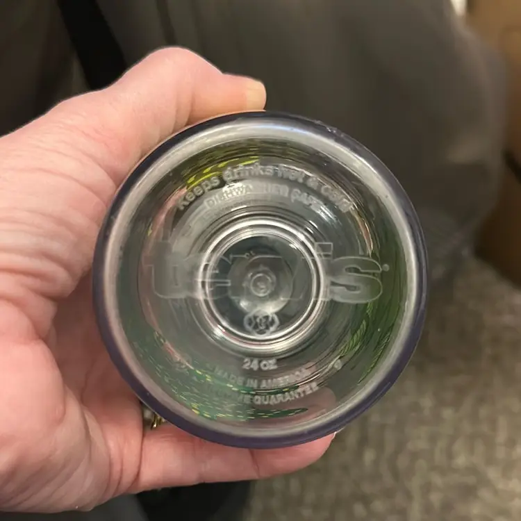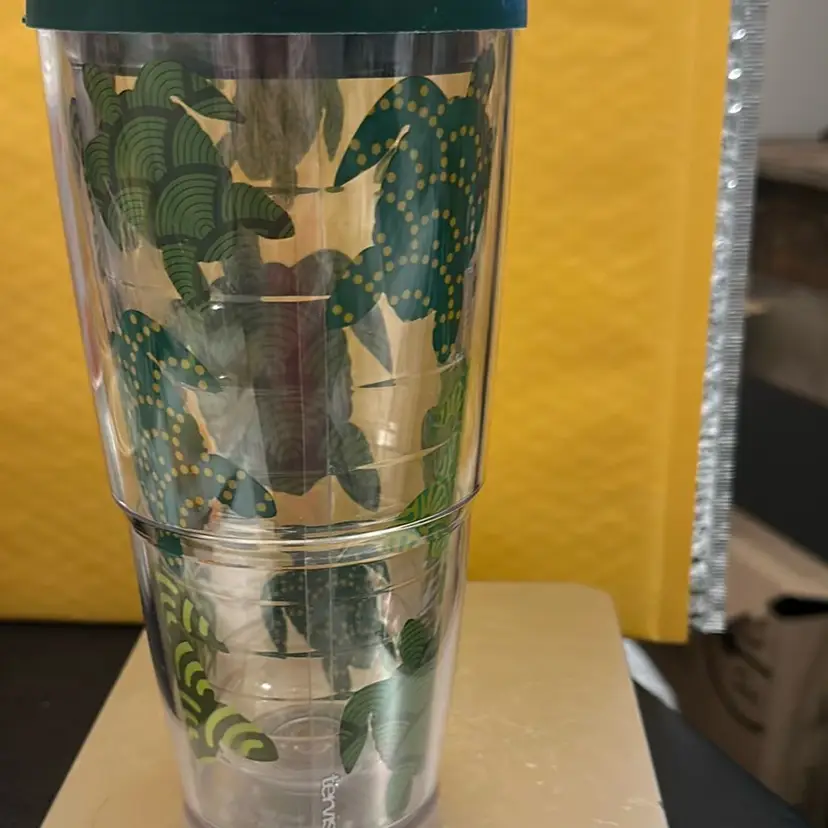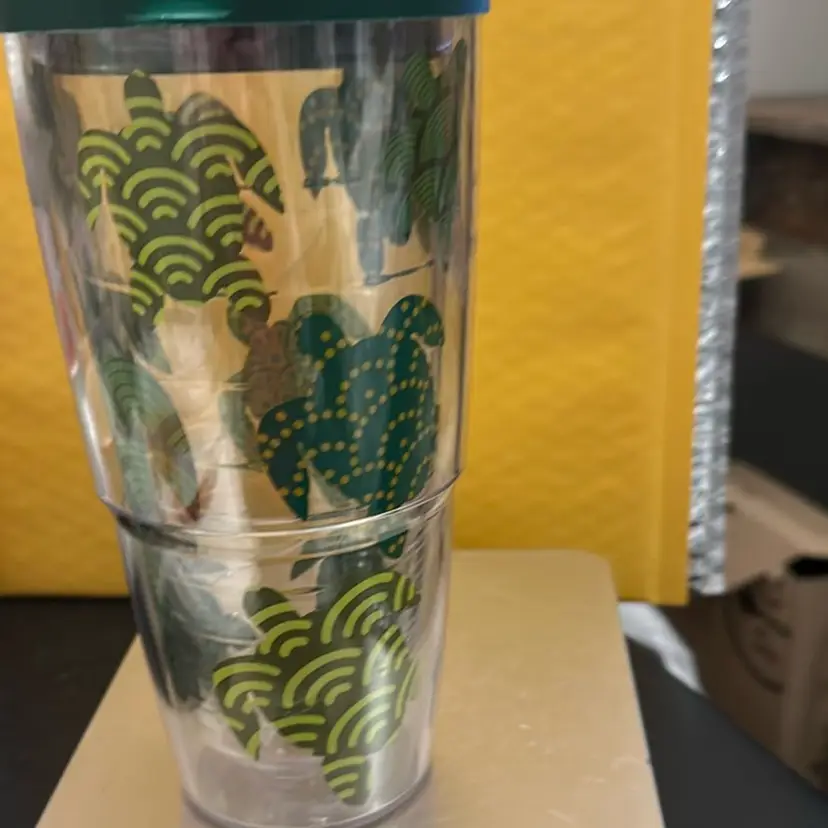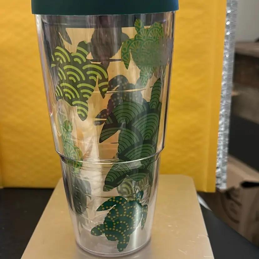 The sea turtles are plentiful on this tumbler. The multicolored cup has a green lid and the was made in America!