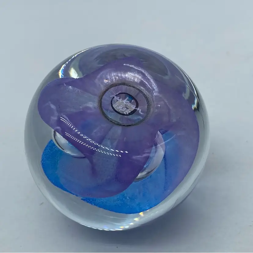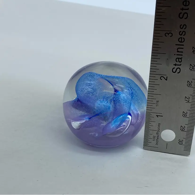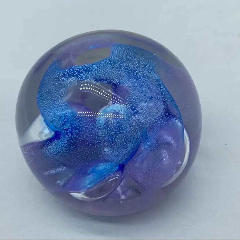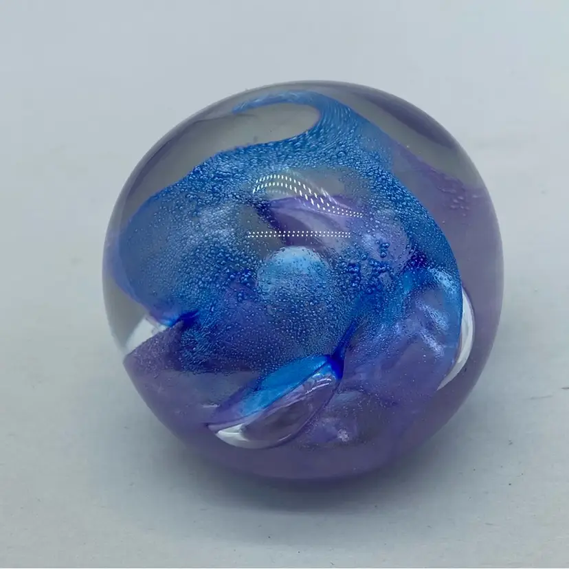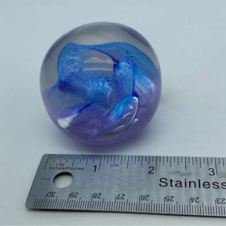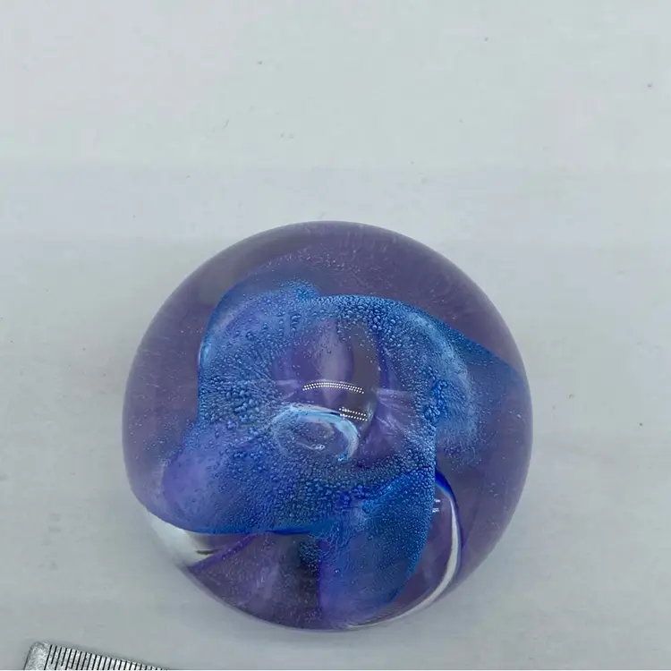 Approx 2 x 2 inch No chips or cracks Ron Lukian is a Canadian glass artist known for his studio art glass pieces, particularly paperweights. Working primarily in the late 20th century, Lukian's style often incorporates vibrant colors and controlled bubble techniques to create visually striking internal designs. His paperweights are typically signed and dated, adding to their collectibility.