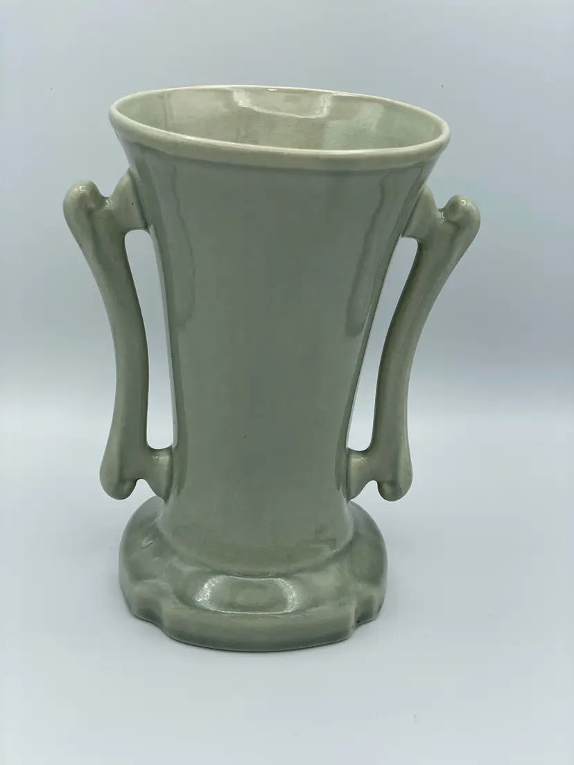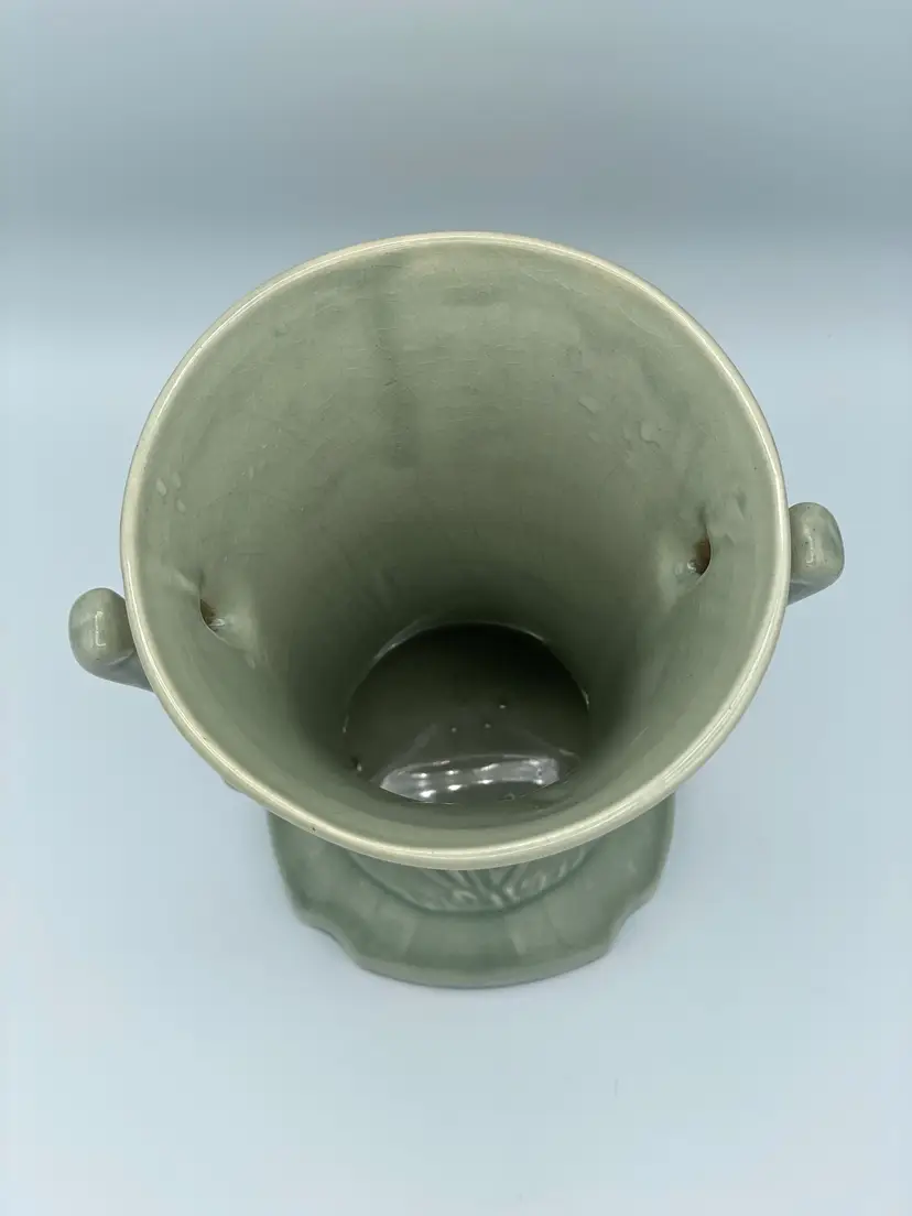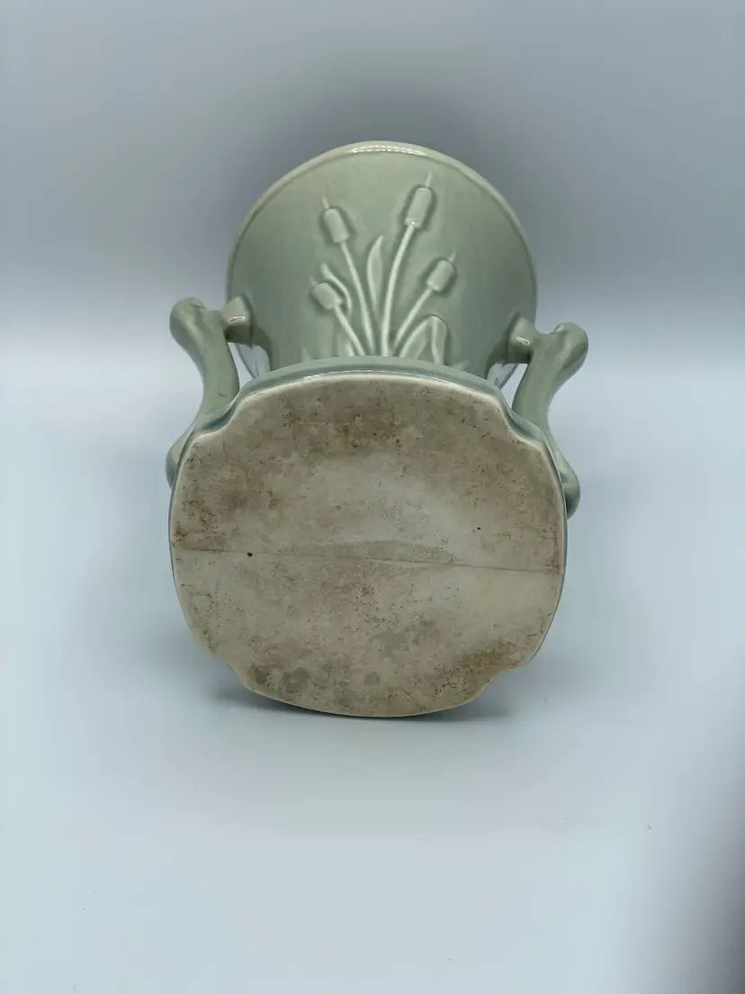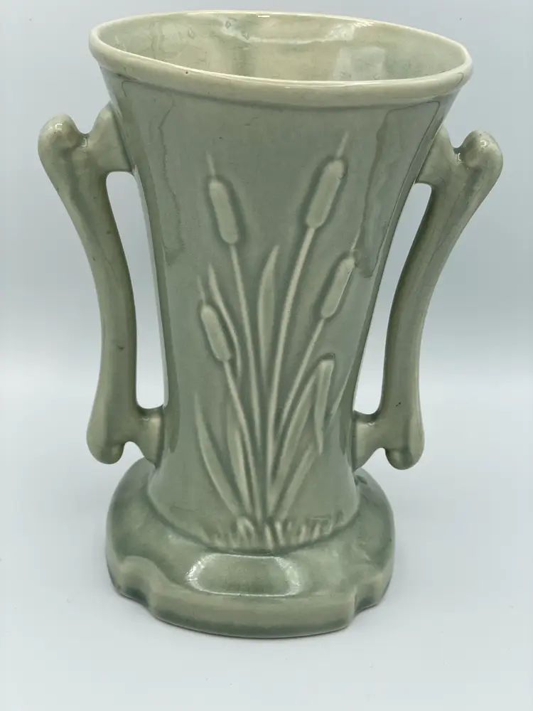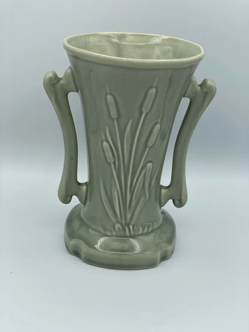 Vintage Cattail Double Handle Pottery Green Vase. Does Have Crazing Throughout. 1950-1959 Lovely Piece.