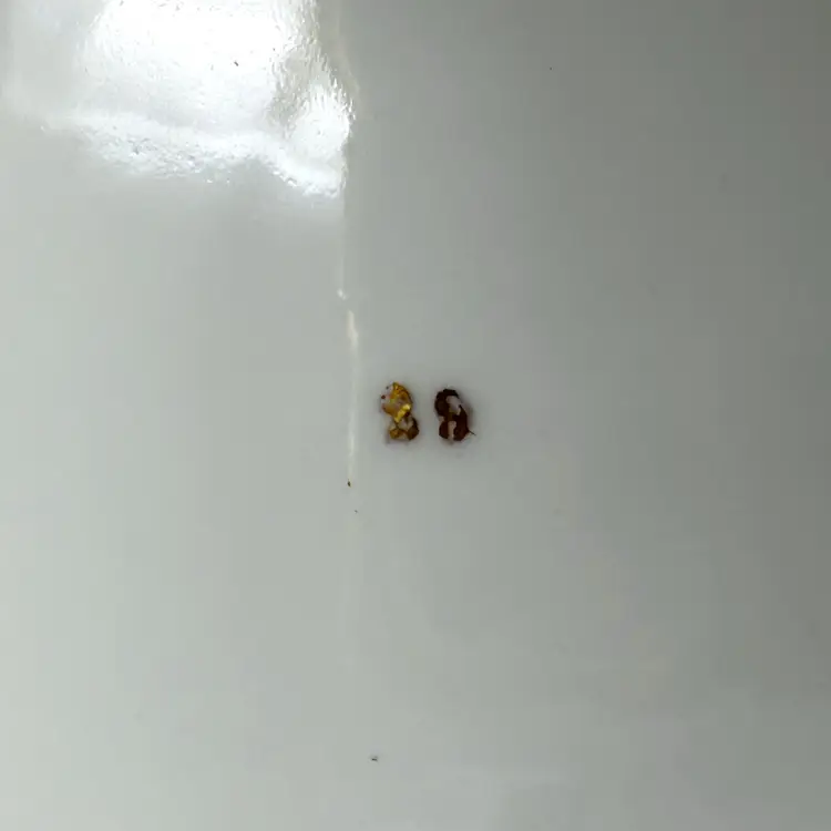 • Color: White base with pink/green floral transfer, gold trim. Bowl glows purple under UV light due to addition of manganese to the porcelain.