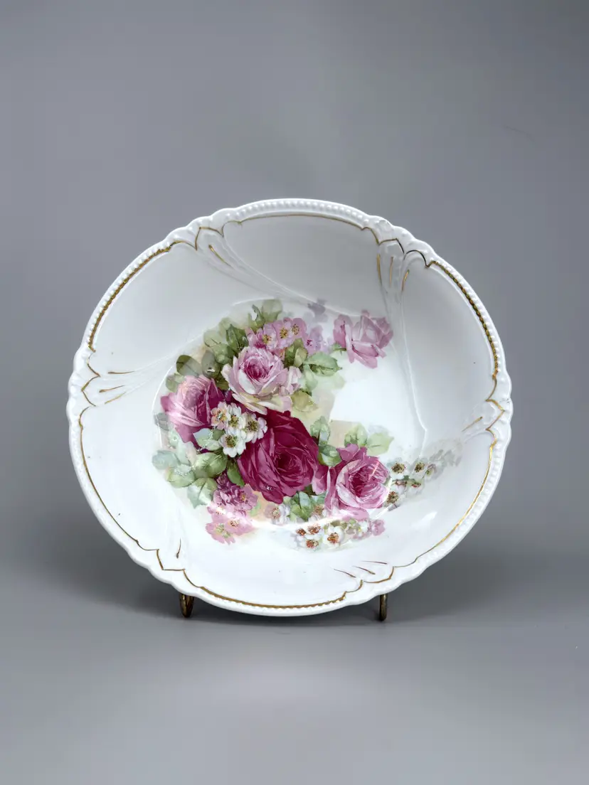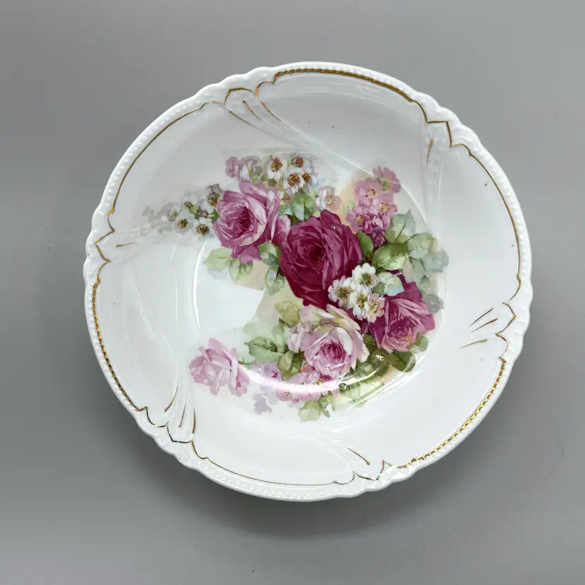 Delicate vintage porcelain bowl with pink rose bouquet and gold trim — timeless floral charm for elegant tabletops or thoughtful gifting.