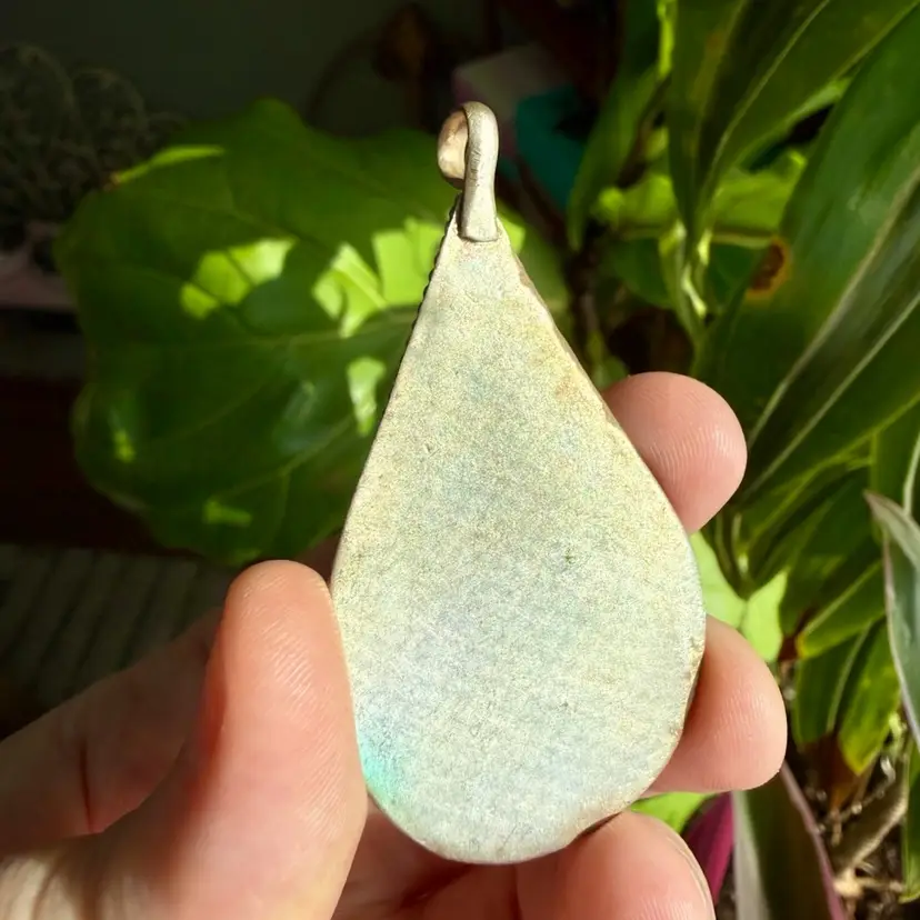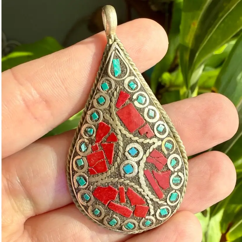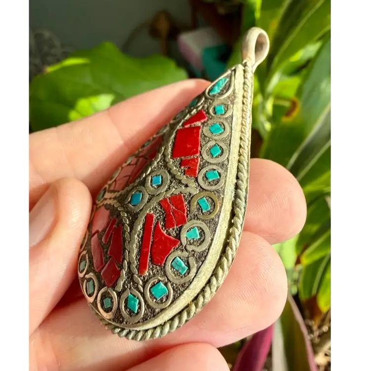 1.25"x2.5". Beautiful Tibetan teardrop shaped pendant, with Turqoise and coral stone inlay. The border of the teardrop has a rope/twist detail. No markings or signatures are on the piece. The metal has some slight oxidation/tarnishing. Not sure of the exact age.