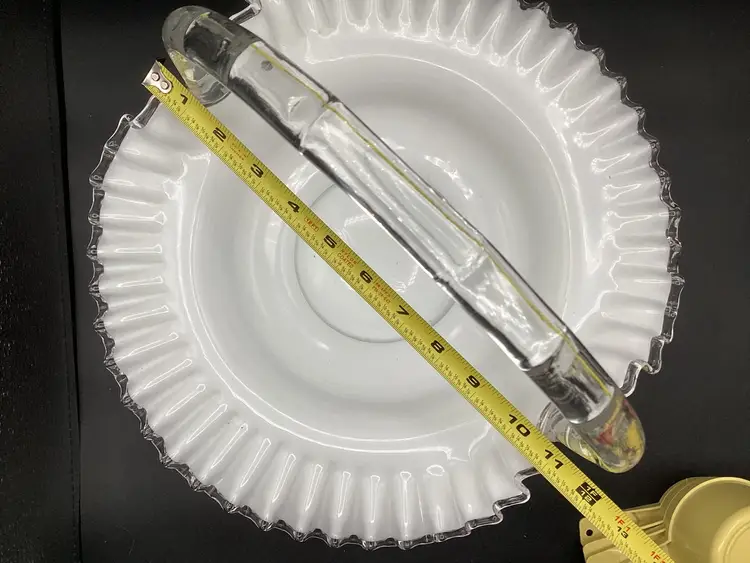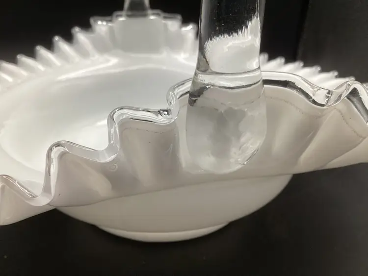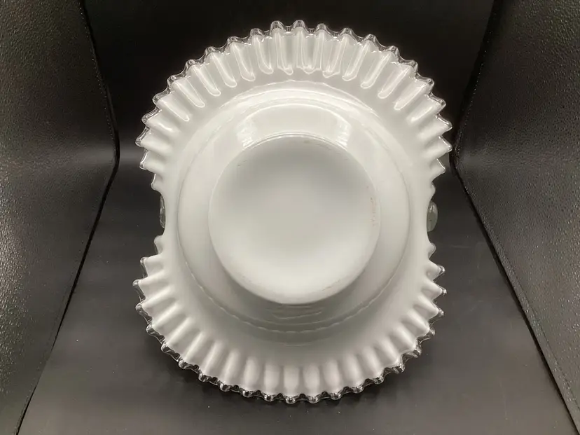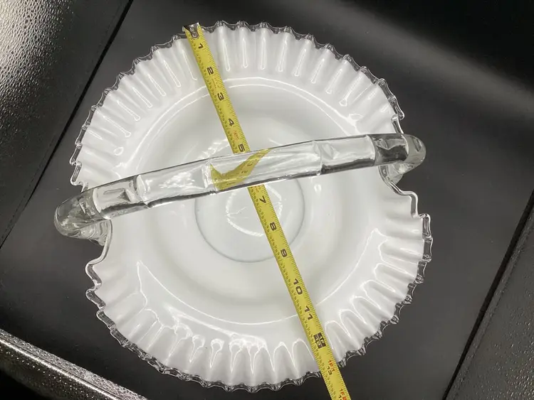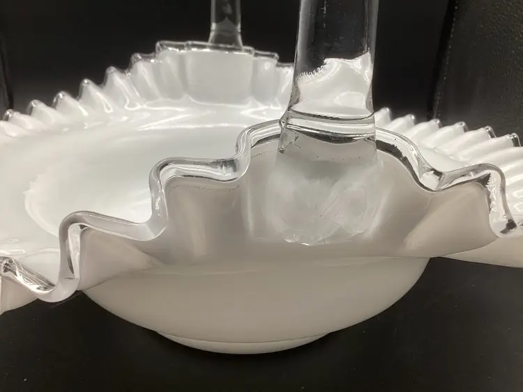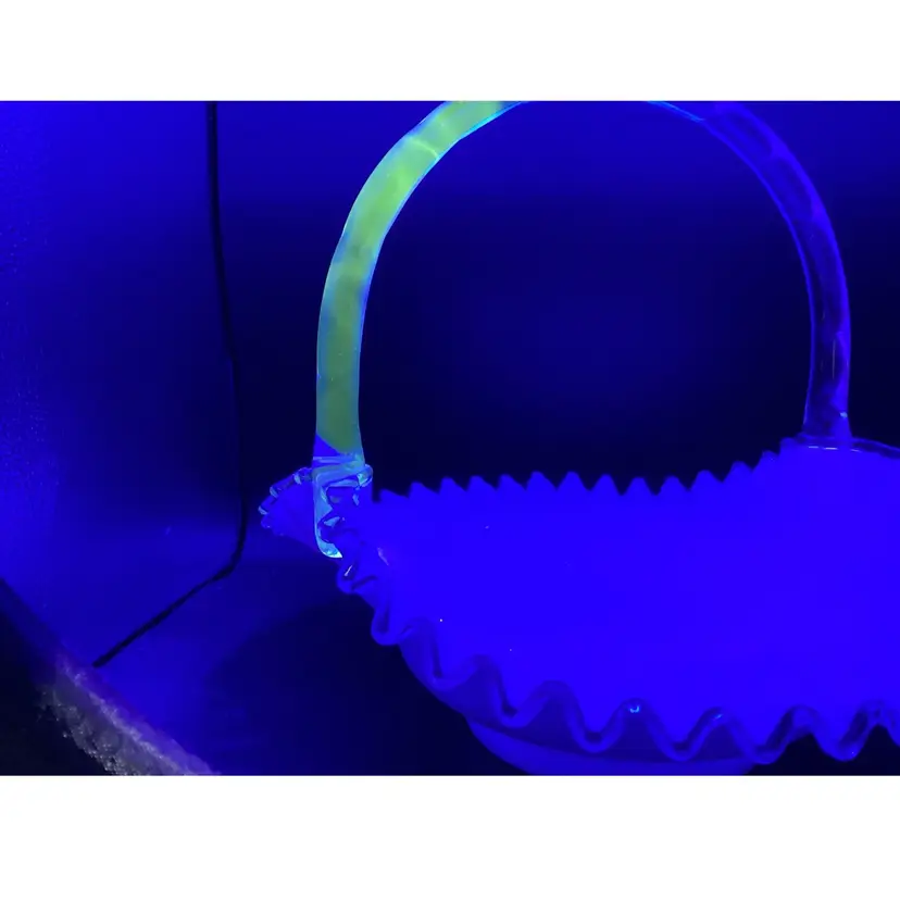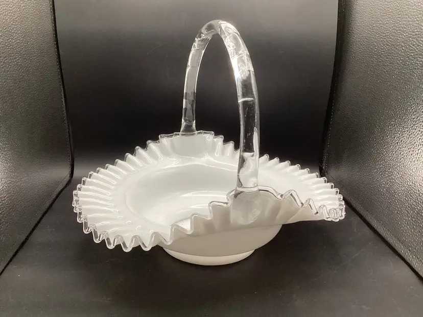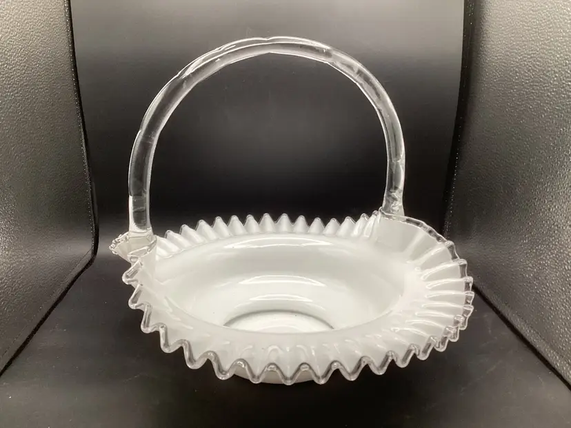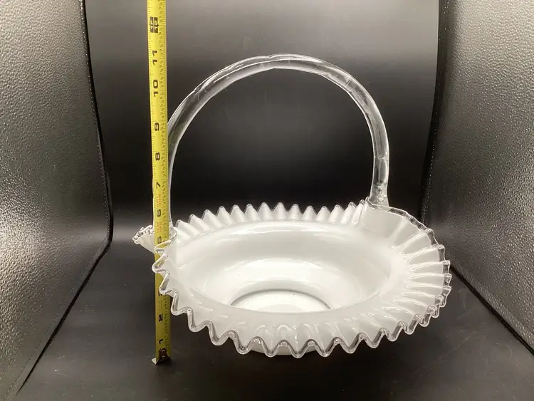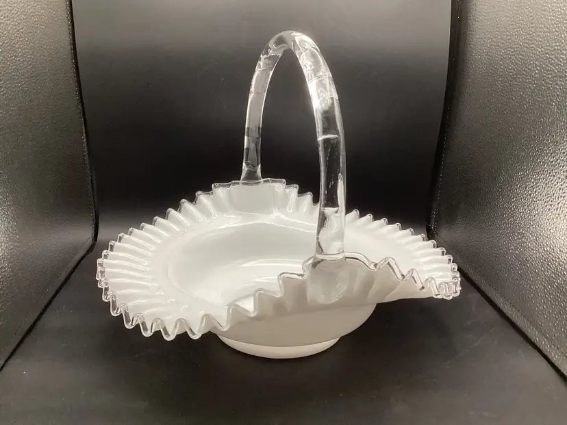 Huge Fenton silver crest basket. No condition issues noted. Handles well attached. The clear glass on the piece does glow.