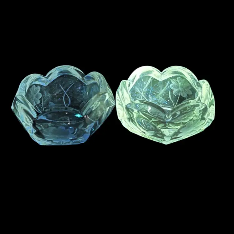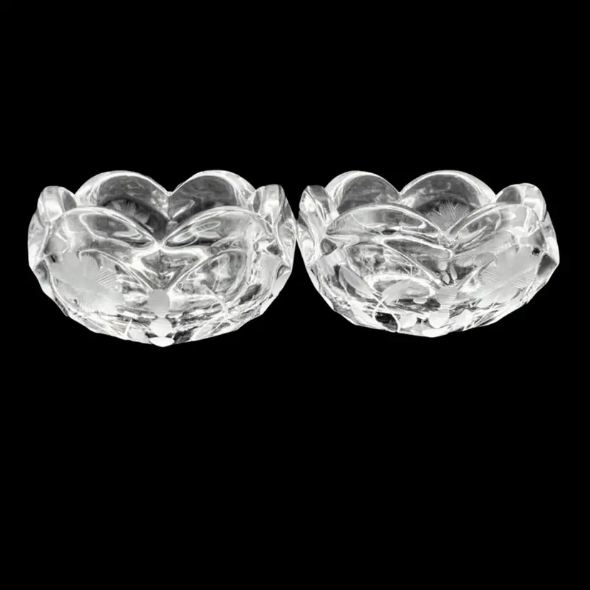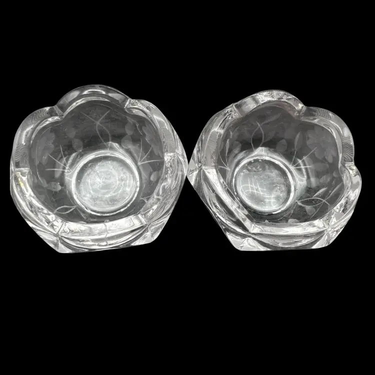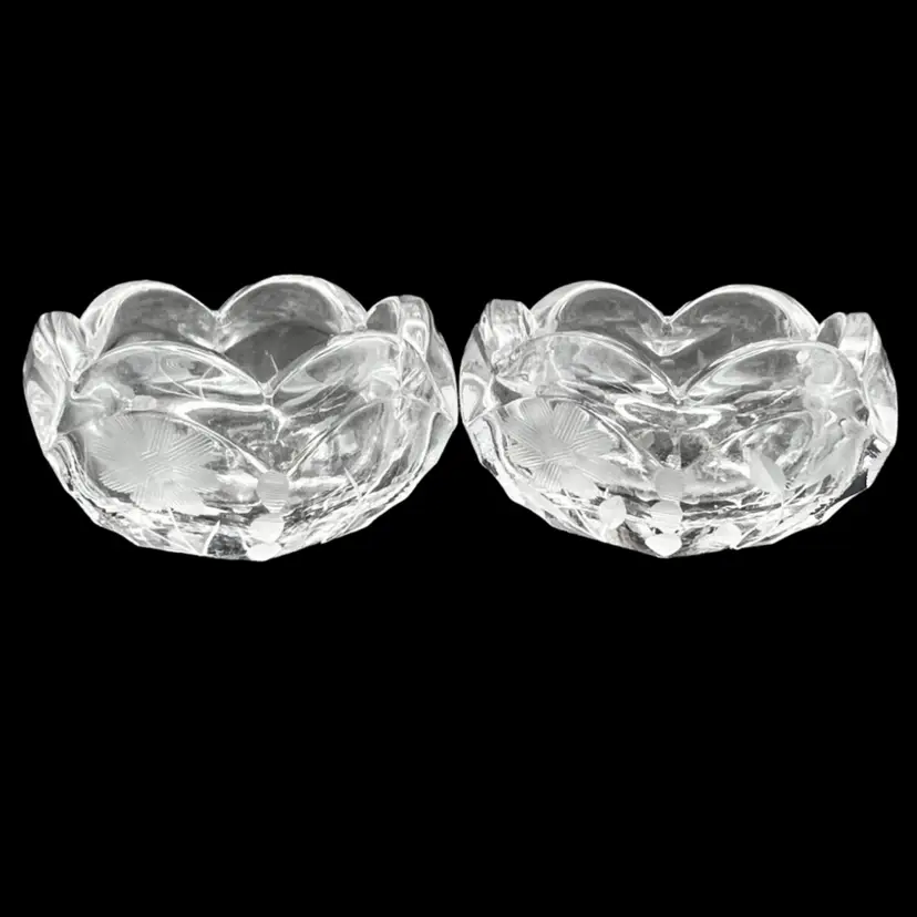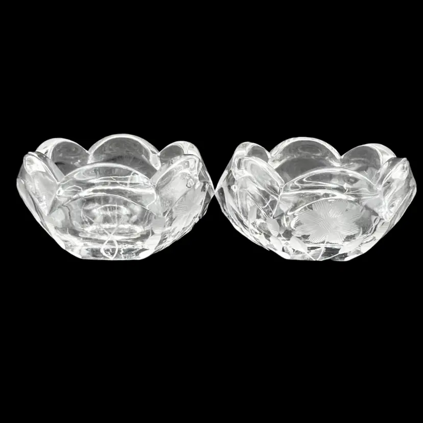 Vintage Pair Of Beautiful Etched Glass Salt Cellars With Scalloped Rim - UV Glow! Both are in very good condition. No chips or cracks, very light surface scratching on bottom Stand 1” tall x 2” in diameter