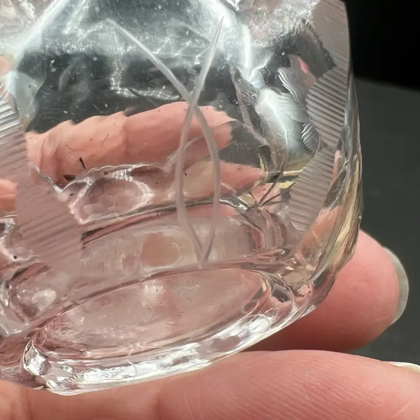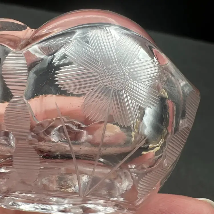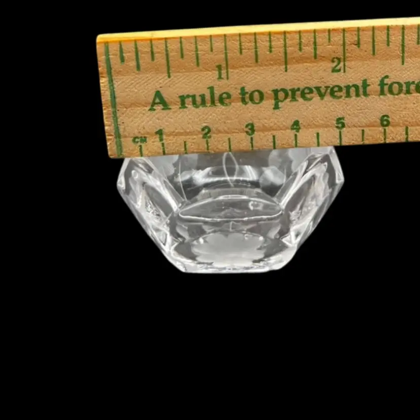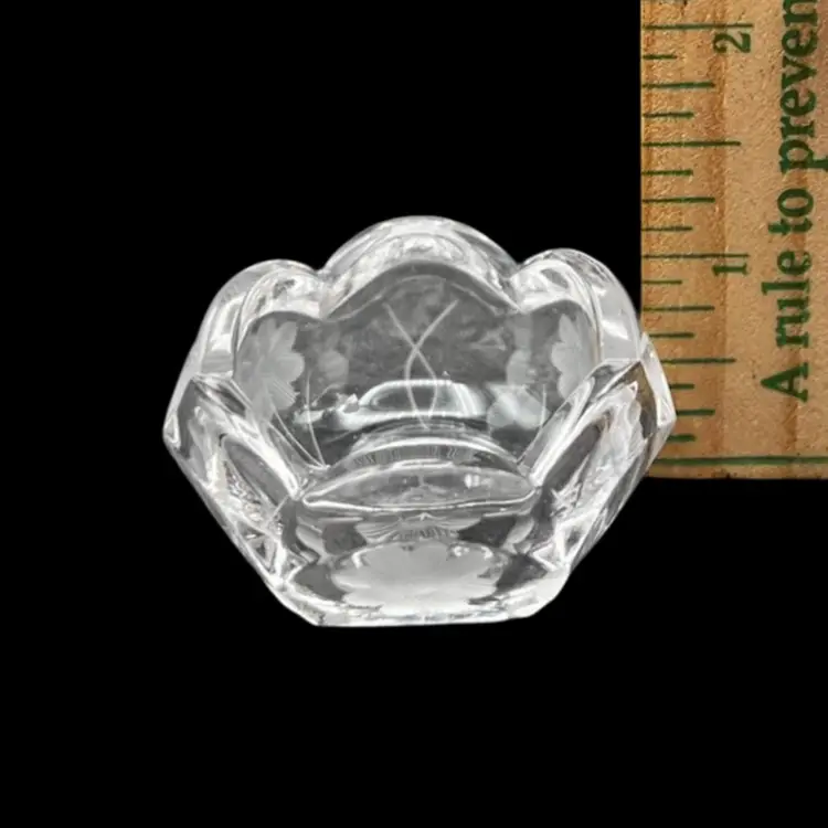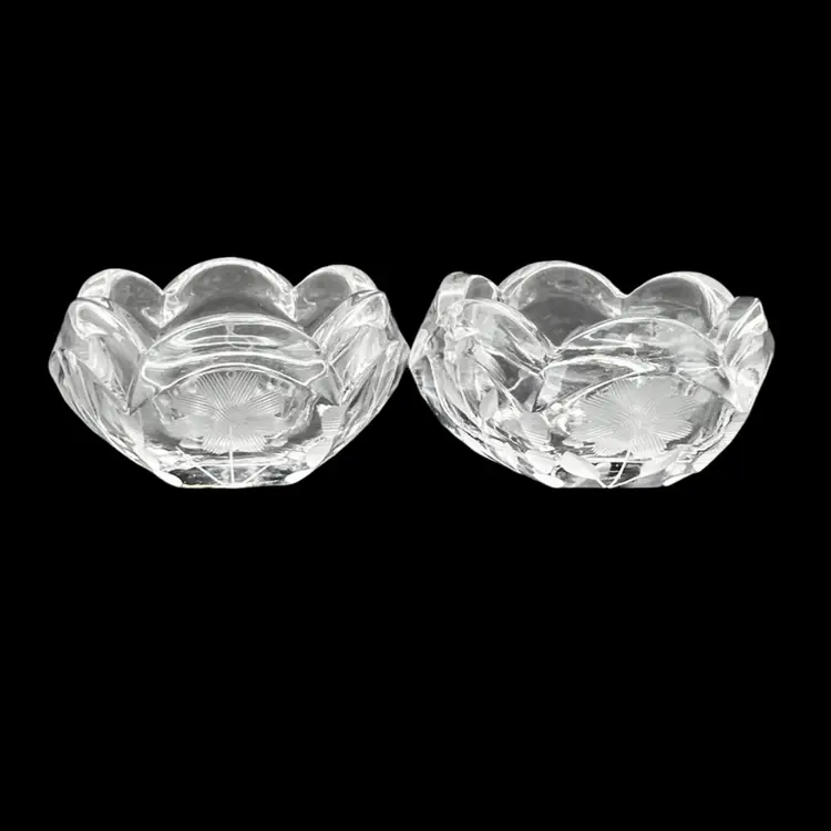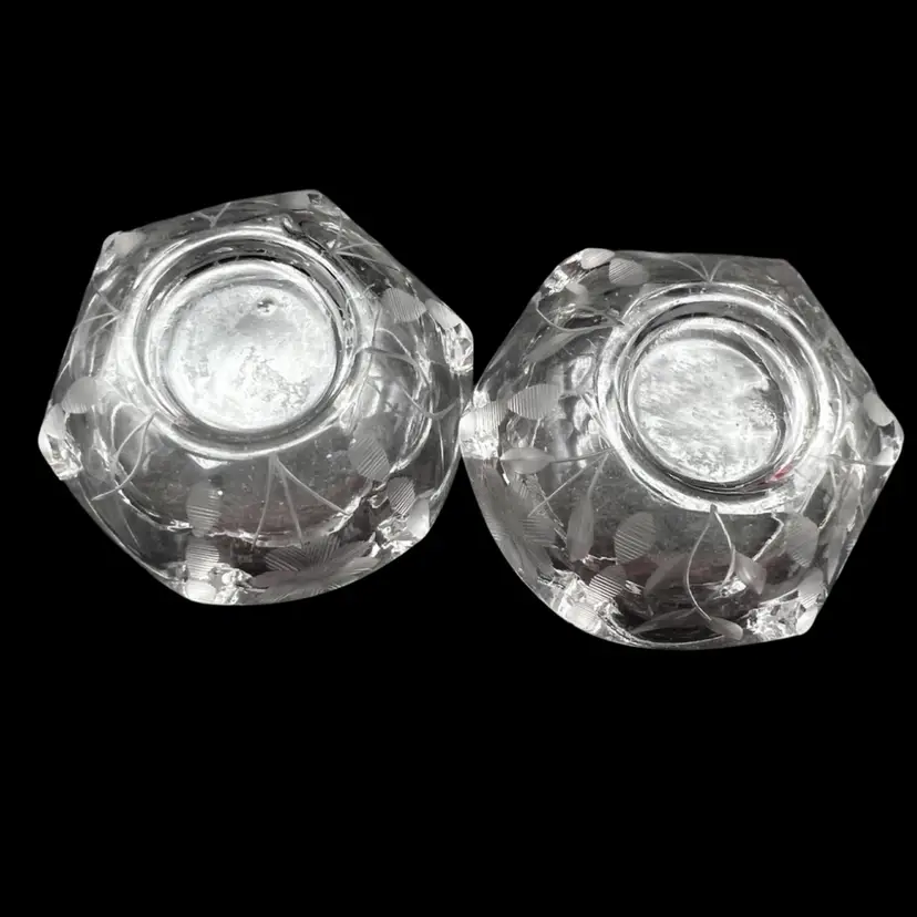 Vintage Pair Of Beautiful Etched Glass Salt Cellars With Scalloped Rim - UV Glow! Both are in very good condition. No chips or cracks, very light surface scratching on bottom Stand 1” tall x 2” in diameter