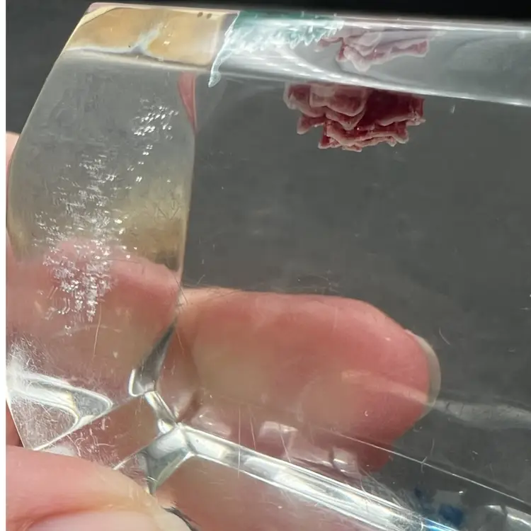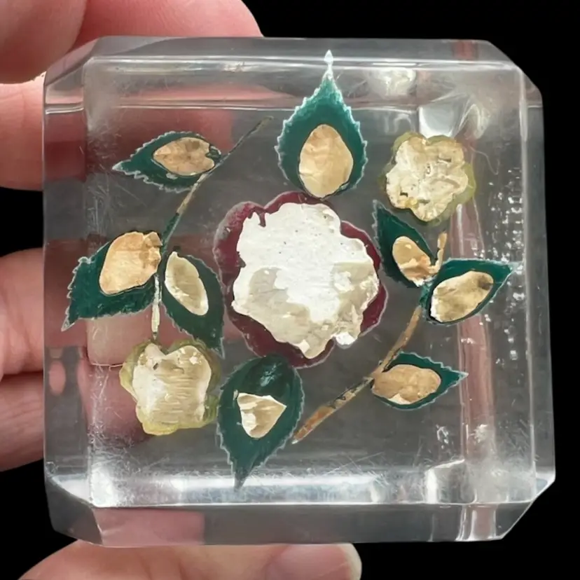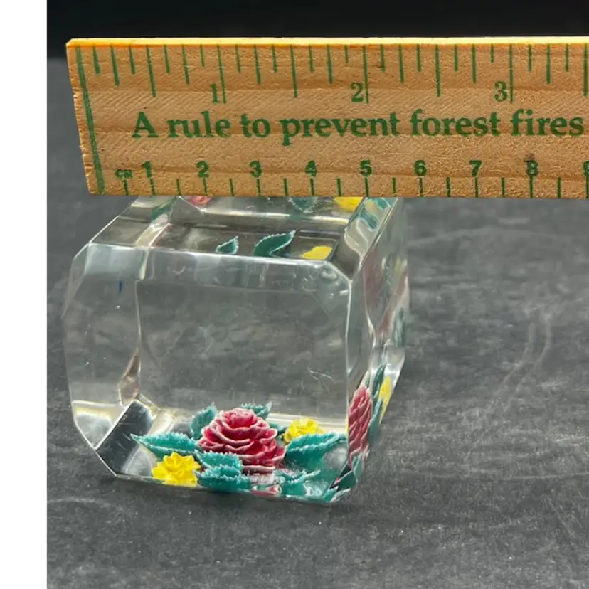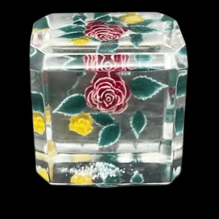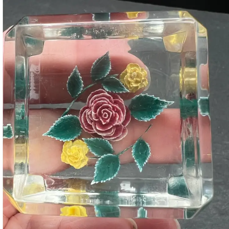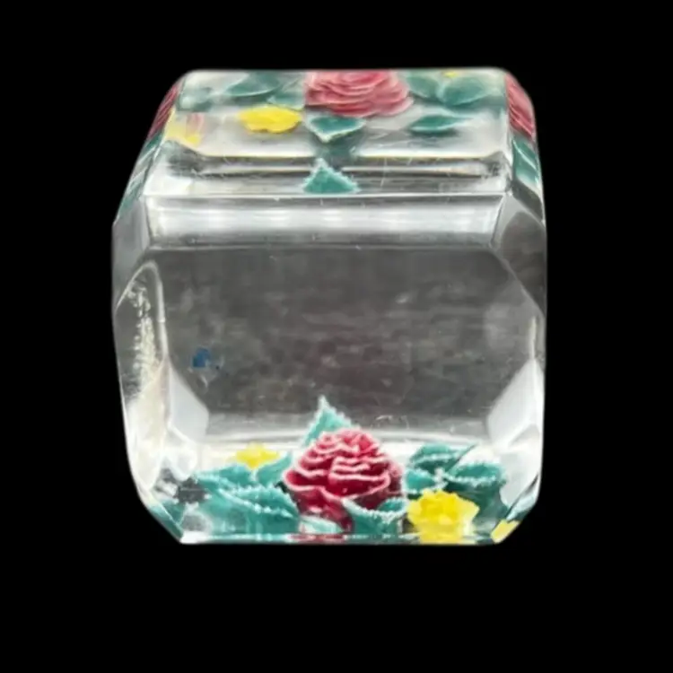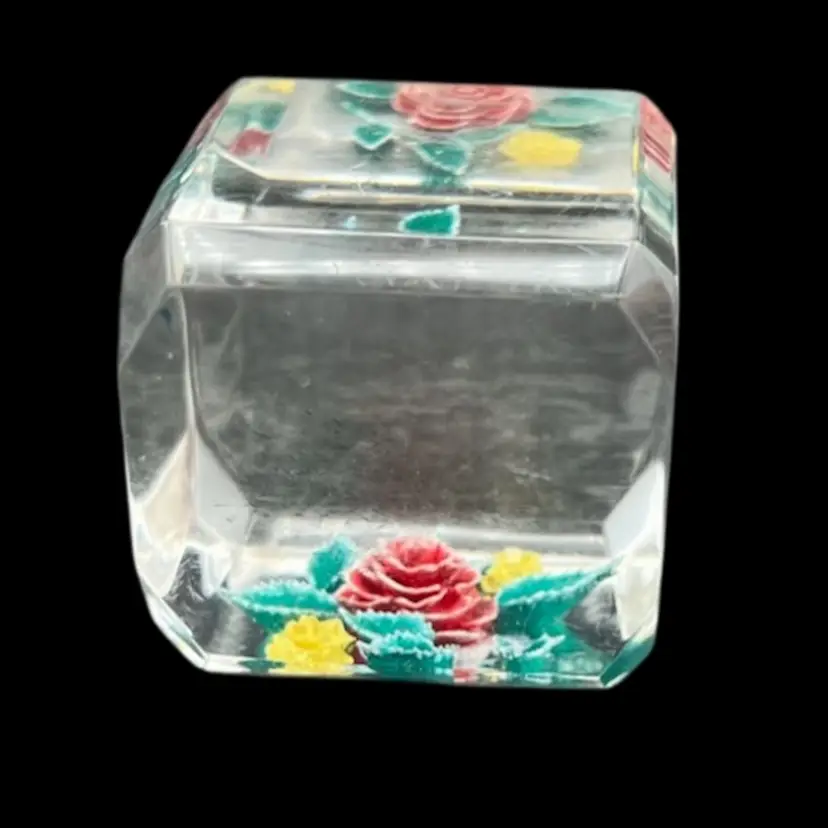 Vintage Bircraft Lucite Reverse Cut And Hand Colored Rose Cube Shape Paperweight In good vintage condition. No chips or cracks, but light surface scratches on two sides as noted in pictures. There is also a small blue mark on one side, 2” x 2” cubed