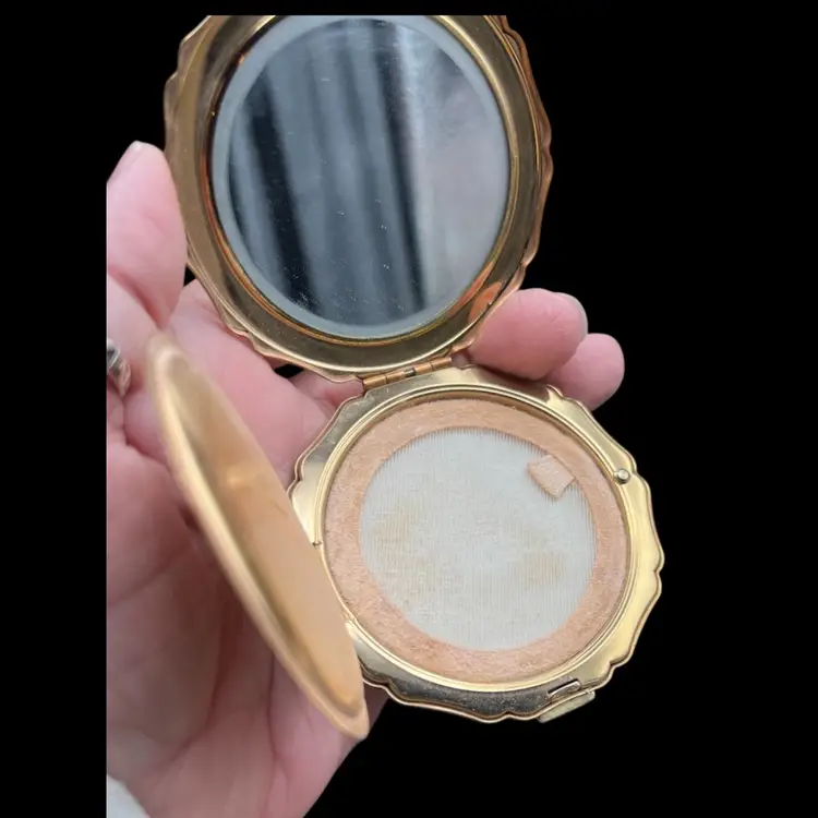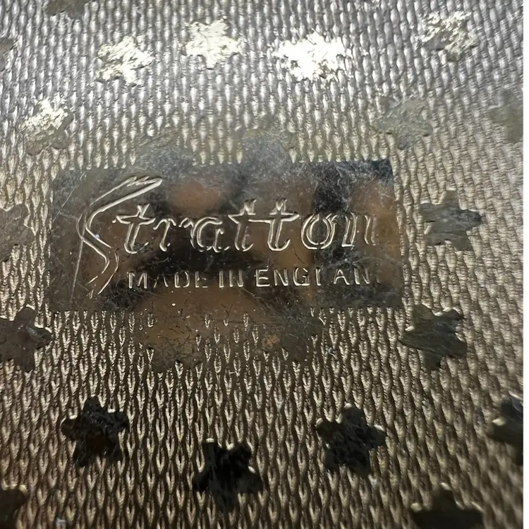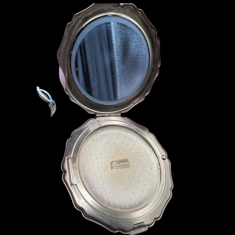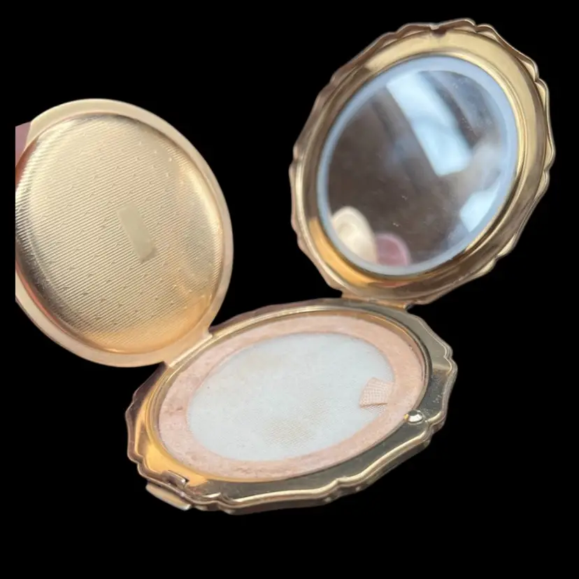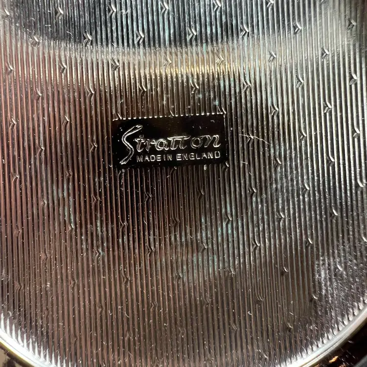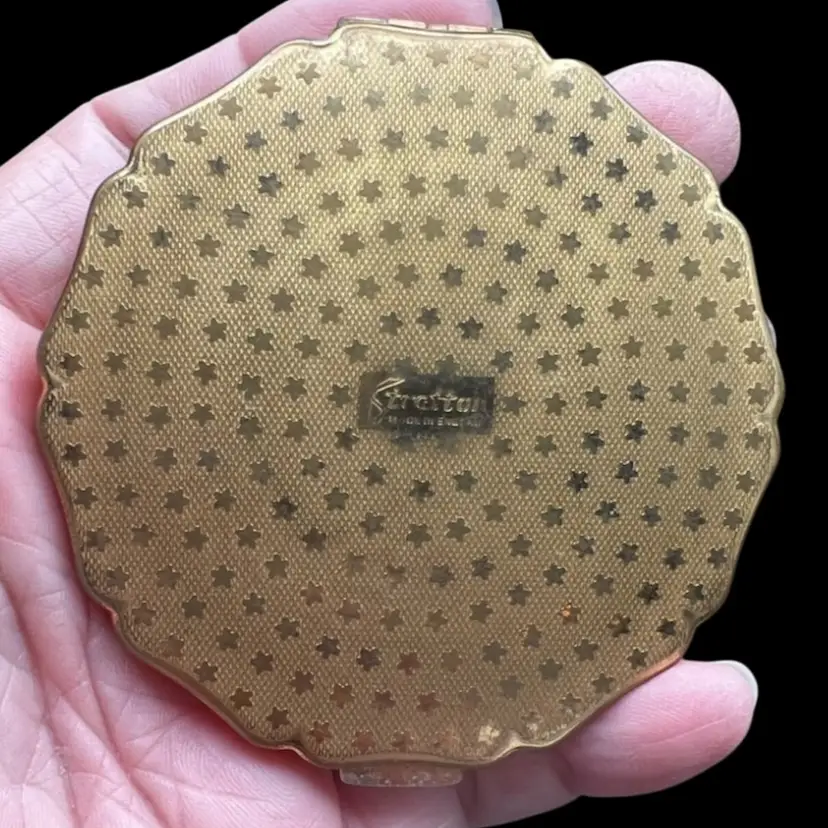 lVintage Stratton Powder Compact Art Deco/Art Nouveau Enamel Peacock Muse Lady With Harp Made In England In very good condition all closures functional. And the powder divider is still inside Measures just under 3” inches diameter