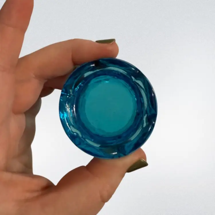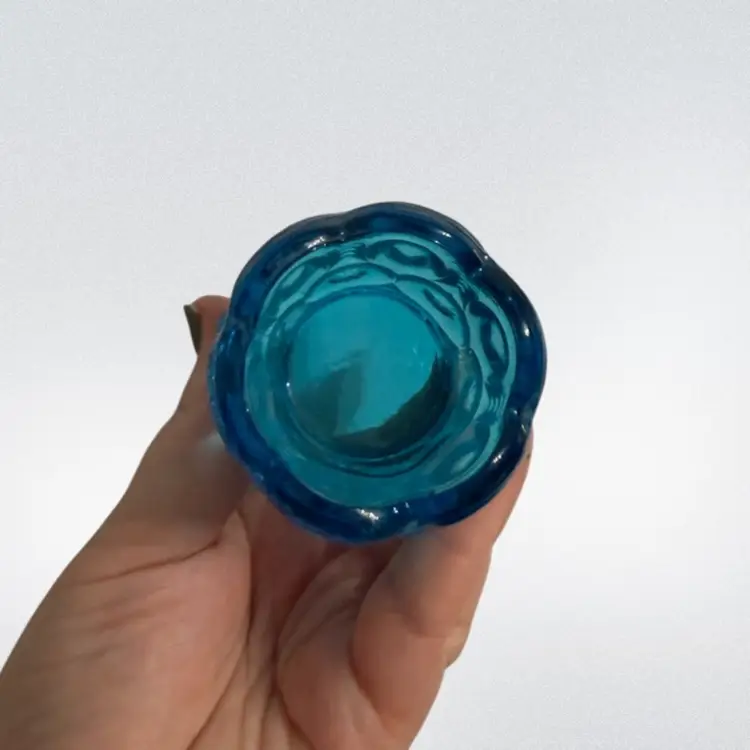 2.5 in tall LE Smith glass toothpick holder in the Moon and Star pattern. The color is called Peacock and is a gorgeous turquoise. The toothpick holder is in good vintage condition- no chips or cracks.