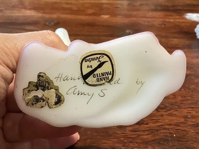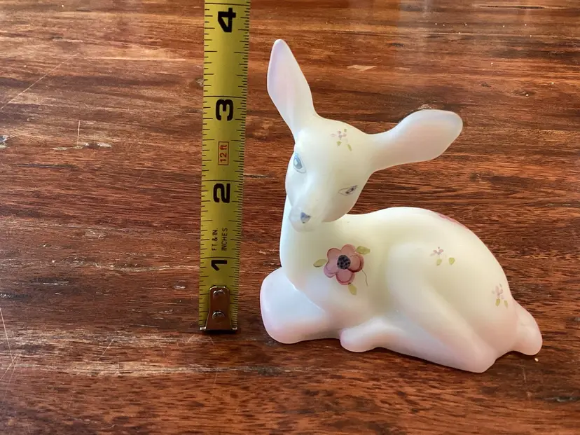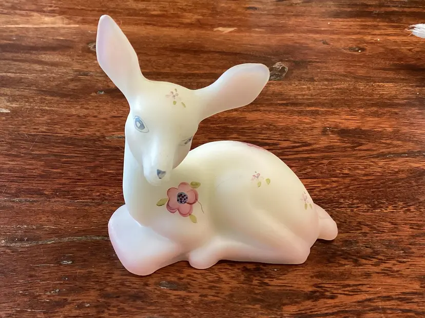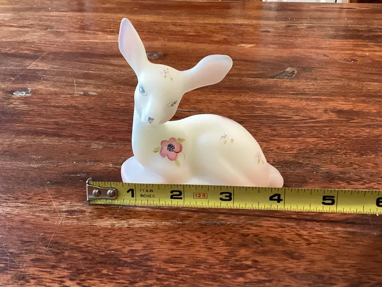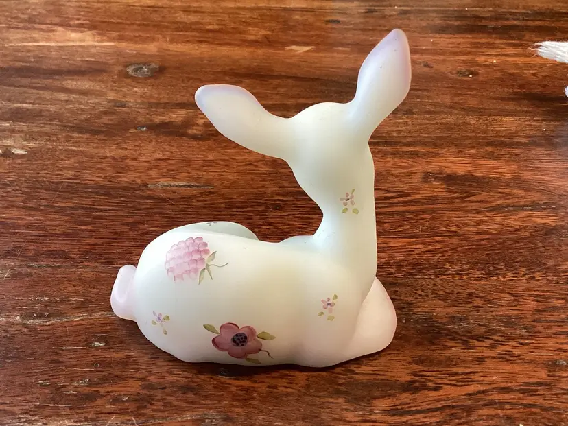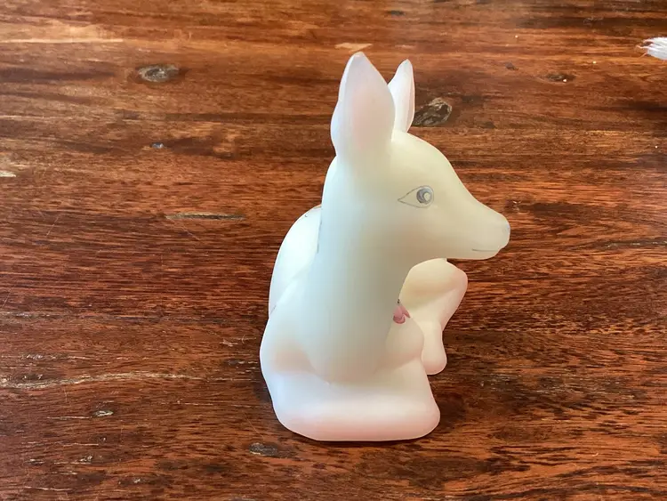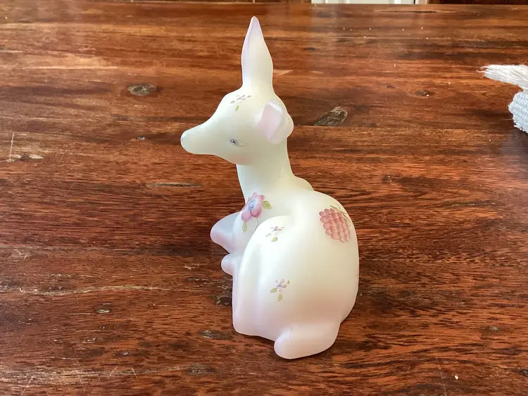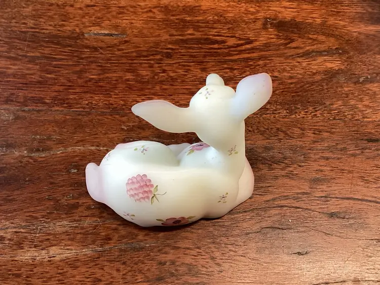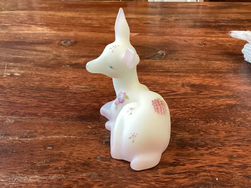 This little Fenton deer is made of satin glass white with pink highlights. It is hand painted with a beautiful floral and berry pattern. It is signed by Amy S. Original stickers are attached. No condition issues noted. The deer stands approximately 3 1/2 inches tallis approximately 4 inches long and 2 1/2 inches wide.
