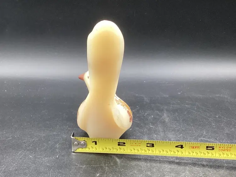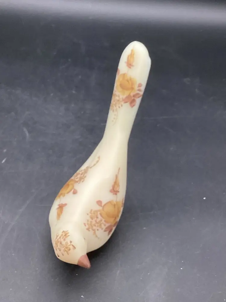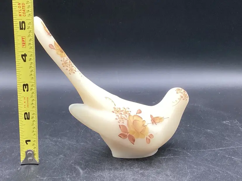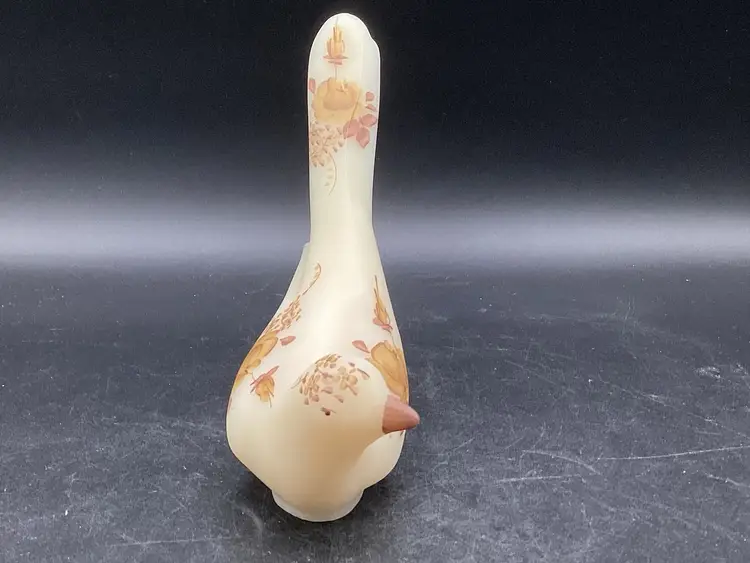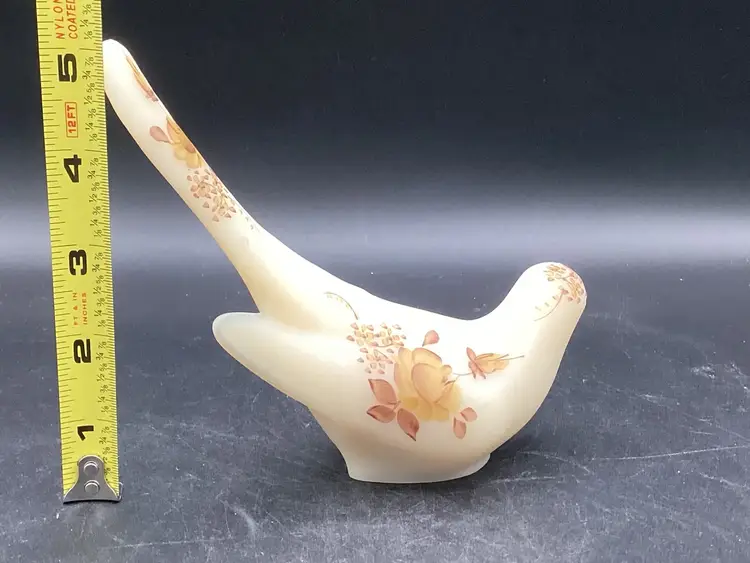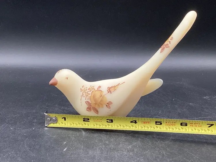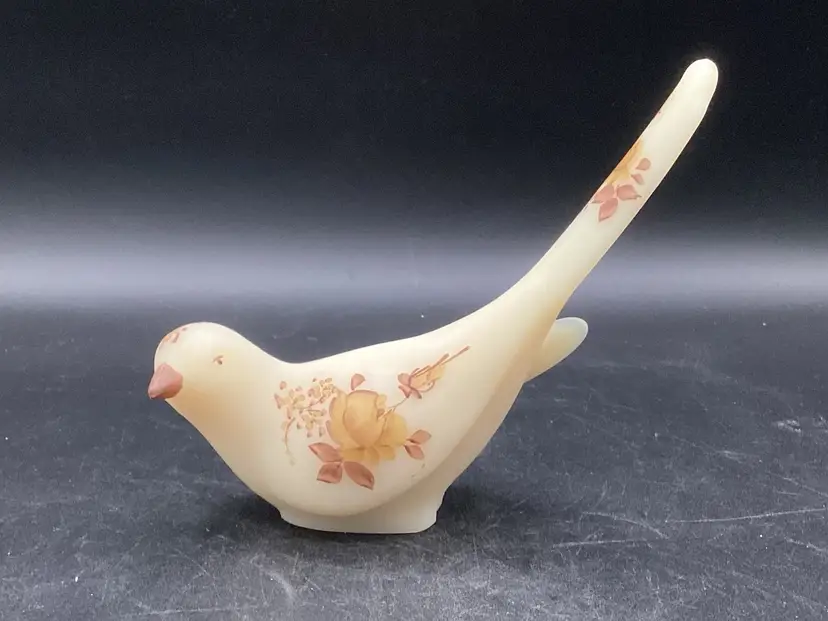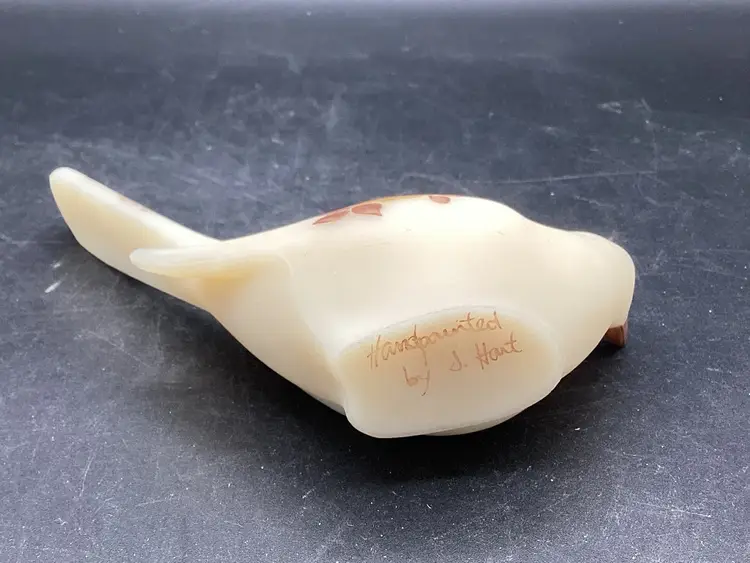 This Fenton bird was handpainted by J Hart. It’s a yellow beige with gold and brown painted florals. No condition issues noted. Does not glow.