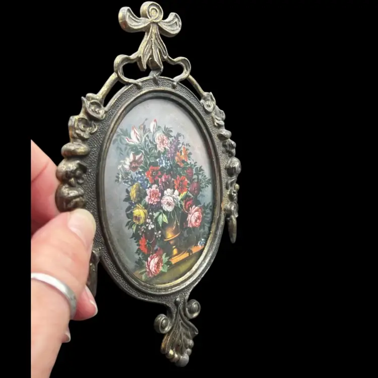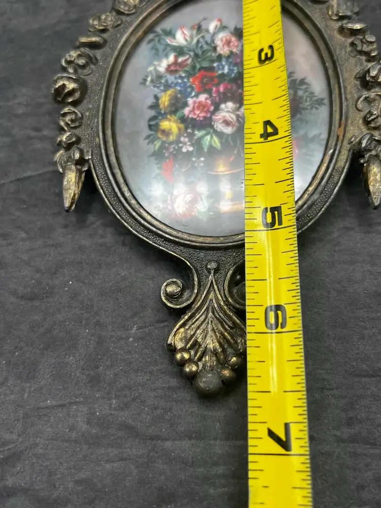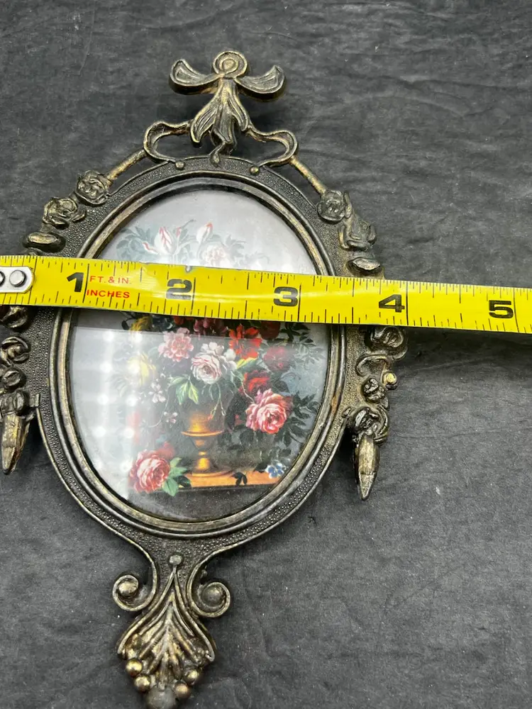 Vintage Ornate Metal Oval Picture Frame Made In Italy MCM Rococo Floral with Gray Background, Victorian Very good condition 6 1/2” x 4”