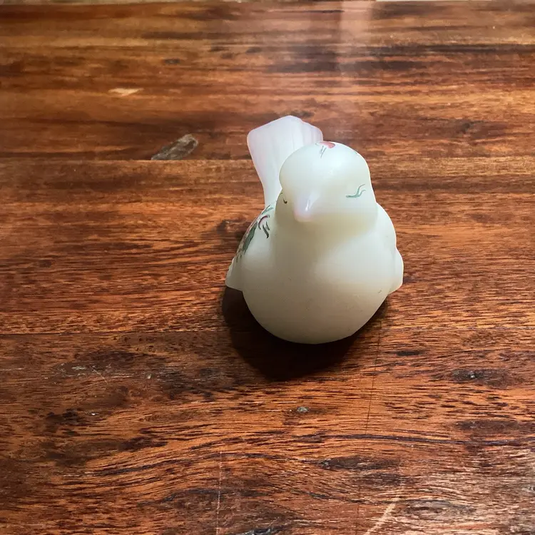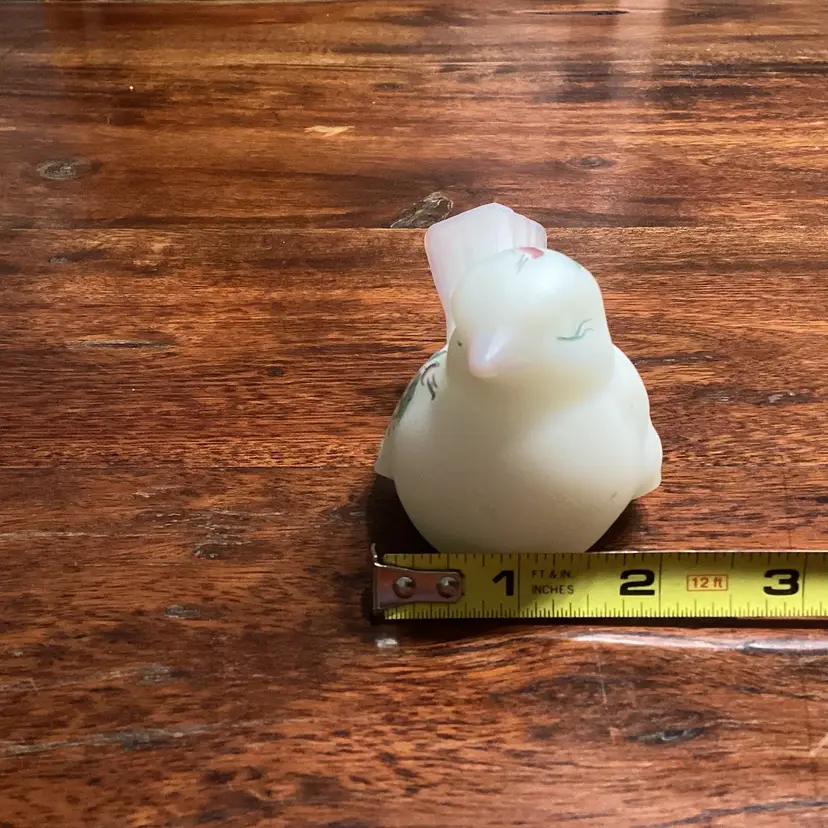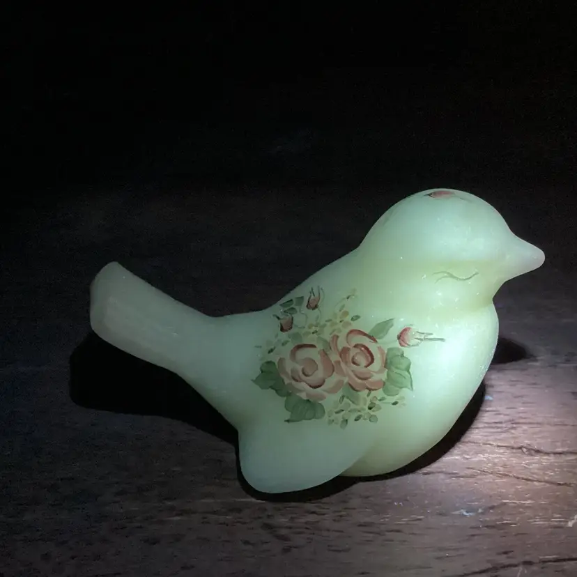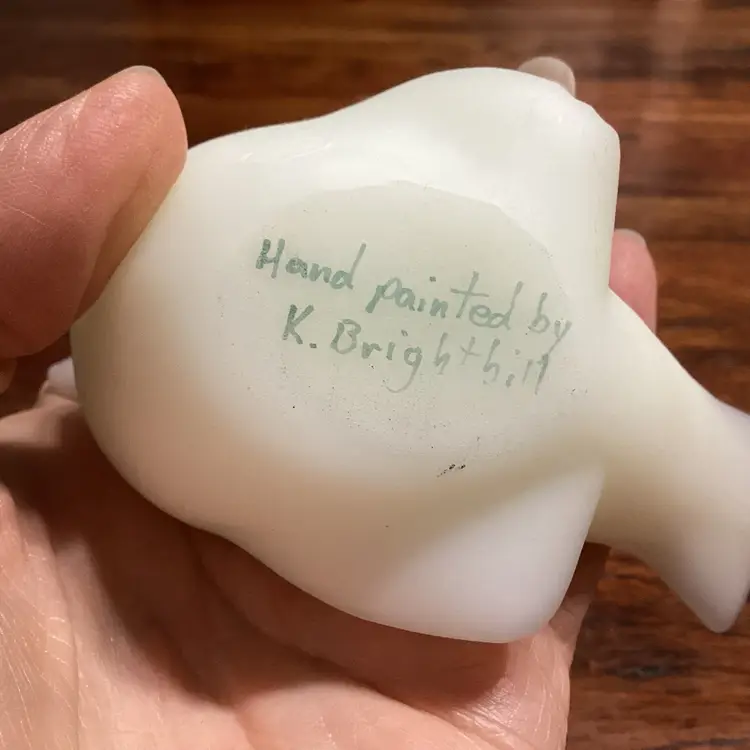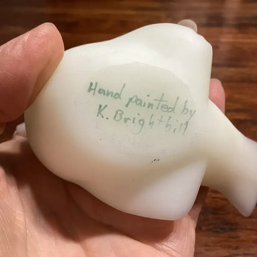 Hand painted satin glass white with pink beak, bird made by Fenton and signed by the artist K Brightbill. No condition issues noted. This does have a glow as shown in the last picture.