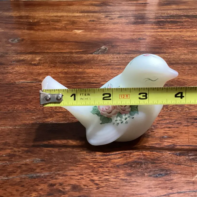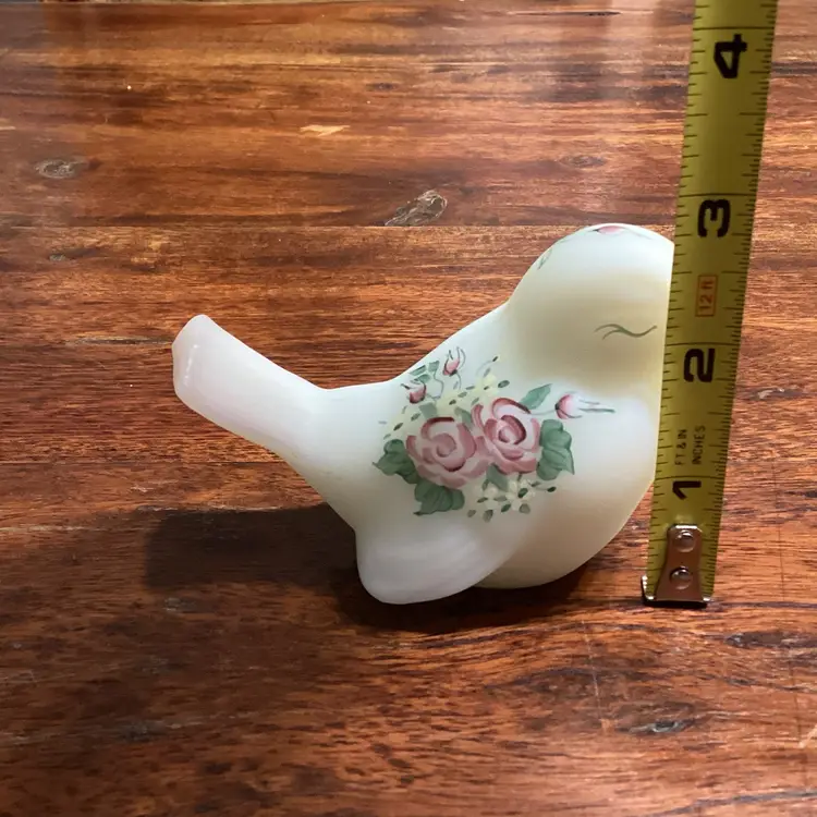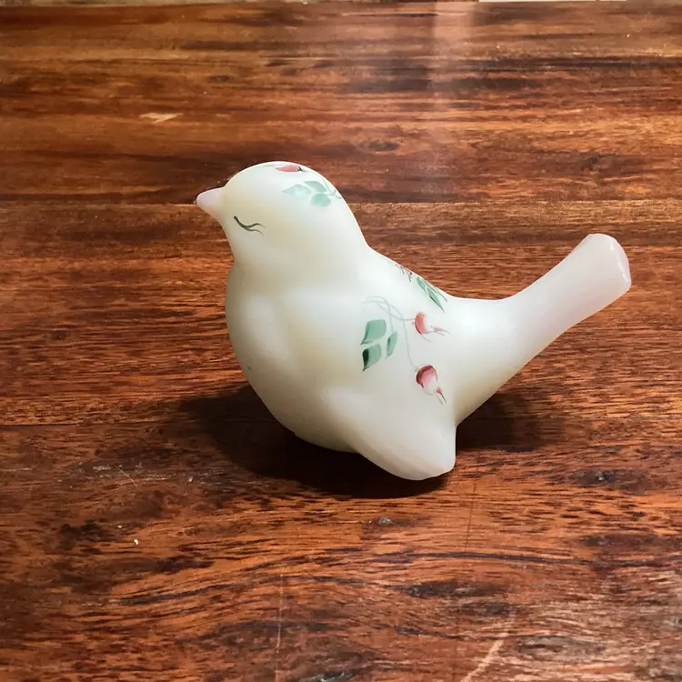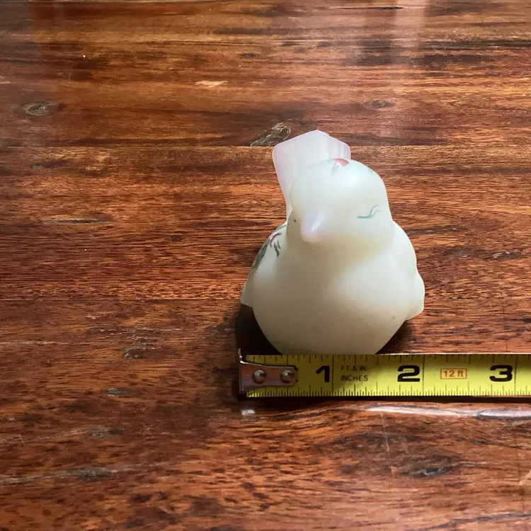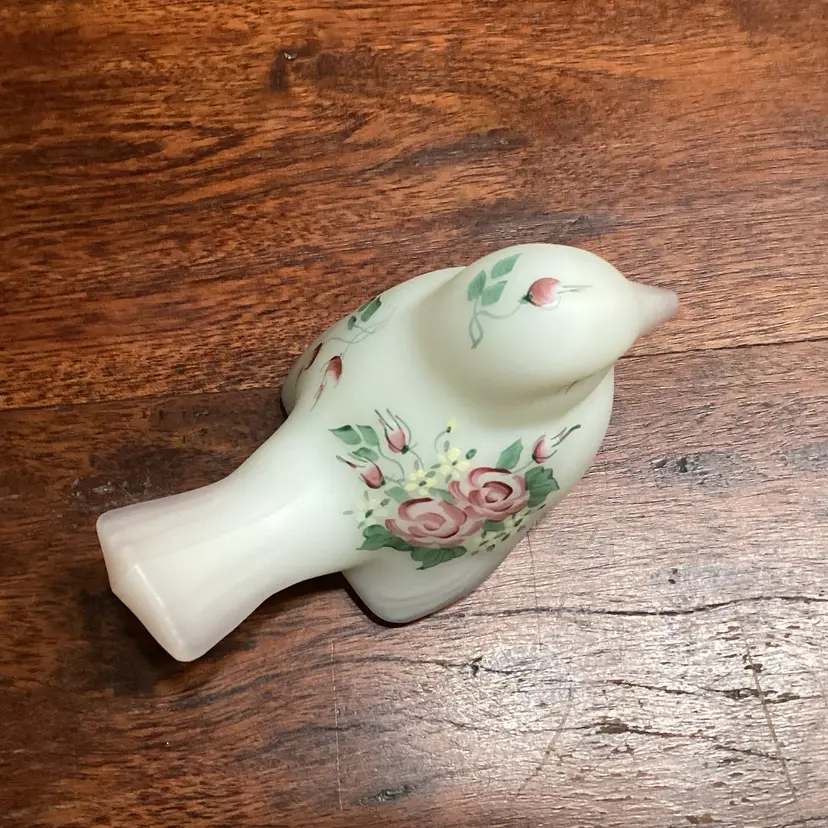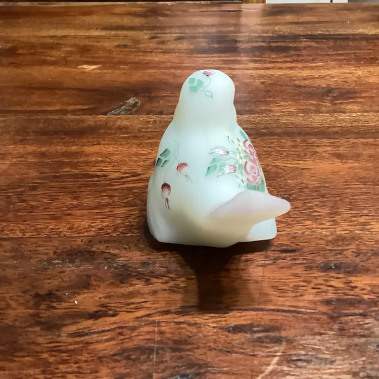 Hand painted satin glass white with pink beak, bird made by Fenton and signed by the artist K Brightbill. No condition issues noted. This does have a glow as shown in the last picture.