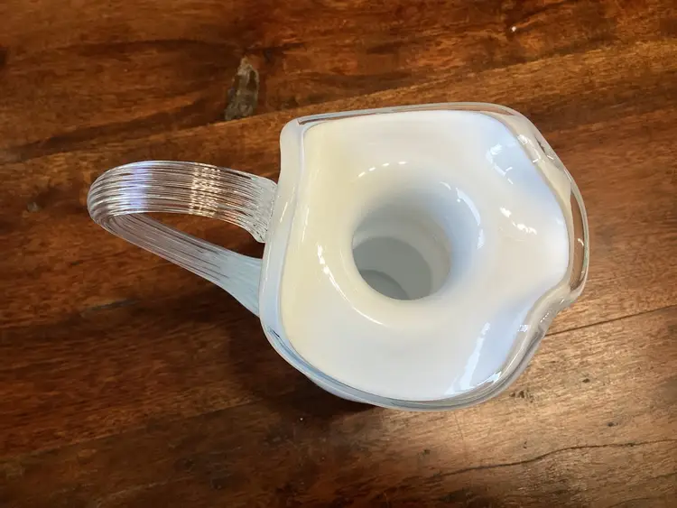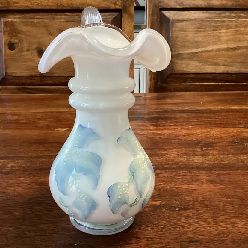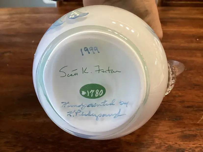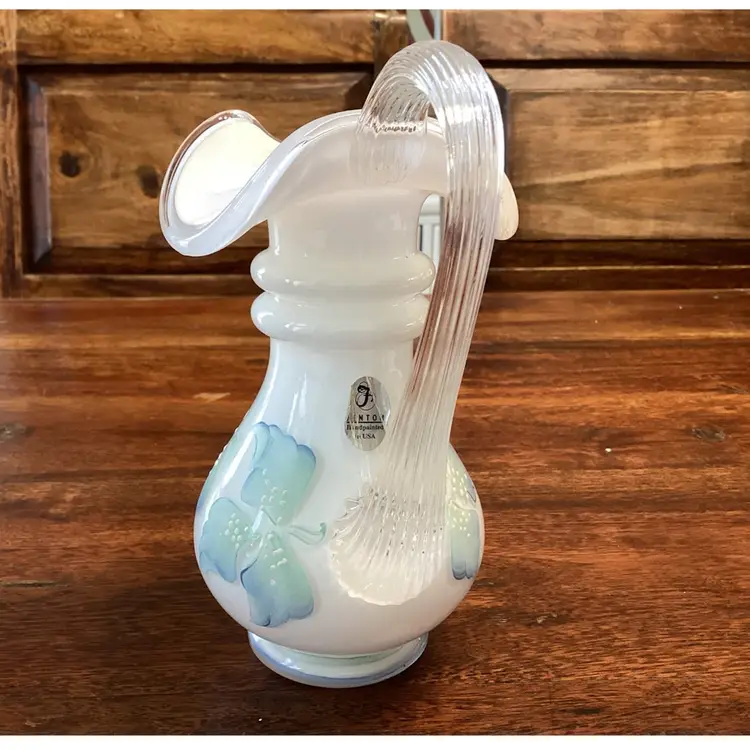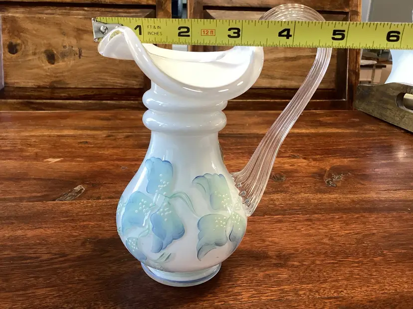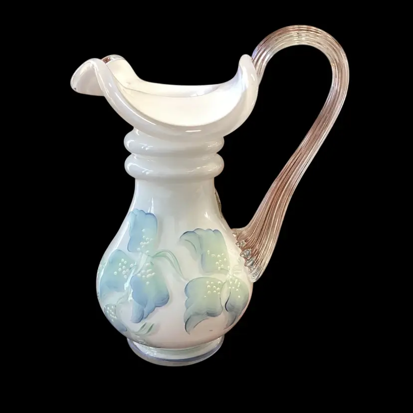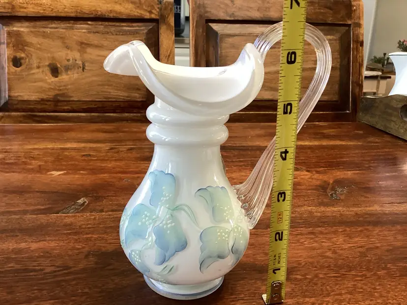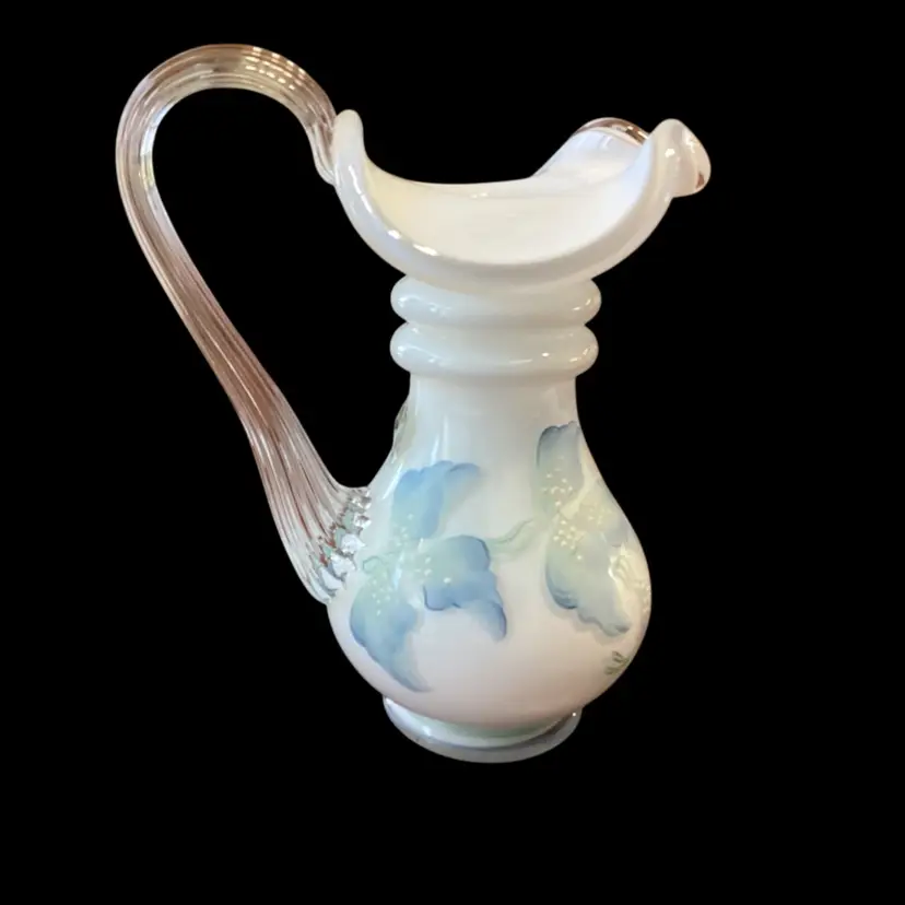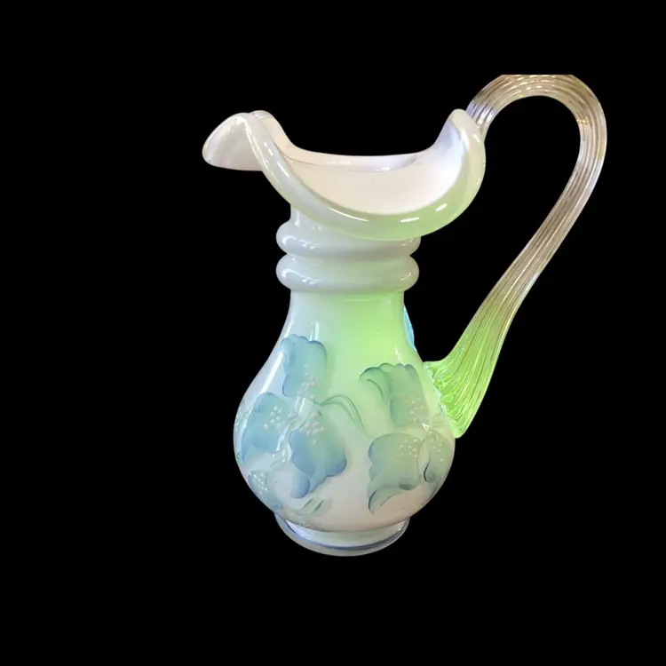 This Fenton hand painted pitcher is dated 1999 and signed by the artist. It stands approximately 6 1/2 inches tall to the top of the handle and 5 1/2 inches from the tip of spout to edge of handle. No condition issues noted. The piece does glow. Please see pictures for complete description, measurements and condition.