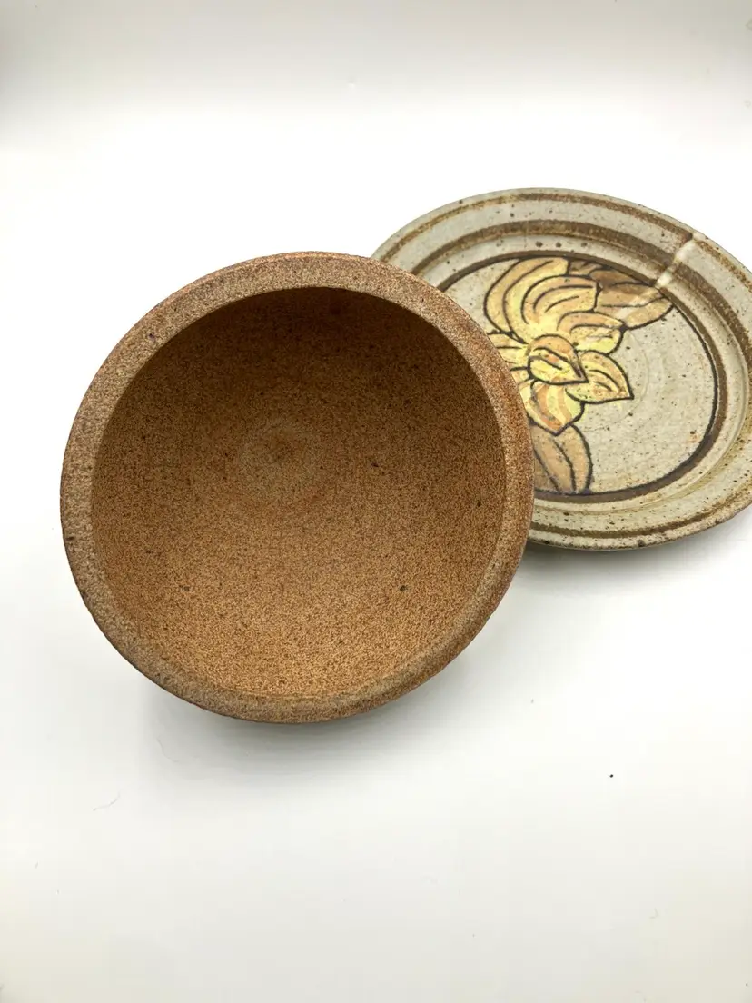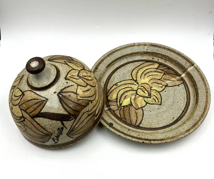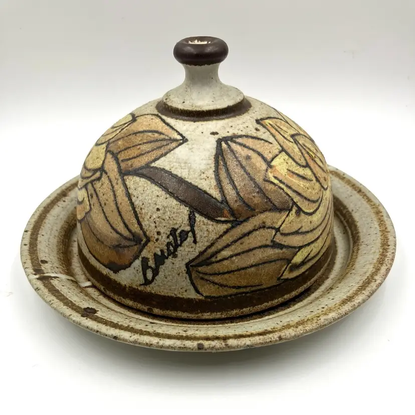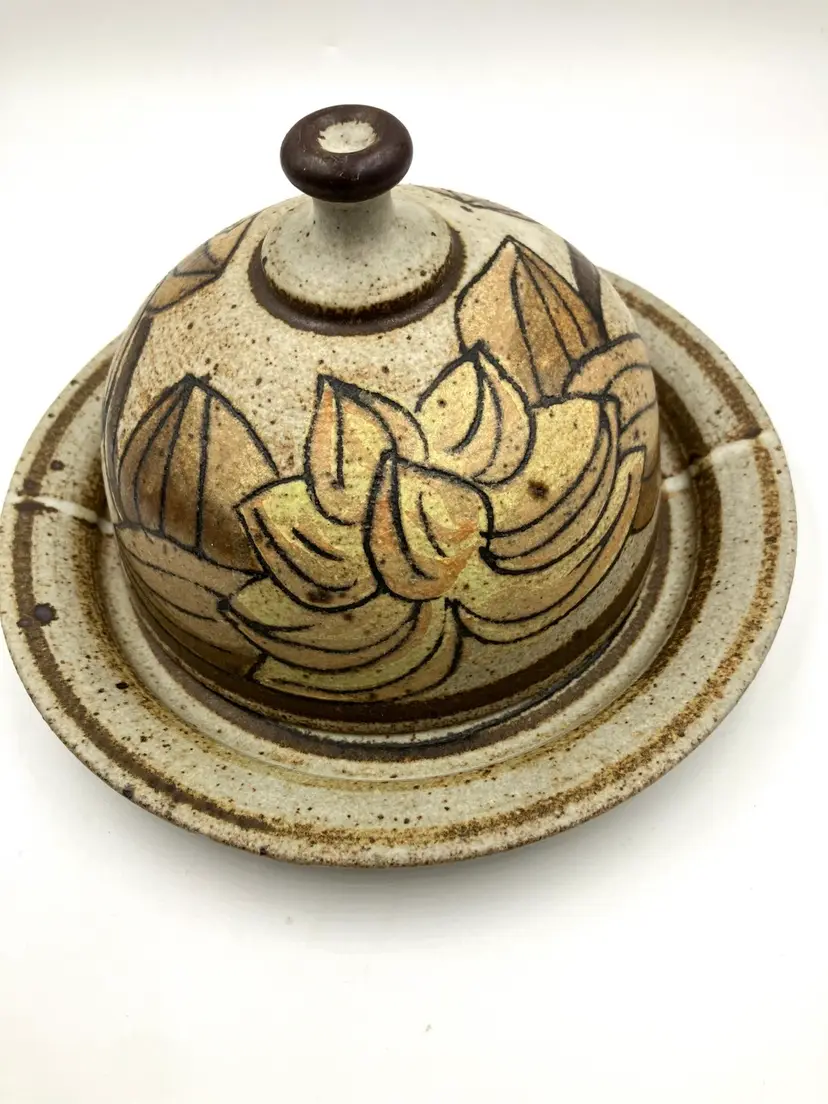 Beautiful 2 piece covered dish made of sturdy stoneware. Plate is 7.75” diameter and 0.875” tall. Cover itself is 5.625” diameter and 4” tall. Together the piece is 4.5” tall.