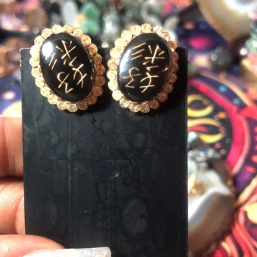 Gorgeous black enamel ovals with gold etched accents and a radiant gold bead border- classic statement clip ons with timeless charm