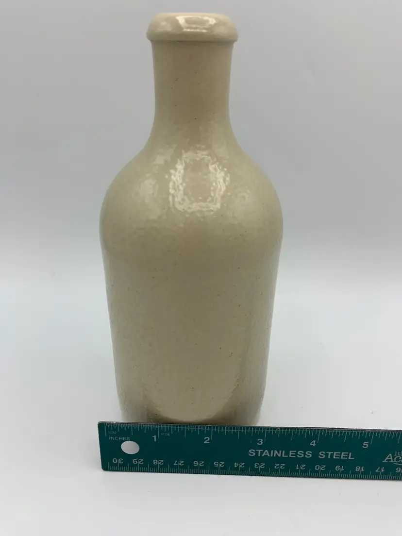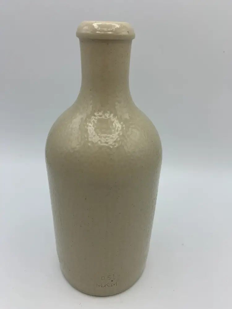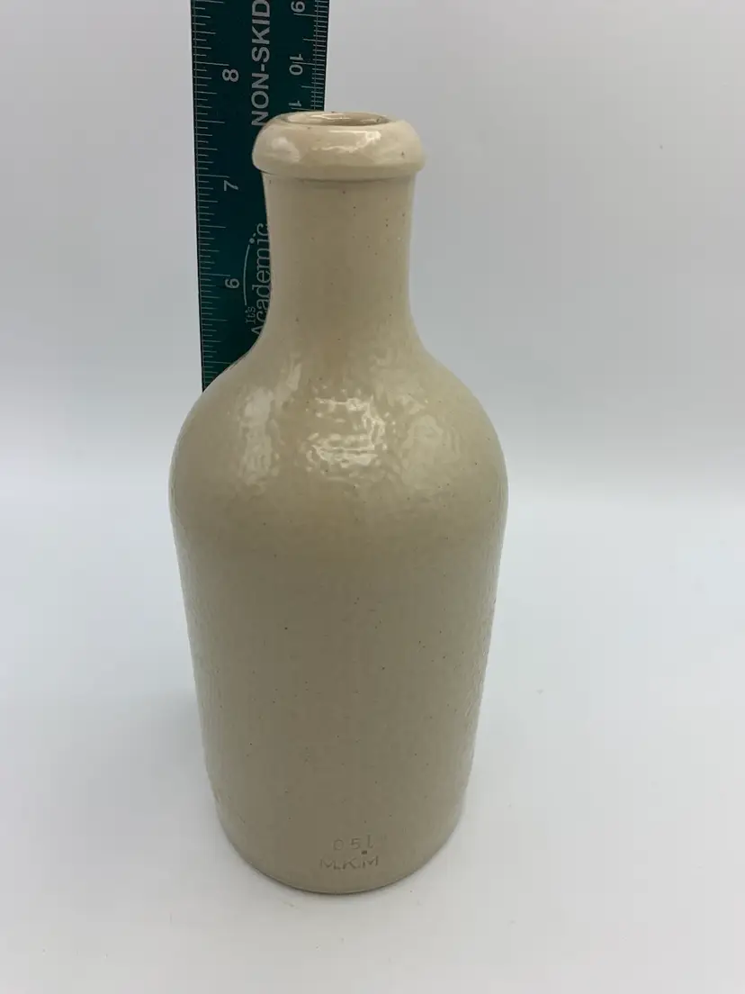 This vintage M.K.M white stoneware bottle is in excellent condition with no cracks, chips, or repairs. It shows minor wear marks on the bottom consistent with age and handling. The bottle features an off-white color typical of aged stoneware and retains its original German markings. Measuring approximately 8.5 inches tall and 3 inches in diameter, it has a solid and authentic vintage presence, perfect for collectors or display. This bottle dates back to late 1800's to early 1900's.