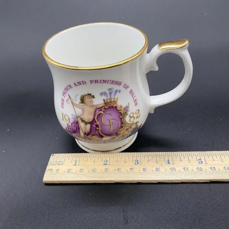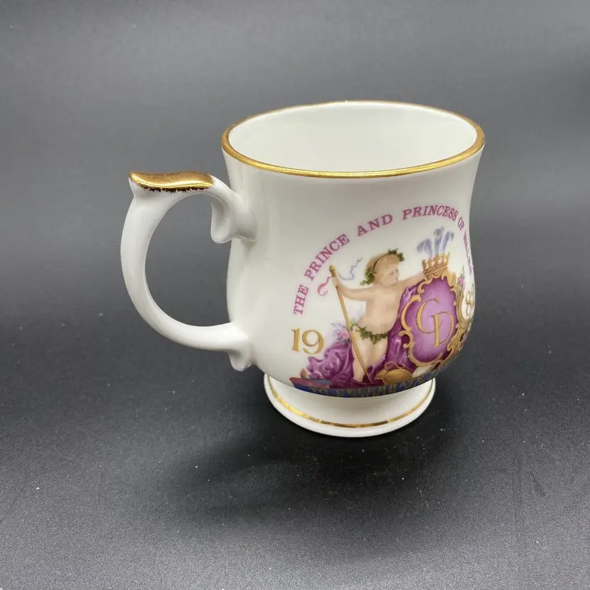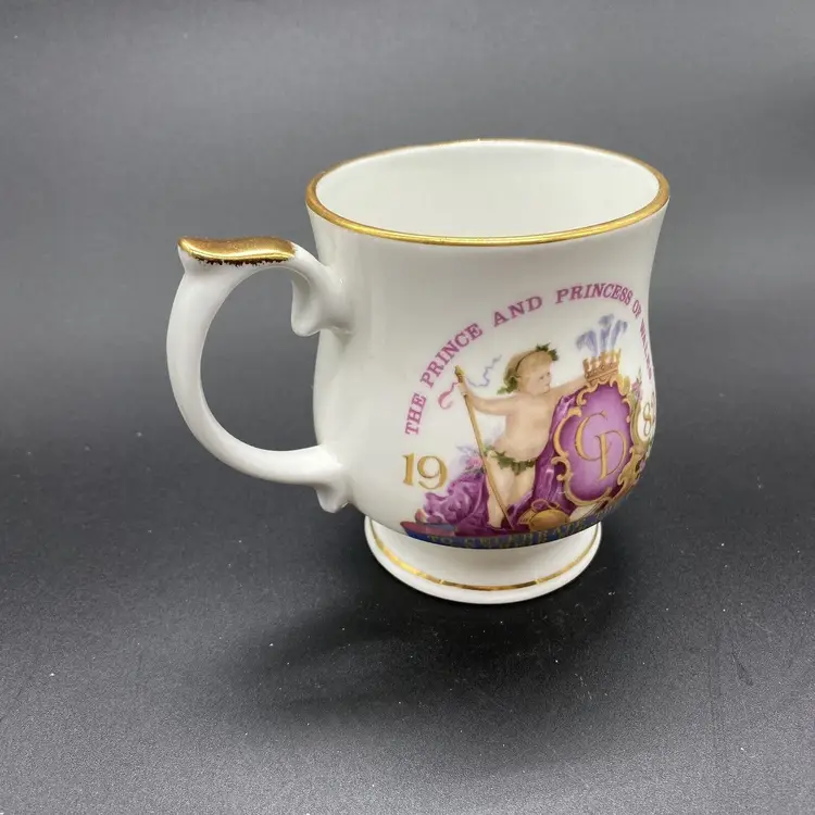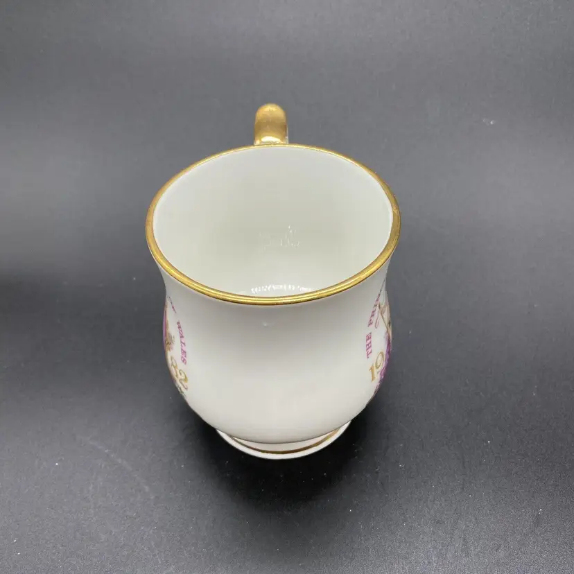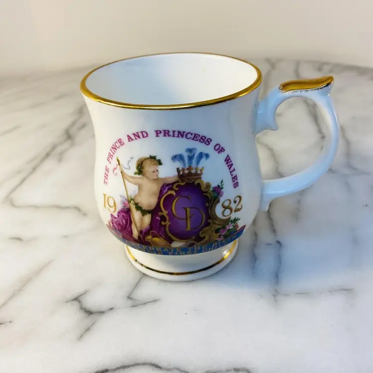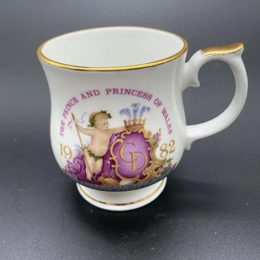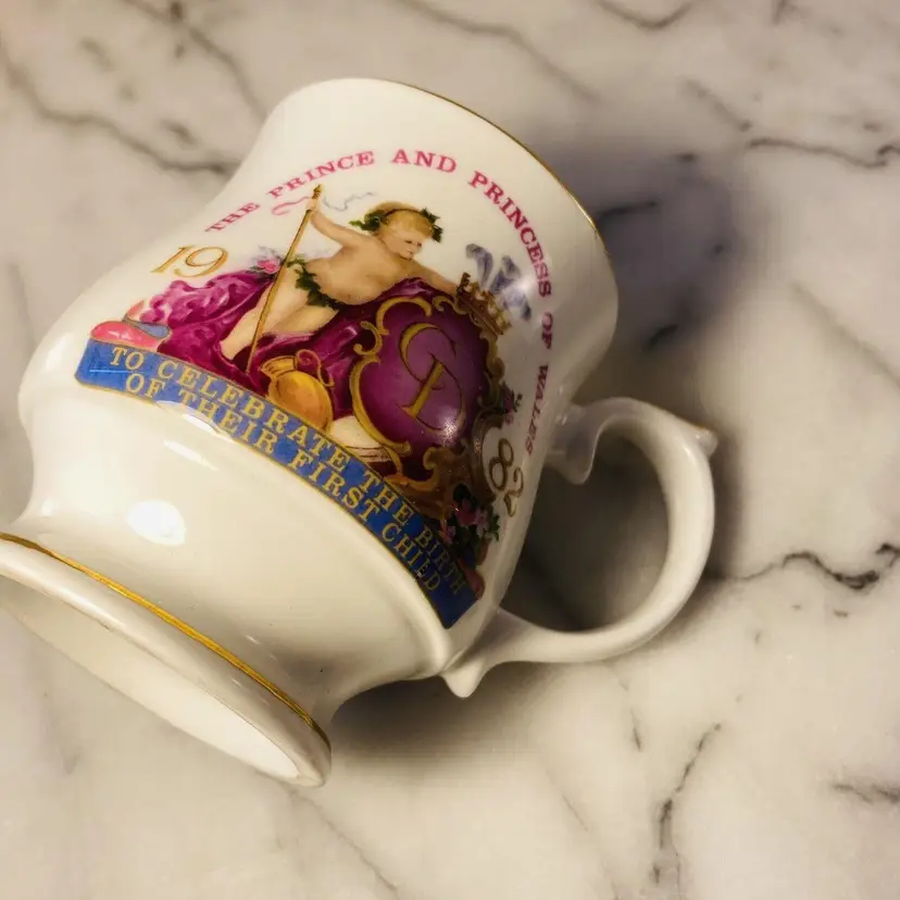 The front of the cup has the wording ‘The Prince and Princess of Wales, to celebrate the birth of their first child 1982’ on a blue banner beneath the main motif.