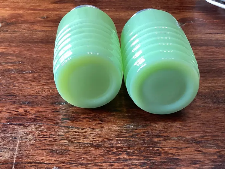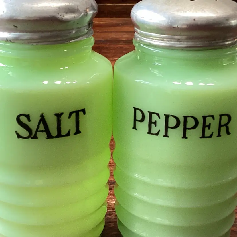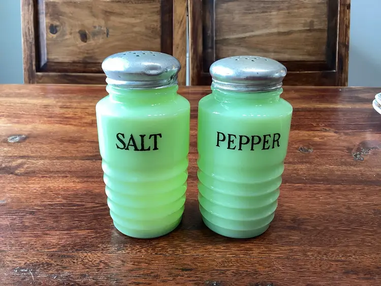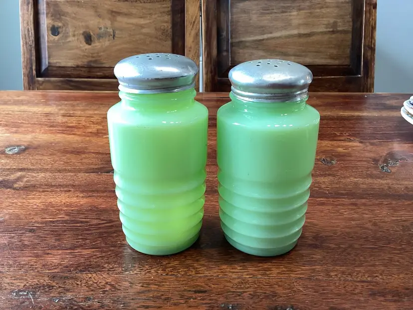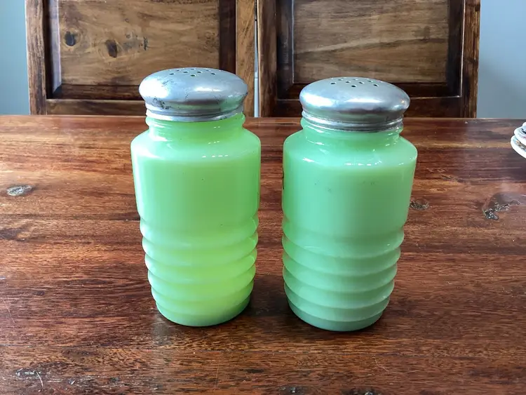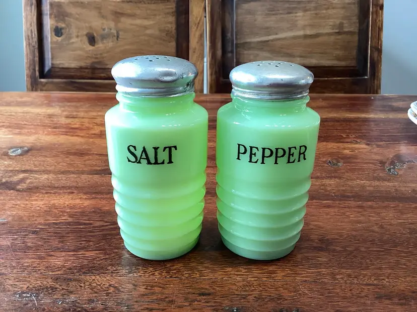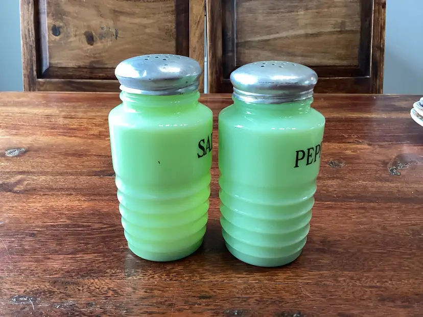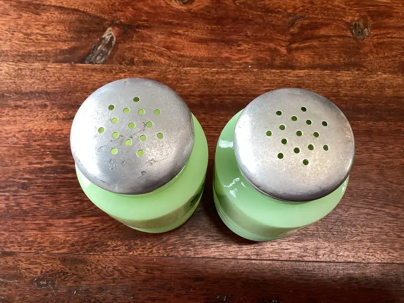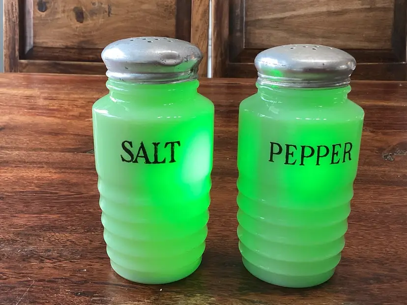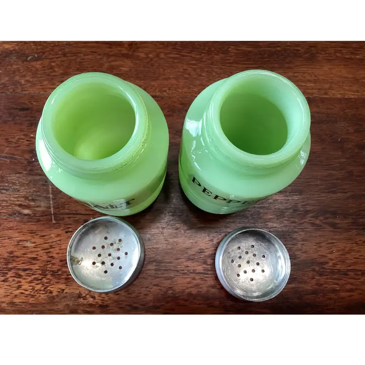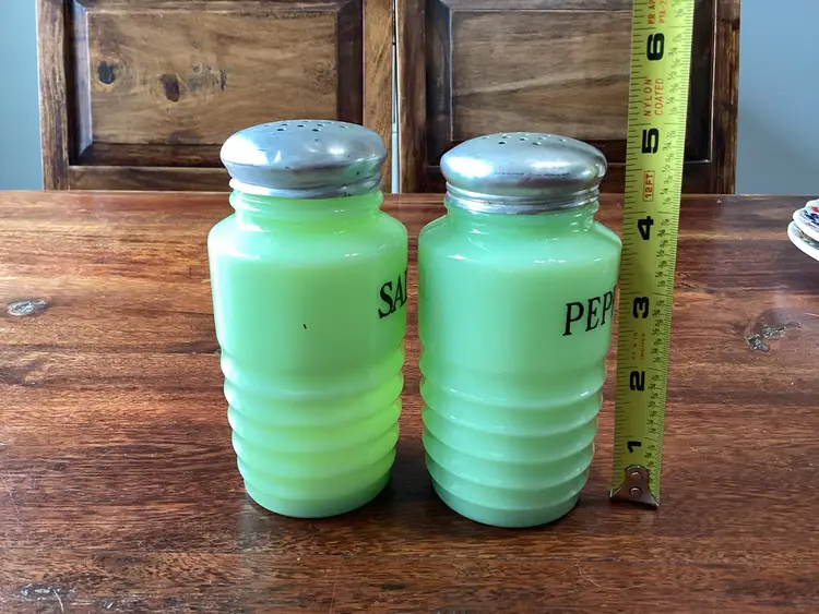 These vintage shakers are approximately 5 inches tall and 2 inches across at the base. No condition issues noted on the glass. The lids have a few dings as is expected with this type of shaker. They do have a really bright glow. Please see pictures for complete description, measurements and condition.