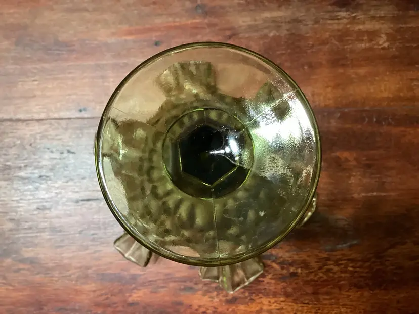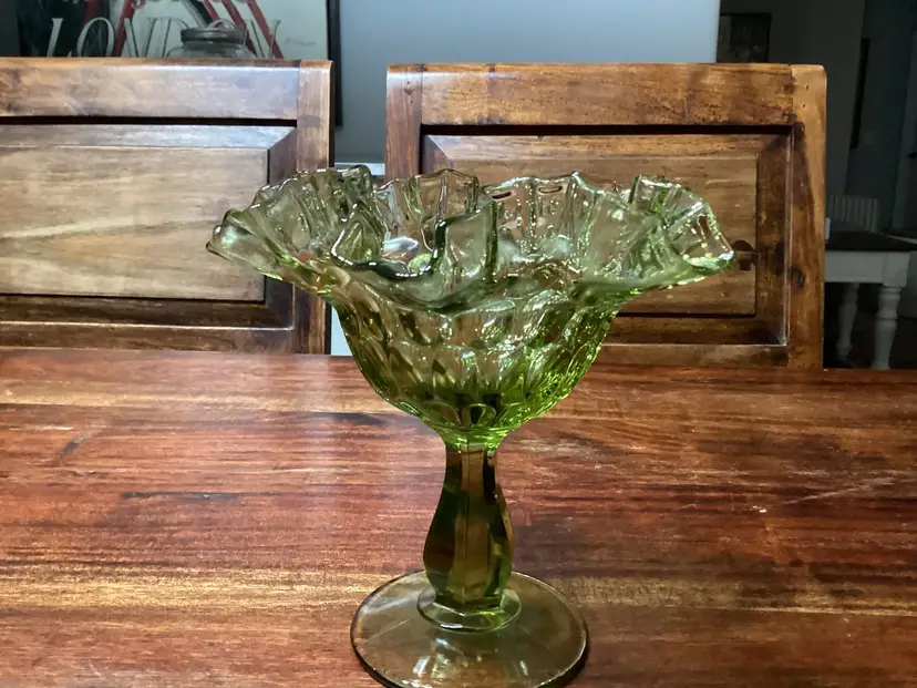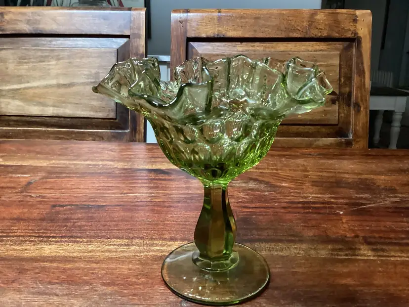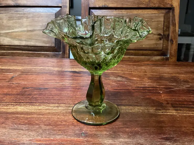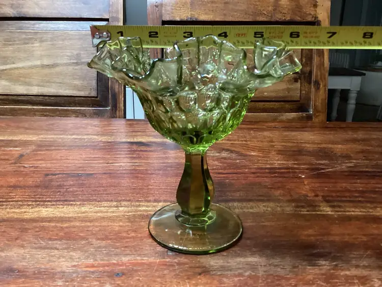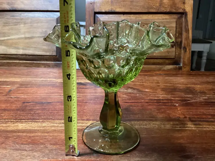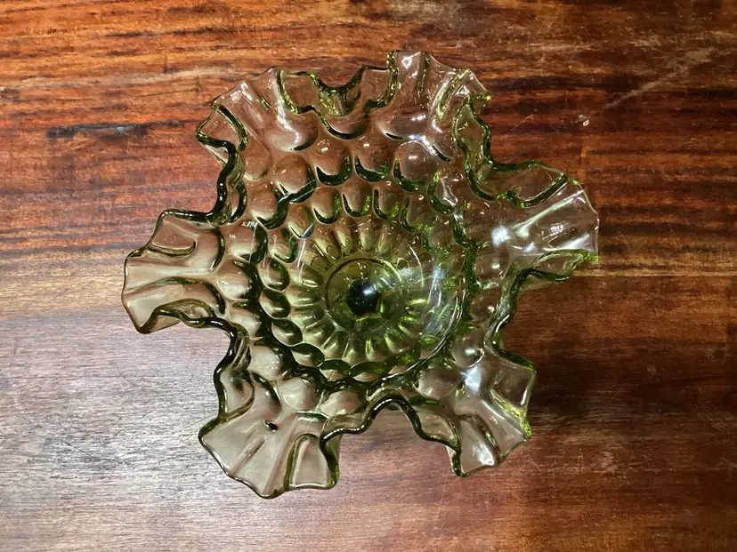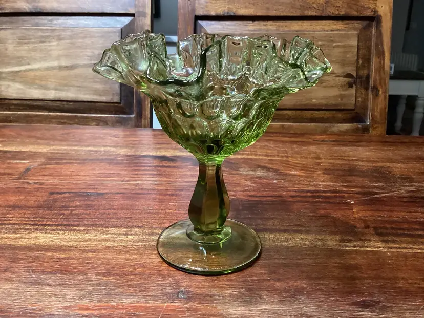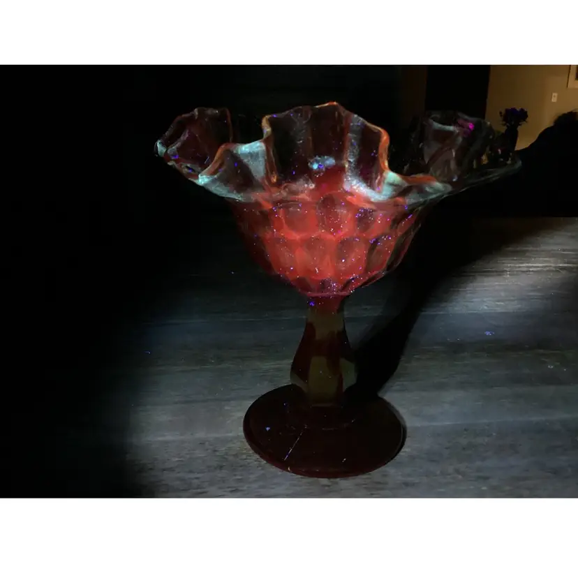 This is a decorative glass dish with a ruffled edge and a thumbprint pattern made by Fenton in the 1960s. Nice MCM style. 6 inches tall in approximately 6 inches across the top. This piece has a red glow under UV light, which may mean it contains cadmium or selenium. No condition issues noted.