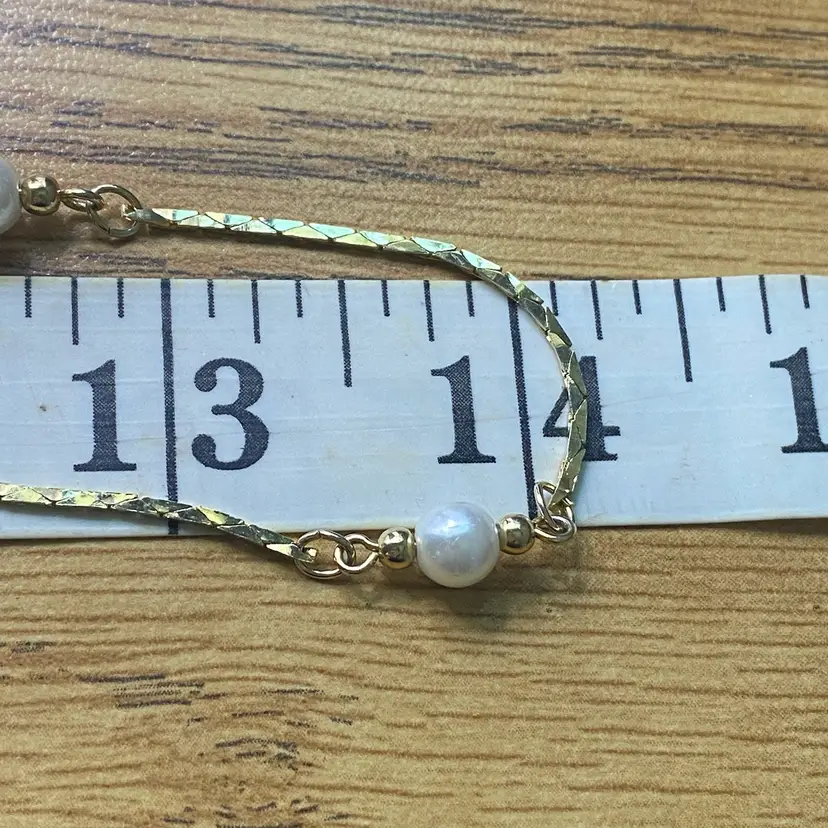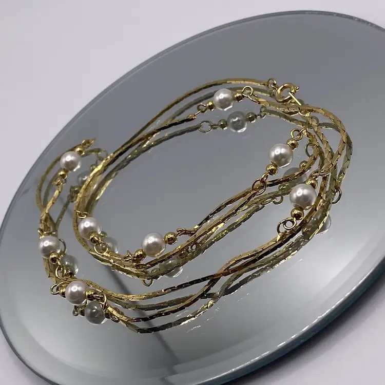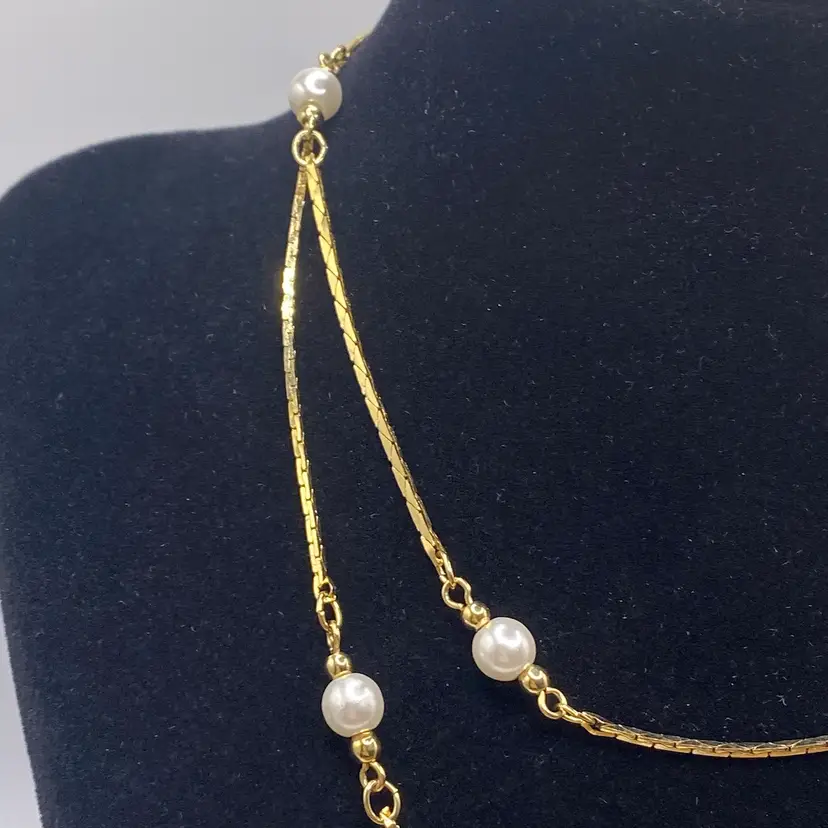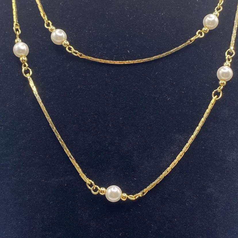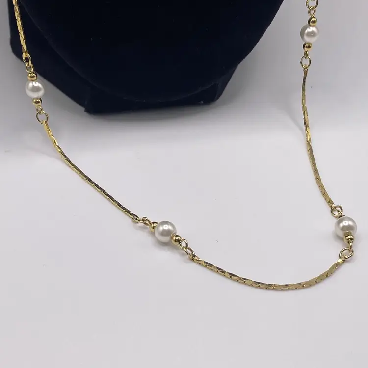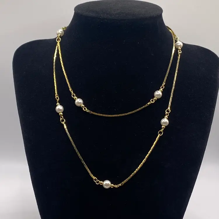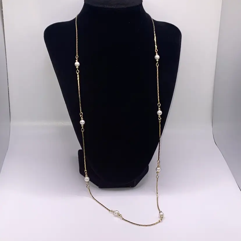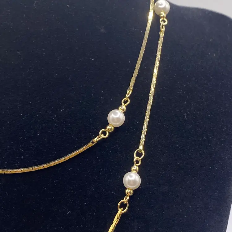 Add a touch of vintage glamour to your outfit with this stunning 28" gold tone chain necklace. The necklace features faux pearl beads and a spring ring closure, making it perfect for both evening wear and everyday use. The piece is stamped, Korea, and has a beautiful bohemian style that will complement any outfit.