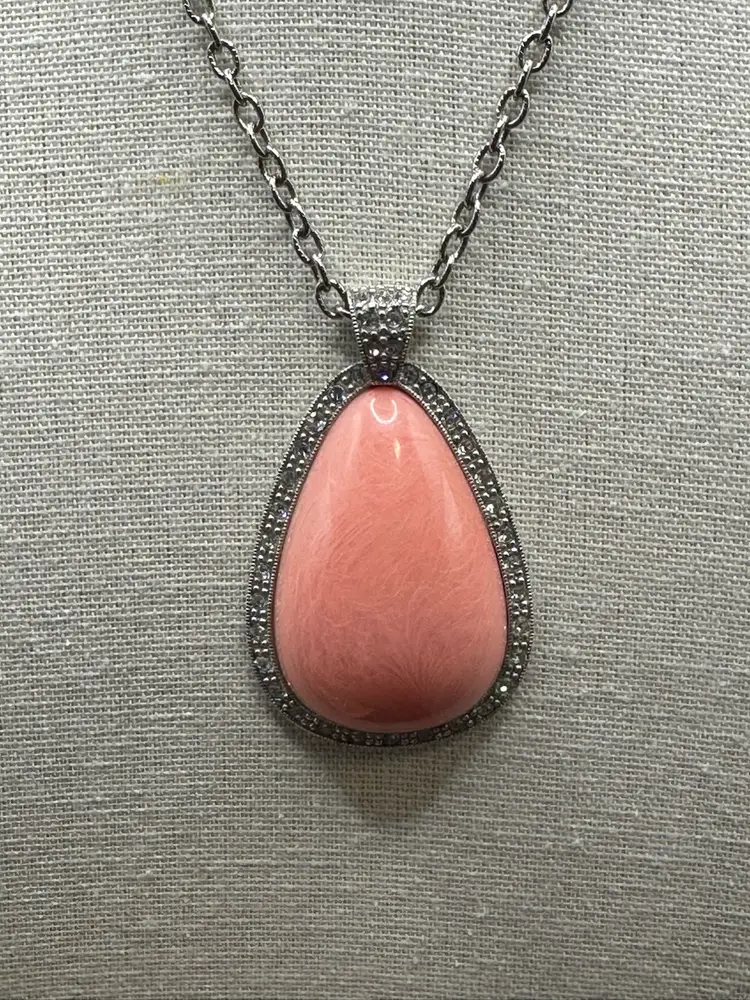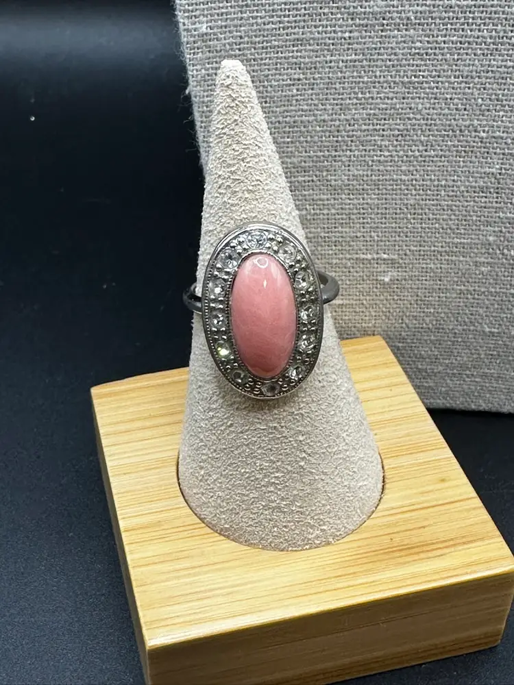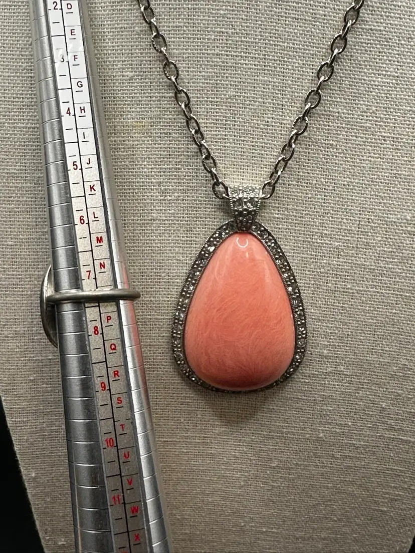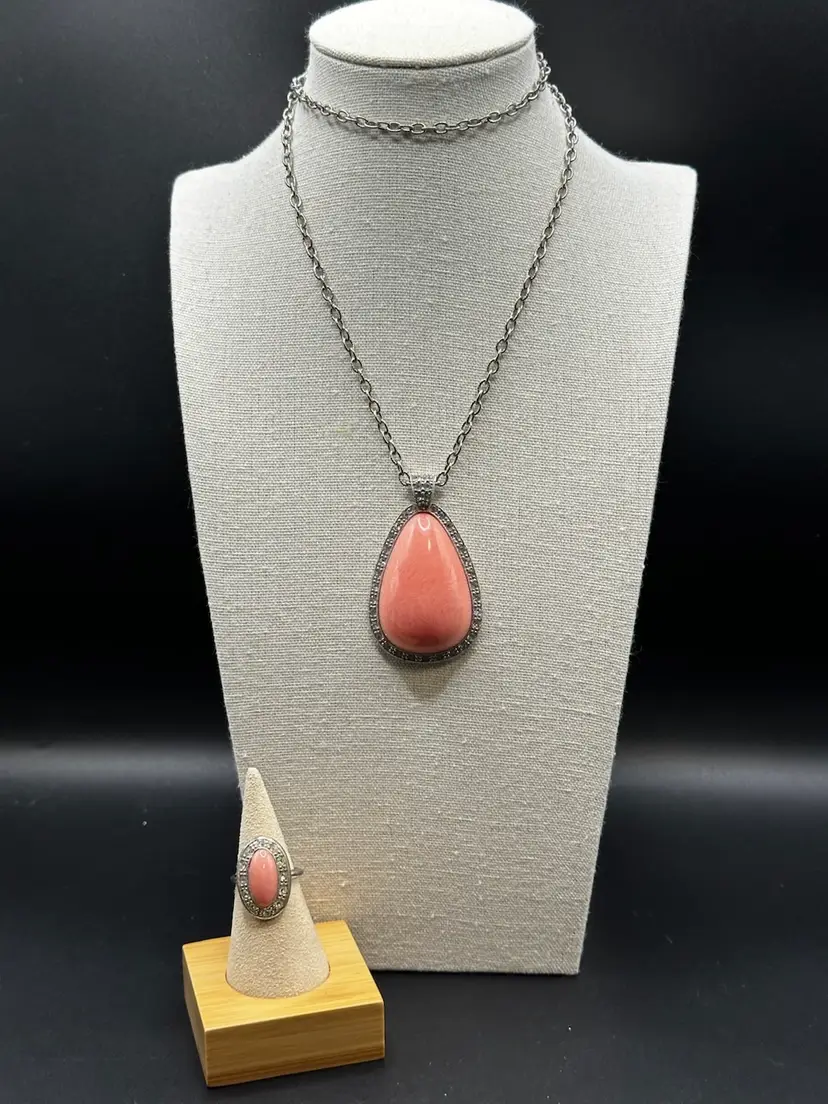 Ring approximately 7.5 and signed. Necklace is spring ring clasp and total length of 24 inches, uncertain if chain is Avon. The pendant is 2.25 inches and signed Avon.
