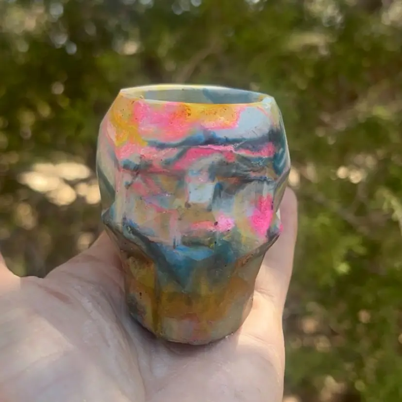 Hand poured concrete planter, using various dyes for color. Drainage included.