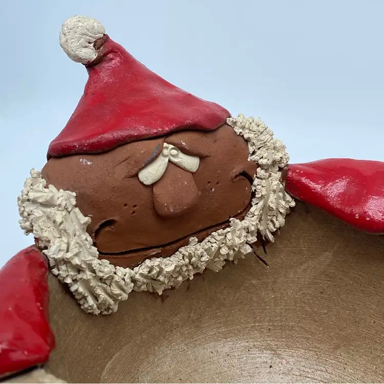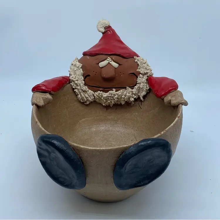 This particular piece, a Santa Claus-shaped bowl, embodies the spirit of contemporary folk art. Its design, with its plump form, expressive face, and bold colors, is characteristic of holiday collectibles that aim to bring a cheerful and handmade feel to seasonal decor. Such items are often produced in limited quantities or are individually crafted, contributing to their collectible status and market value among enthusiasts of holiday and folk art. The presence of a signature, even if illegible, suggests a deliberate artistic creation.