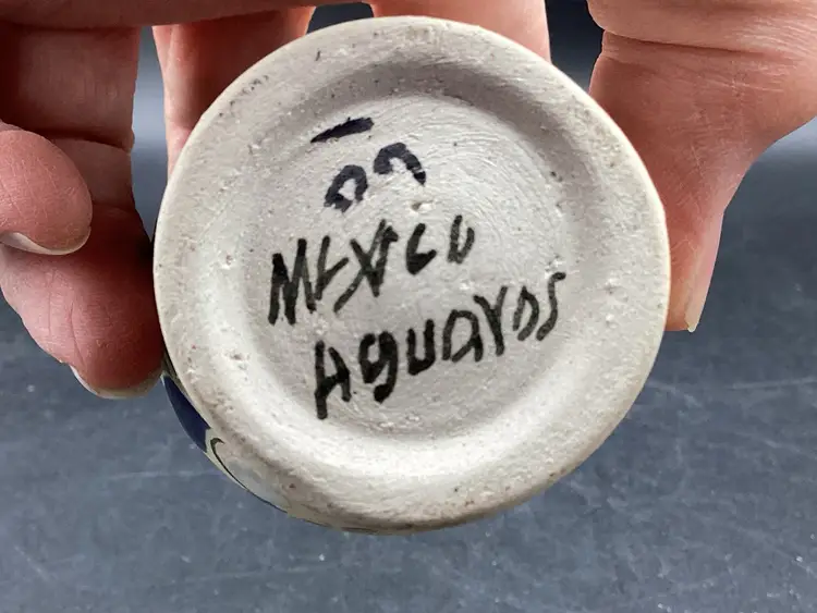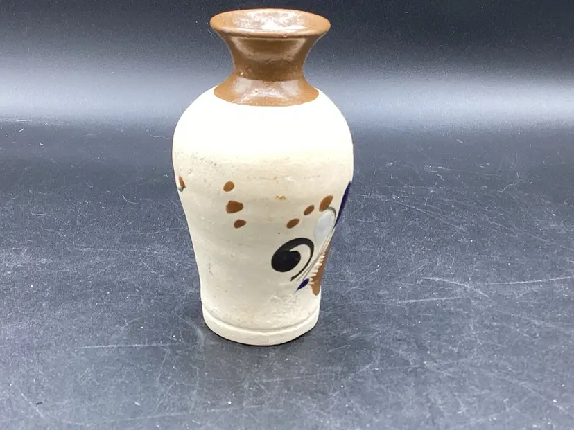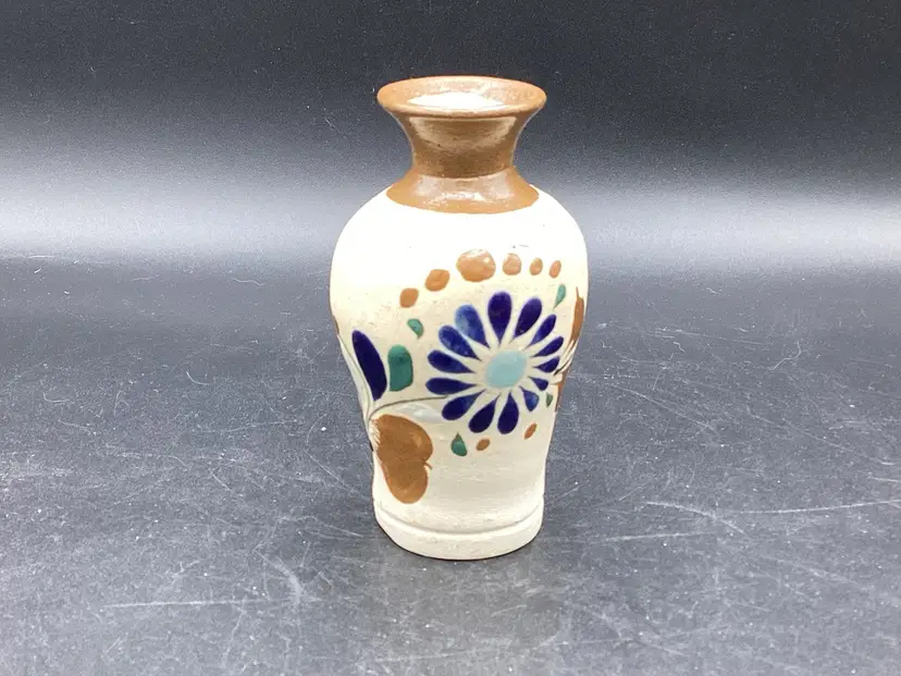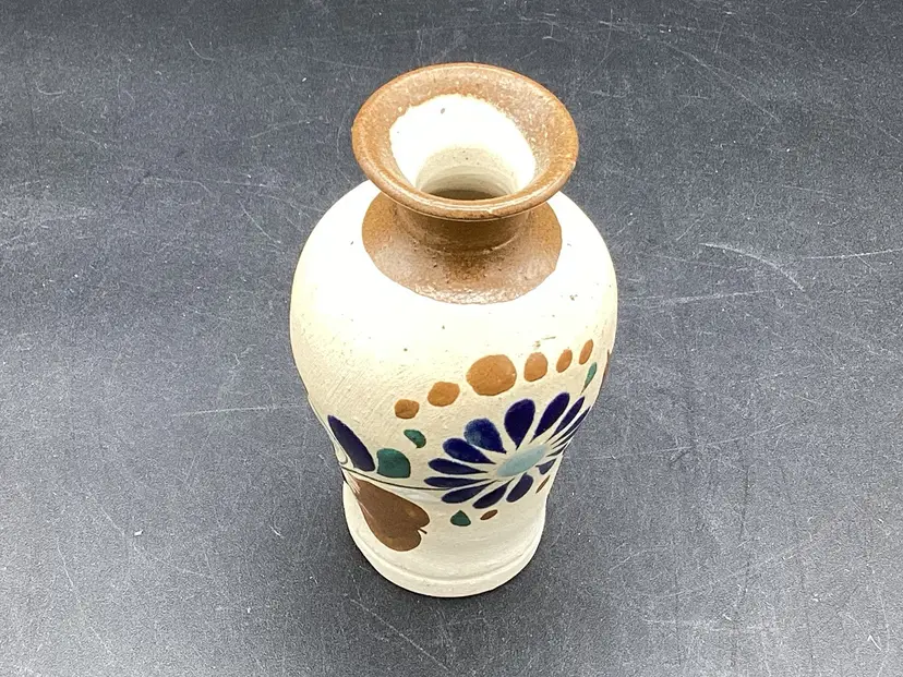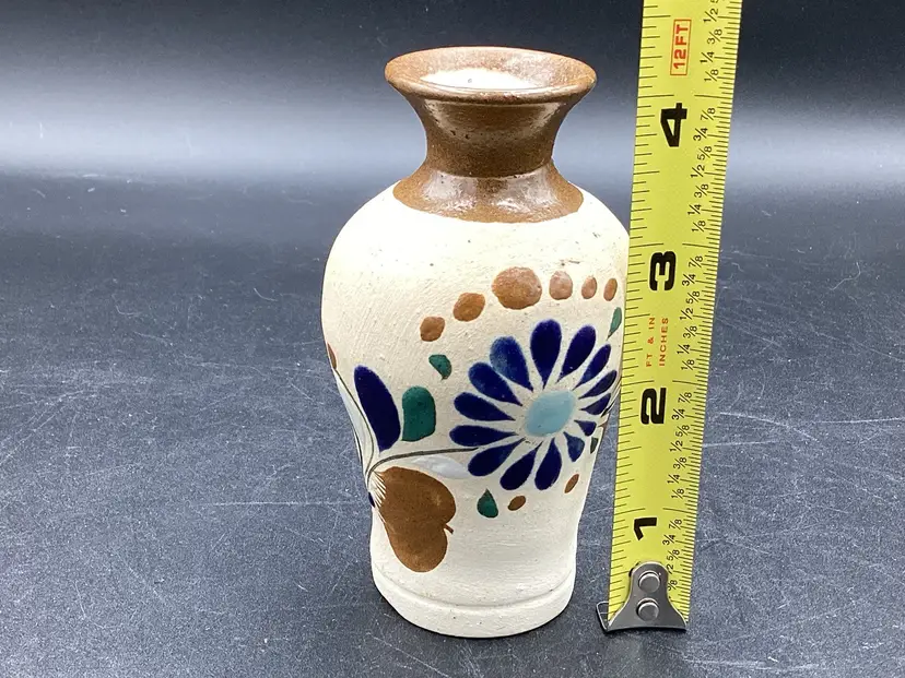 Small hand painted Tonala vase measuring 4 inches tall. No chips, cracks or flea bites. Signed on the bottom.