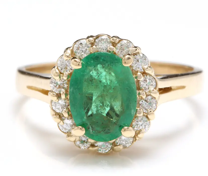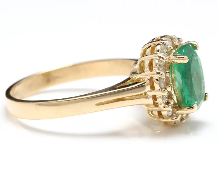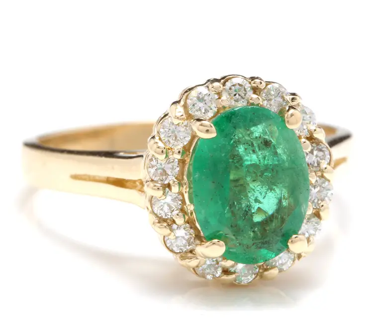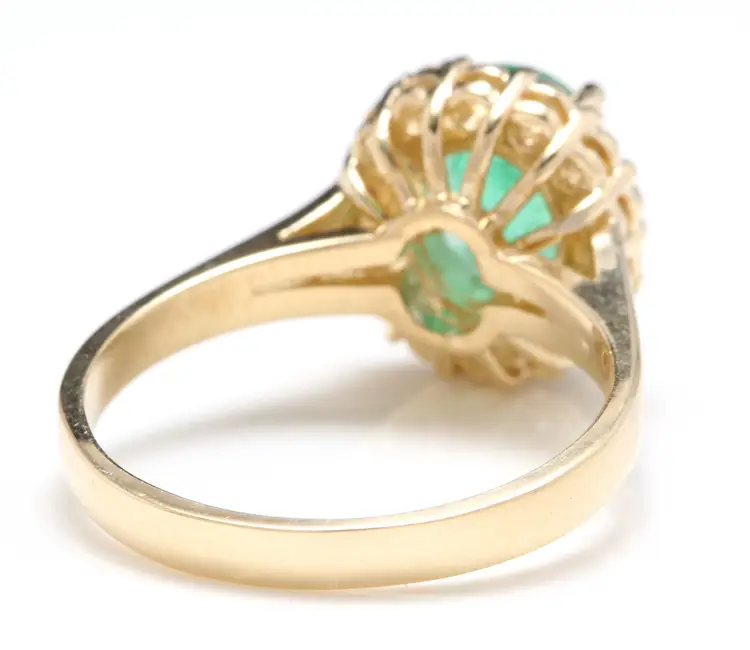 Metal: Yellow Gold Metal Purity: 14k Sizable: Yes Main Stone: Emerald Main Stone Color: Green Total Carat Weight (TCW): 3.00 Main Stone Creation: Treated Main Stone Shape: Oval Ring Size: 7 Main Stone Treatment: Oiling/Resin Brand: Unbranded Type: Ring