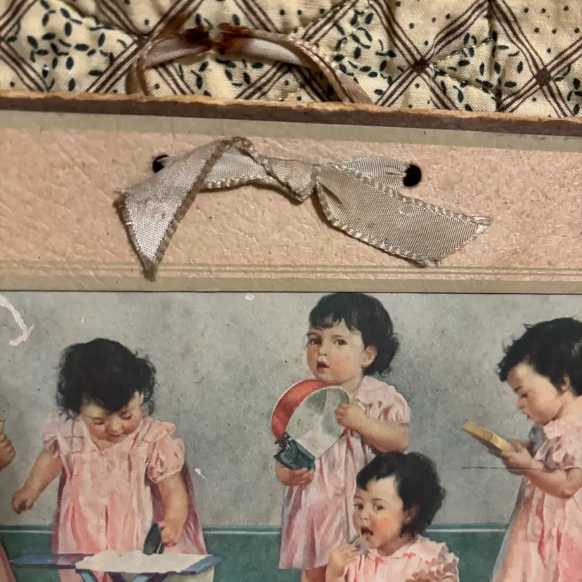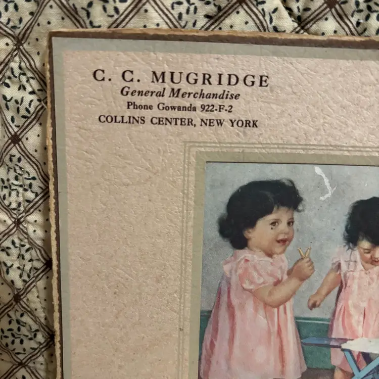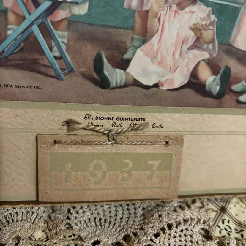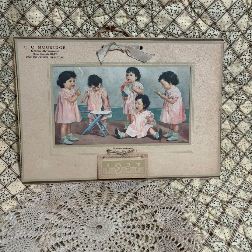 1937 Dionne Quintuplets advertising calendar. C.C. Mugridge General Merchandise New York. No rips or tears. Unusual age discoloration on back. Hanging ribbon is delicate. 11.5”X8”.