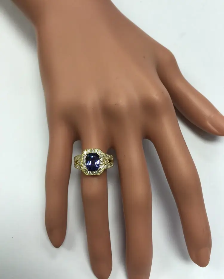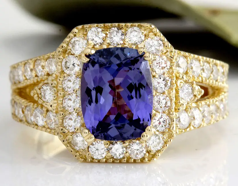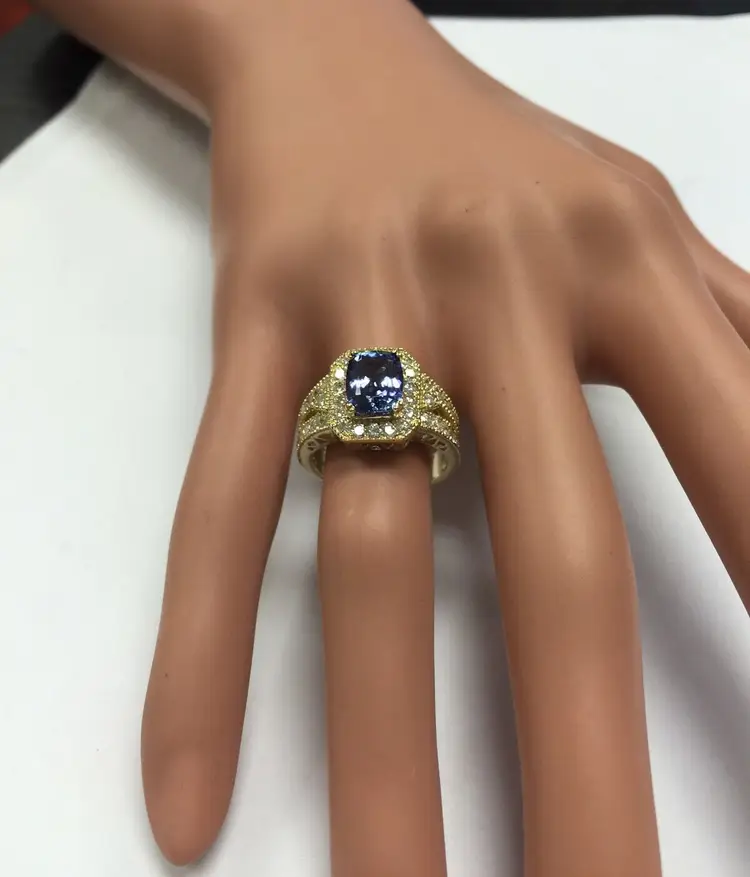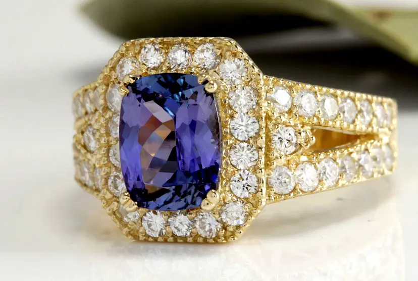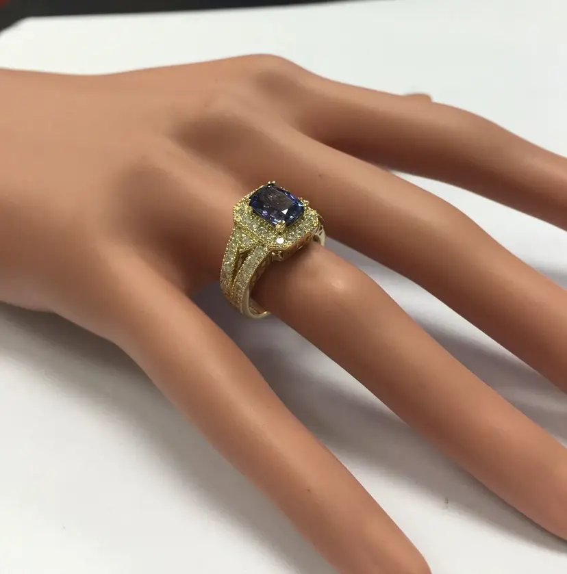 Total Carat Weight (TCW): 3.30 Type: Ring Main Stone Color: Bluish Violet Brand: Unbranded Ring Size: 6 Main Stone Shape: Cushion Main Stone Treatment: Heating Metal Purity: 18k Main Stone: Tanzanite Sizable: Yes Main Stone Creation: Natural Metal: Yellow Gold