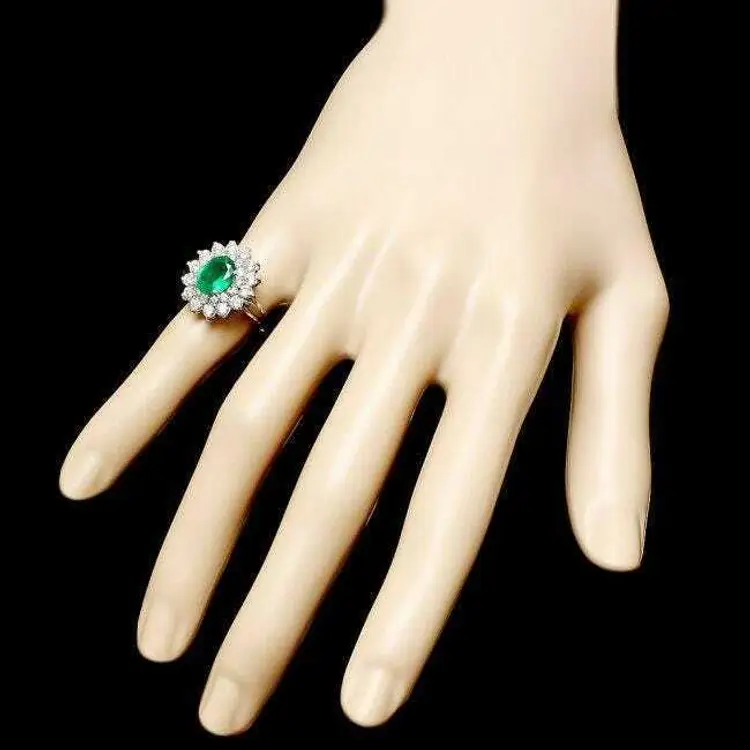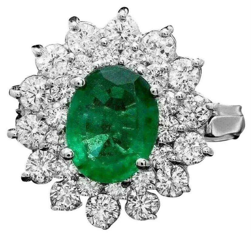 Main Stone Color: Green Main Stone Treatment: Oiling Metal Purity: 14k Main Stone: Emerald Sizable: Yes Main Stone Creation: Natural Metal: White Gold Ring Size: 6 Total Carat Weight (TCW): 3.30 Main Stone Shape: Oval Type: Ring Material: Gemstone Brand: Unbranded