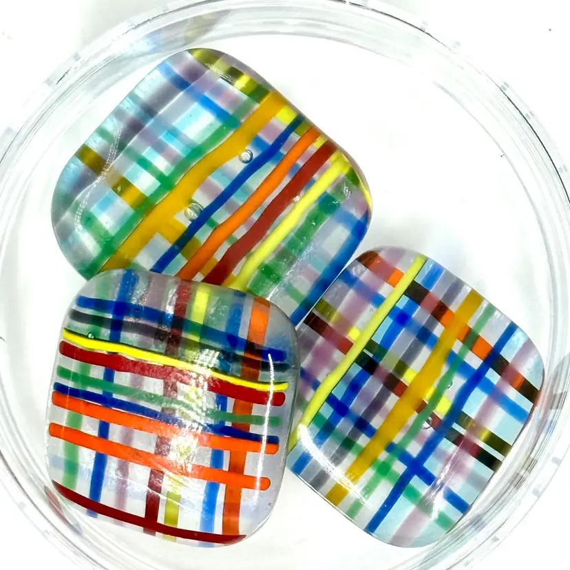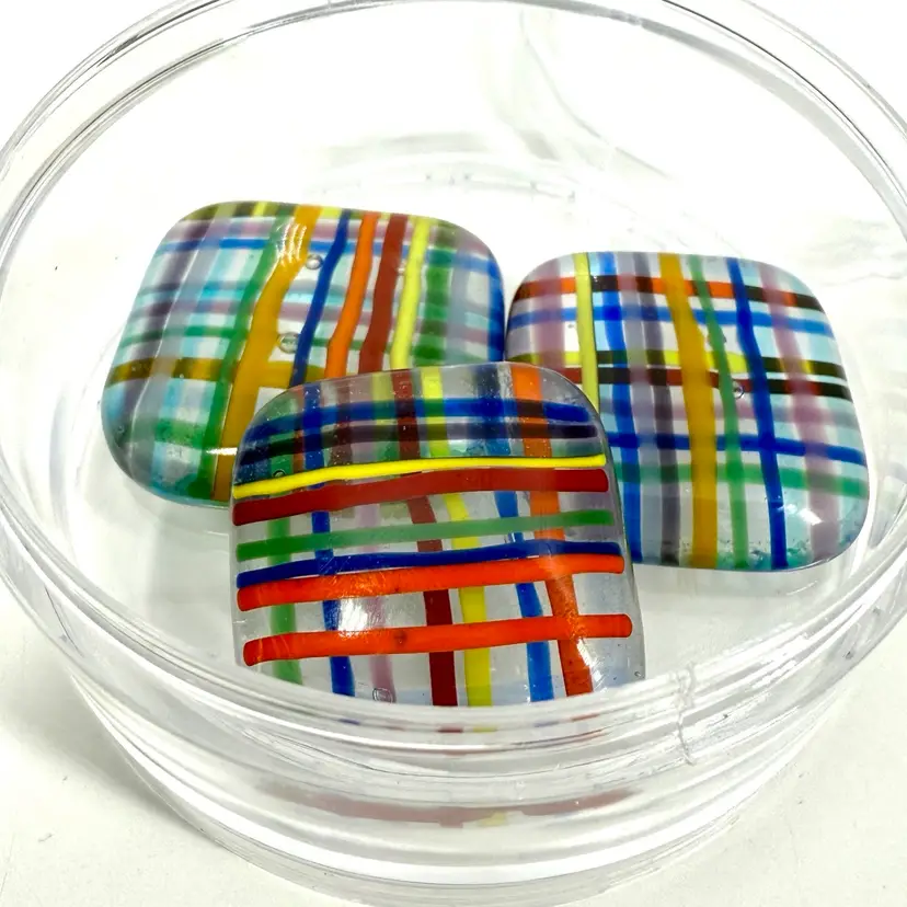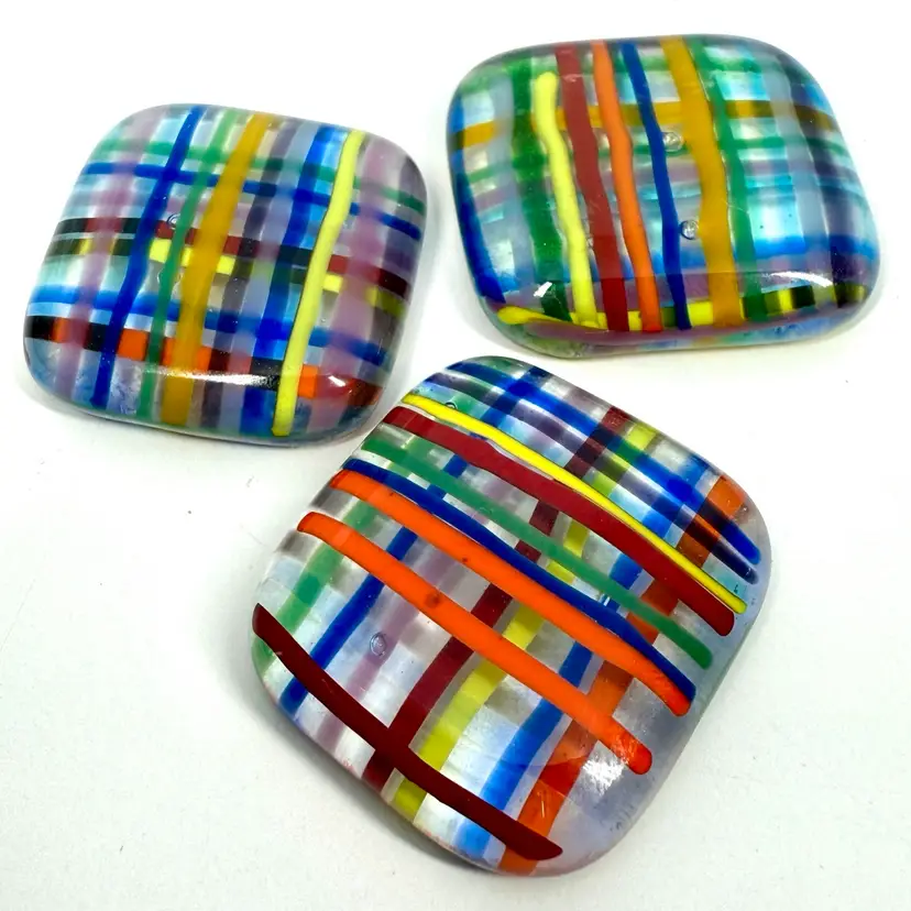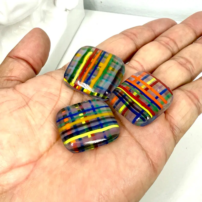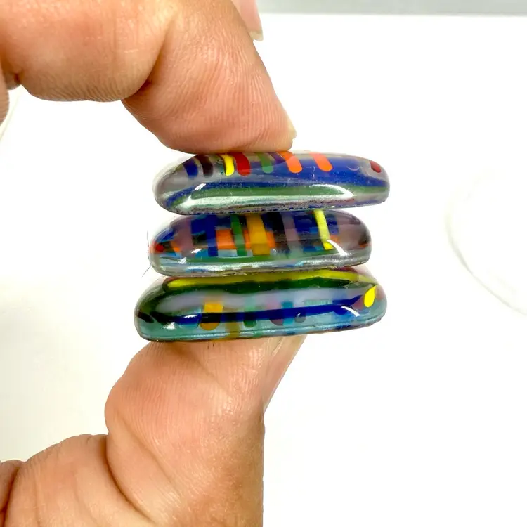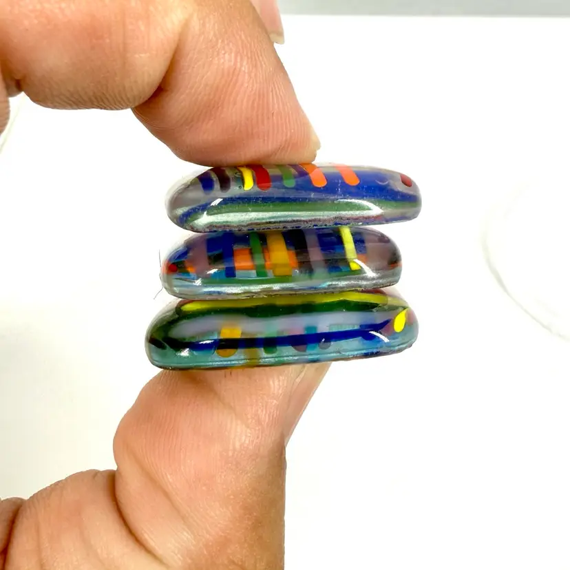 Approximate: 1-1.25”x 1/4 thick” multi-colored smooth edged cabochons. Handmade in South Florida