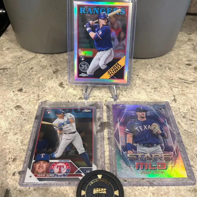 Josh Jung (Texas Rangers) 3 card rookie lot including 2023 Topps Chrome 1988 Rookie Refractor (#88BC-15), 2023 Topps Chrome base Rookie #93 and RC Topps Stars of the MLB. Ships PWE $1.50. Stacking for $.25.