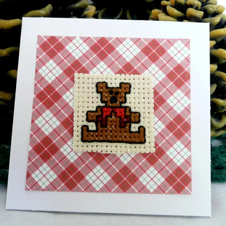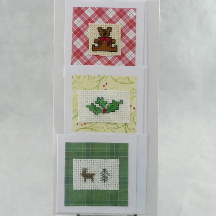Featuring: classic teddy bear on red Christmas plaid scrapbook paper green Christmas holly on holly scrapbook paper rustic reindeer & evergreen tree on green Christmas plaid blank inside, envelopes included approx 3 1/4" x 3 1/4".