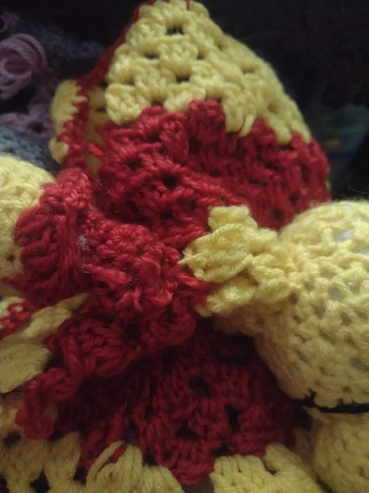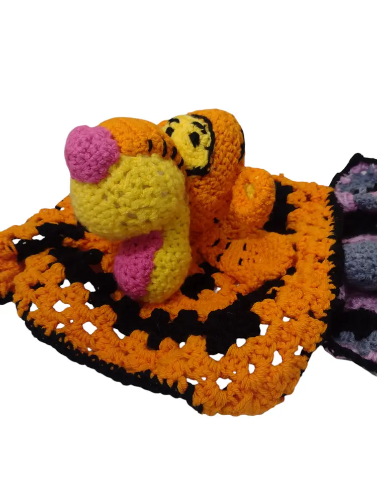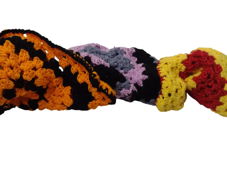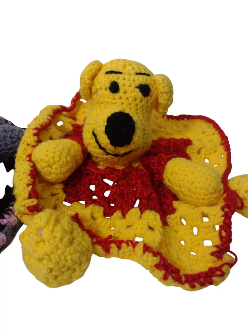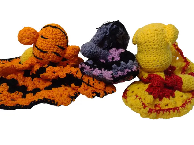 These adorable handmade crotchet pieces are well done and unique with the granny square bottoms that would look great on a shelf, dresser or bed. Each one approximately measures 7" tall x 12" wide.