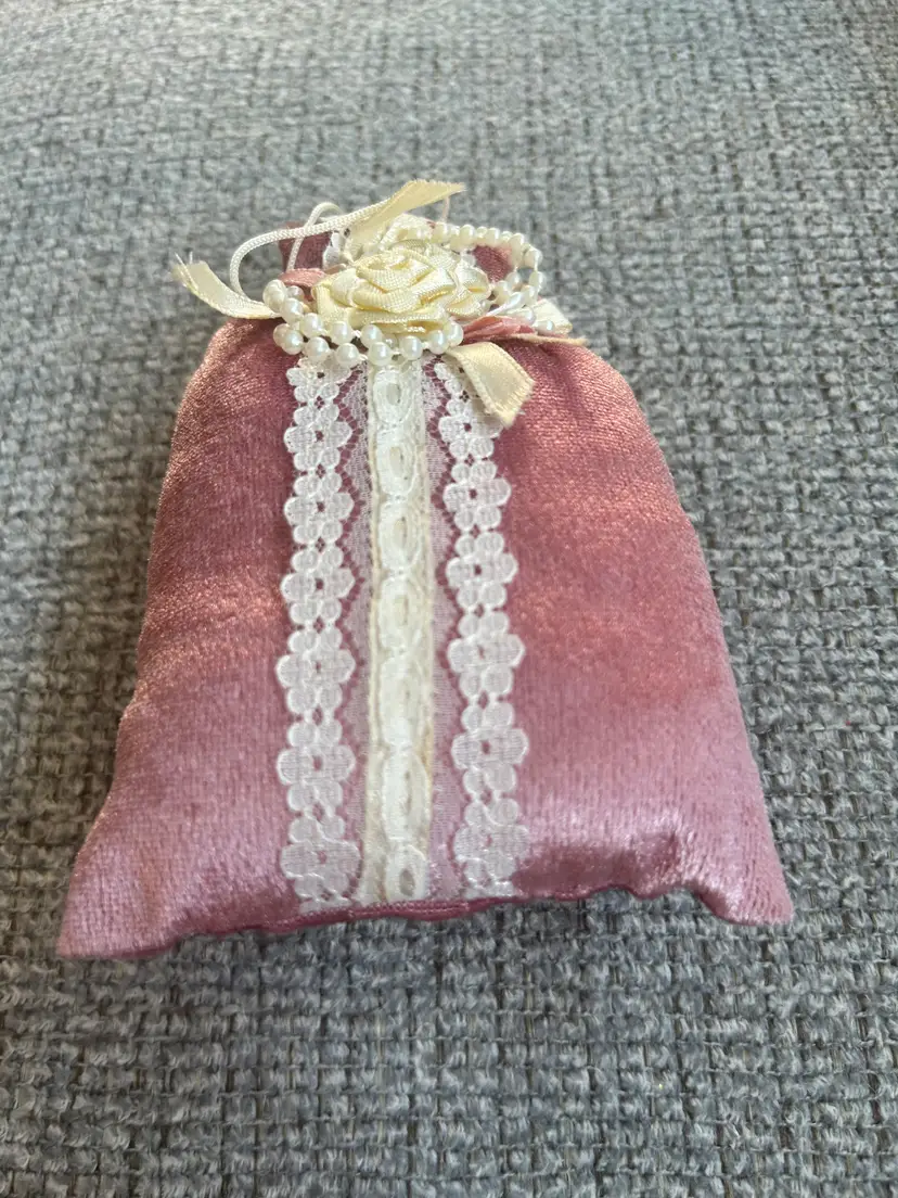Charming pink velvet sachet adorned with lace and a delicate floral accent. Perfect for adding a touch of elegance to any space.