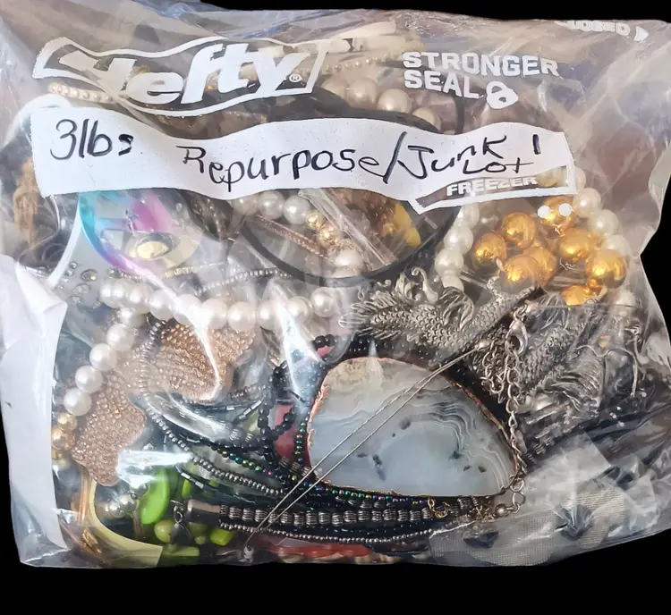 This 3 lb jewelry lot includes mixed vintage and modern jewelry that are ready for a new life! The lot includes a variety of accessories including earrings, necklaces, bracelets, bangles, and beads. The jewelry is multicolored and made from unknown base metal and metal with unknown stone creation. The lot is categorized under "Jewelry Mixed Lots" and "Jewelry & Watches." This is a great opportunity to acquire a unique and diverse selection of jewelry pieces to repurpose.