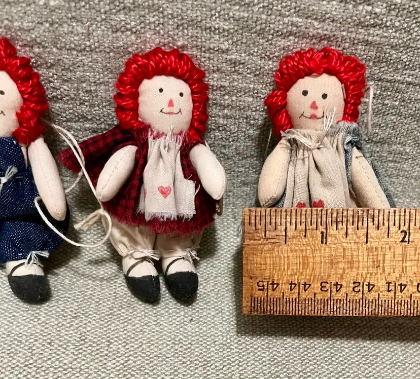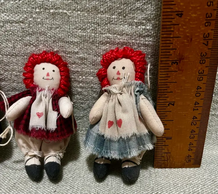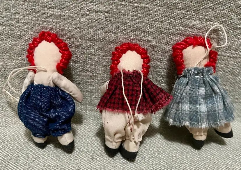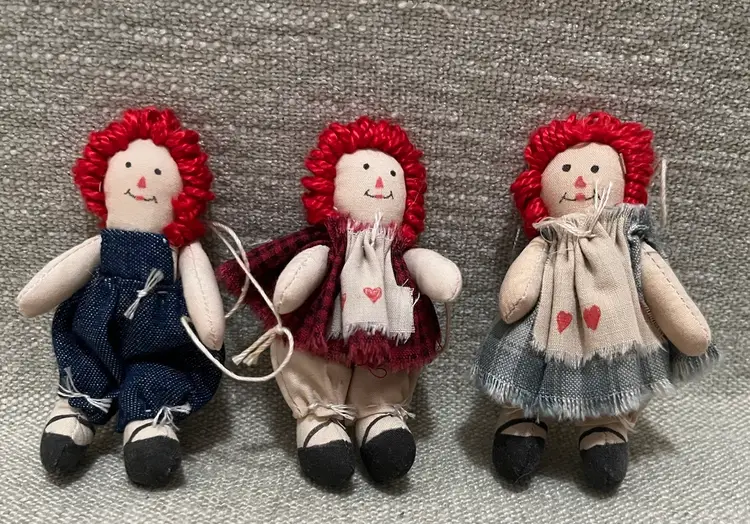 These handmade crafted fabric Raggedy Ann ornaments feature red yarn hair and are approximately 3.5" in size. Made in the United States, this set includes 3 mini ornaments perfect for a Christmas tree, used as a gift topper, added to a wreath, or as a unique gift for collectors of Raggedy Ann & Andy memorabilia. Each ornament is crafted with attention to detail, with sponge stencil painted details sure to add a touch of nostalgia to any holiday decor.