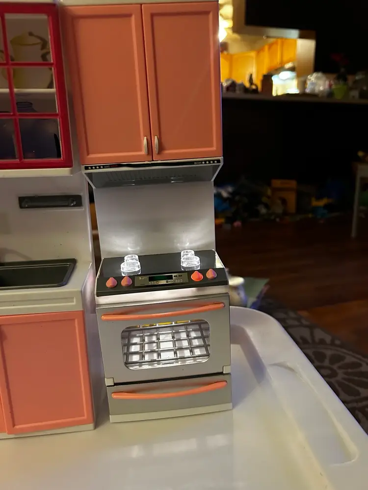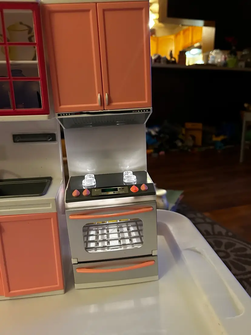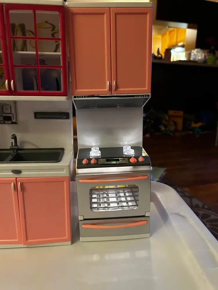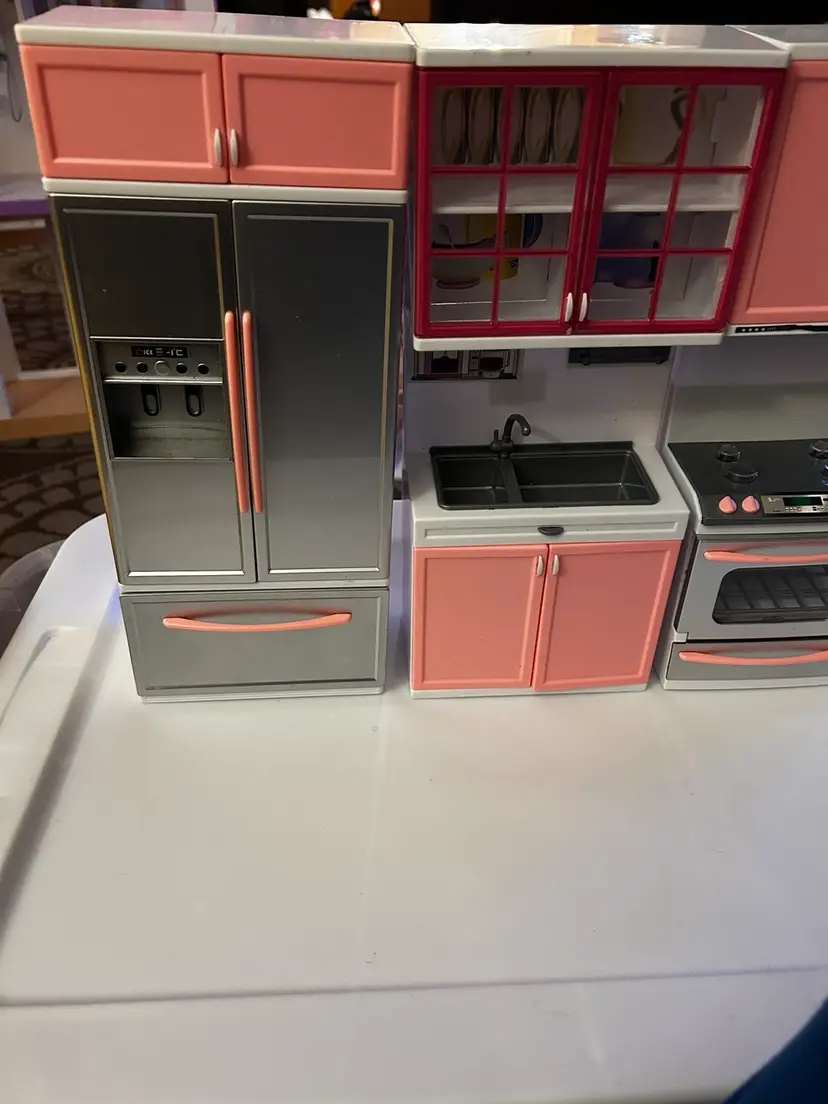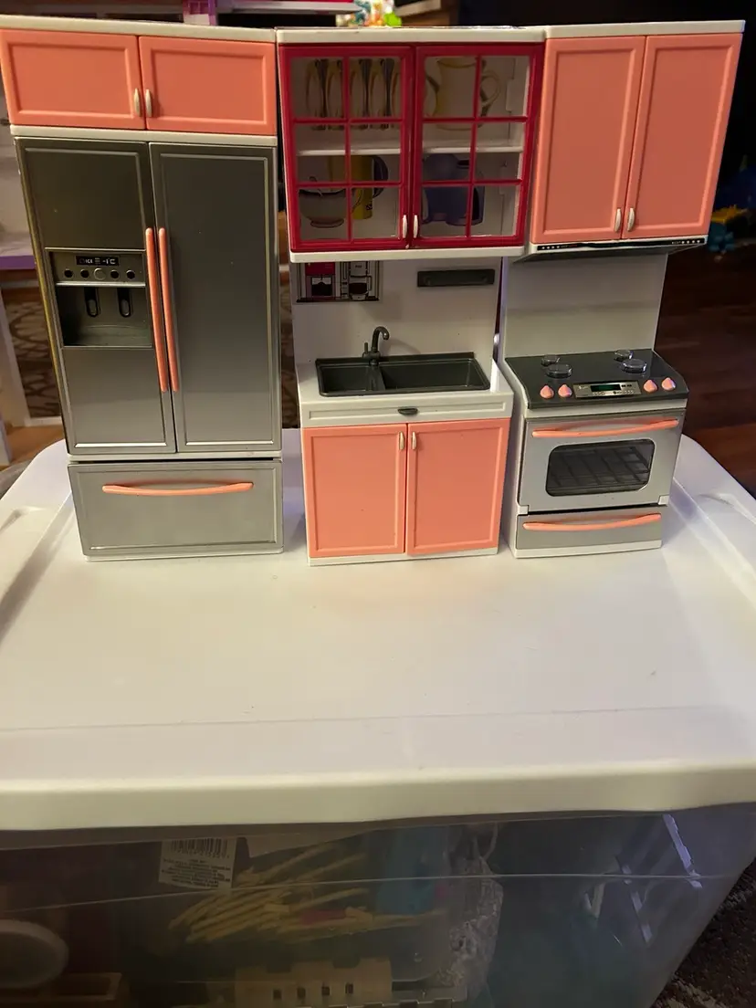 This is a doll sized kitchen play set. It is like new and has lights and sounds. Comes as a three piece set. Measures 17.5 x 13.5 x 3 inches and is made of plastic.