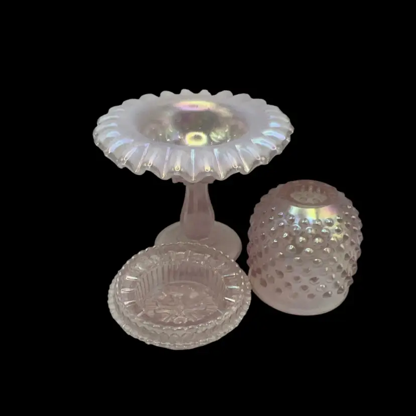 Stunning iridescence, footed with a snow crest glass insert. Extremely rare and in mint condition!