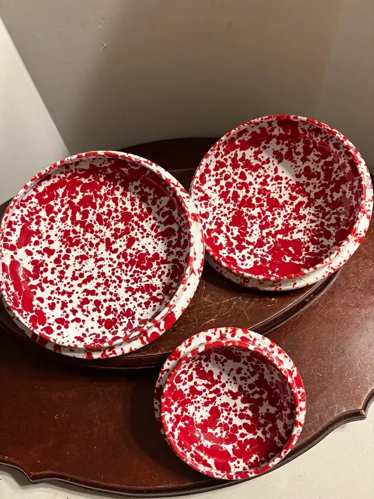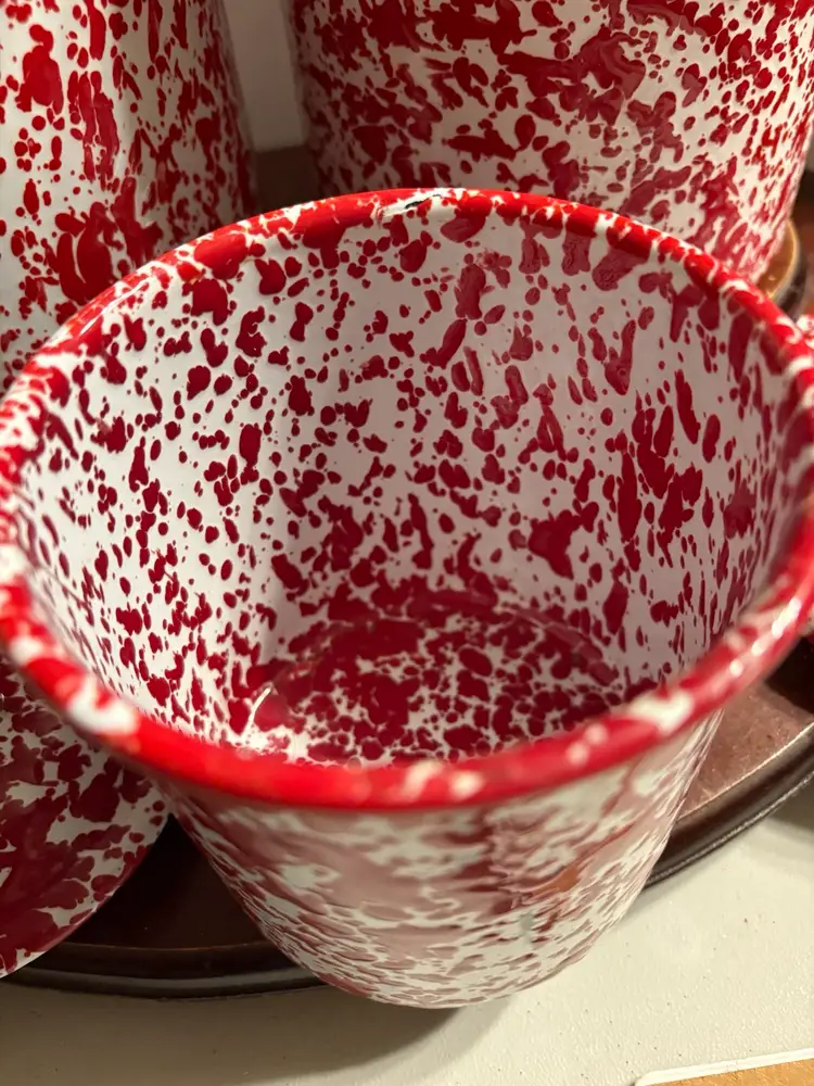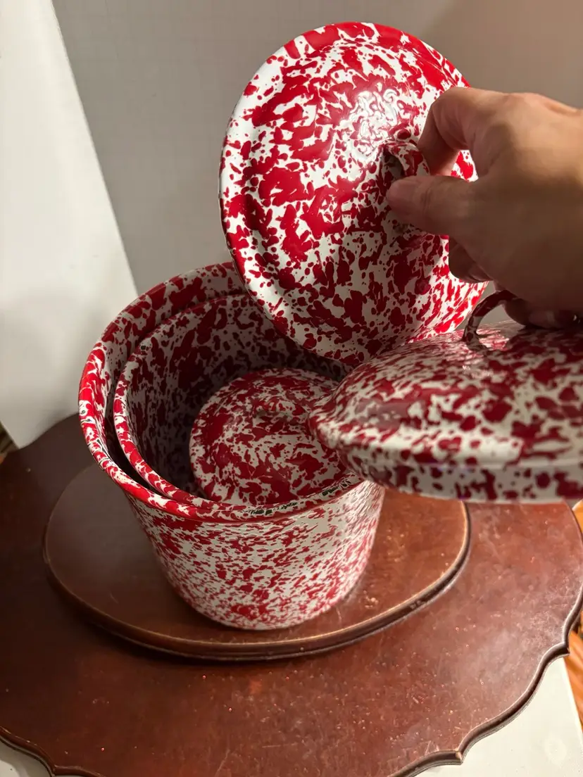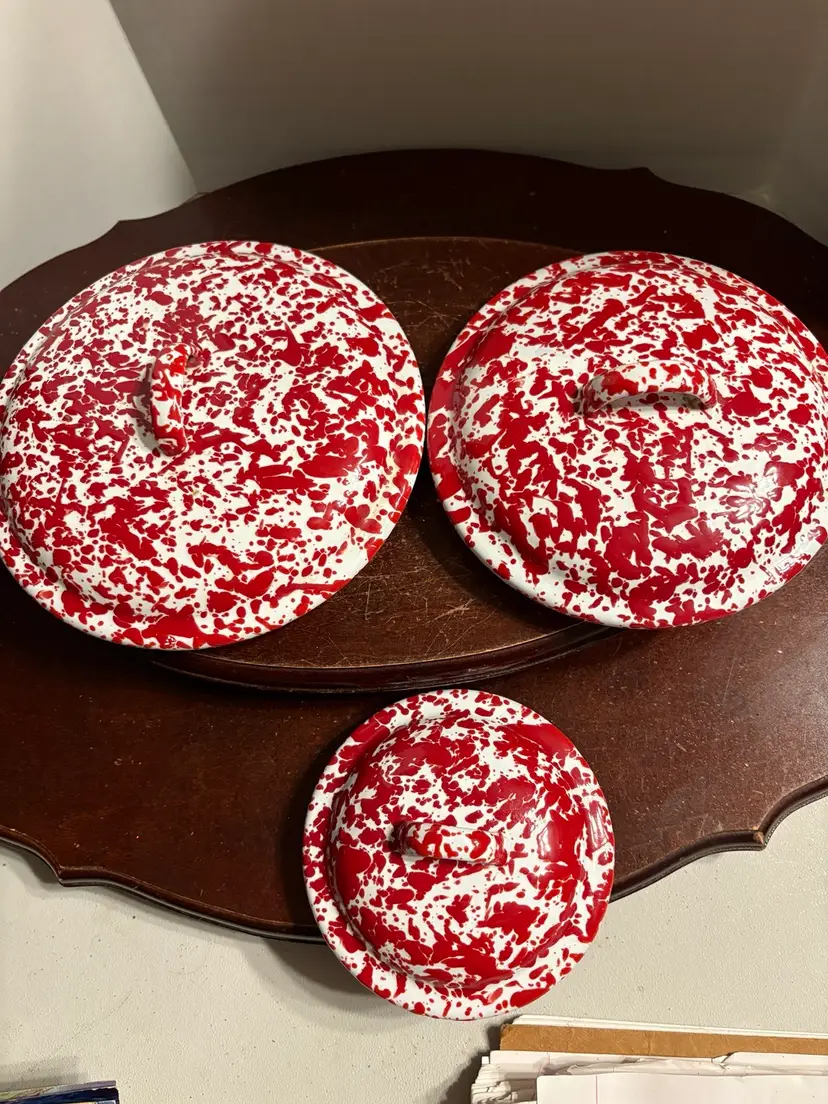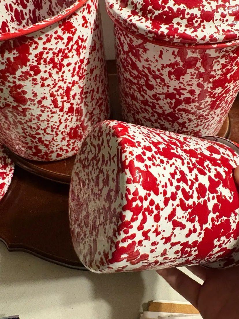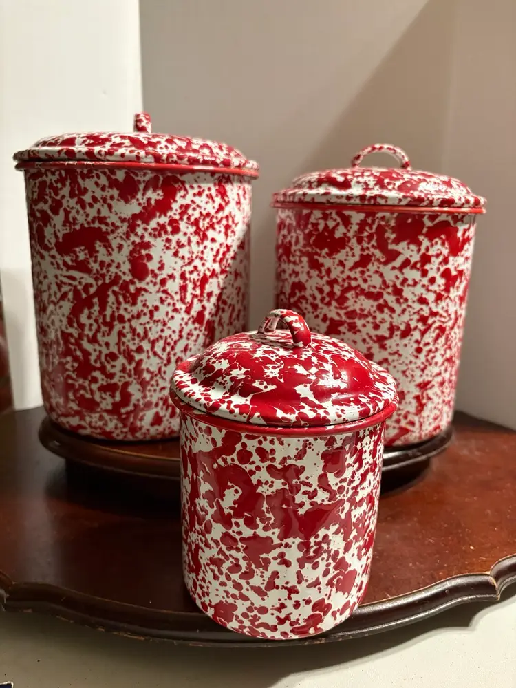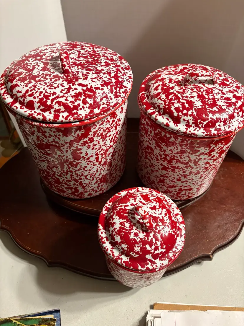 Set of 3 comes with 3 lids. Canisters are 8”, 6”, and 4”. Unknown maker.