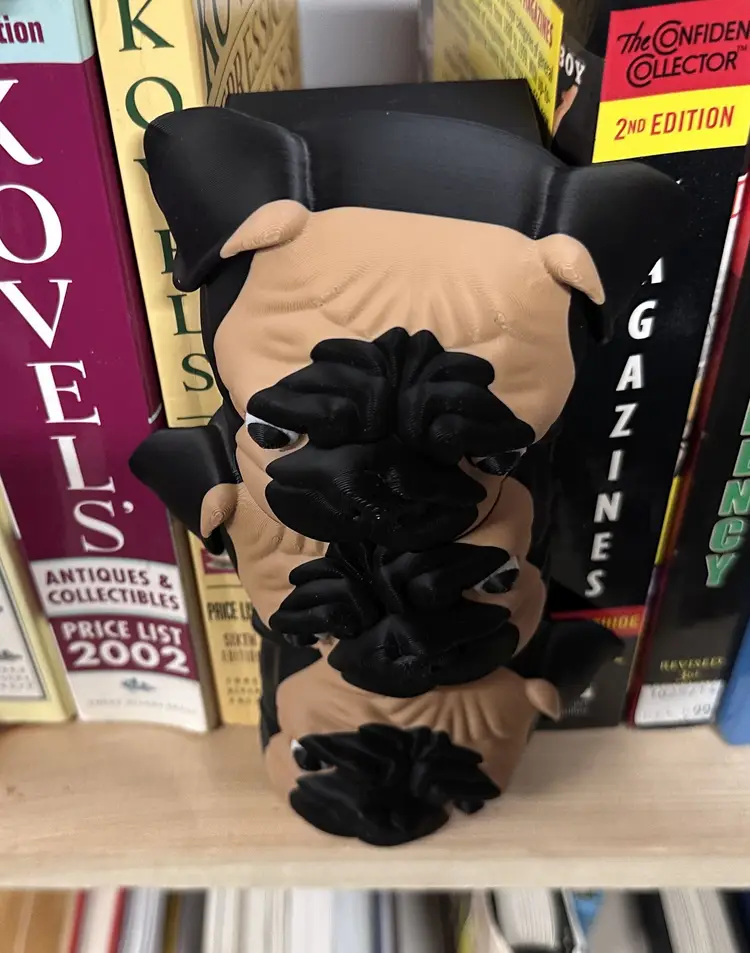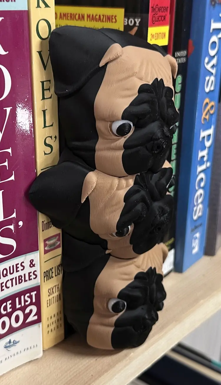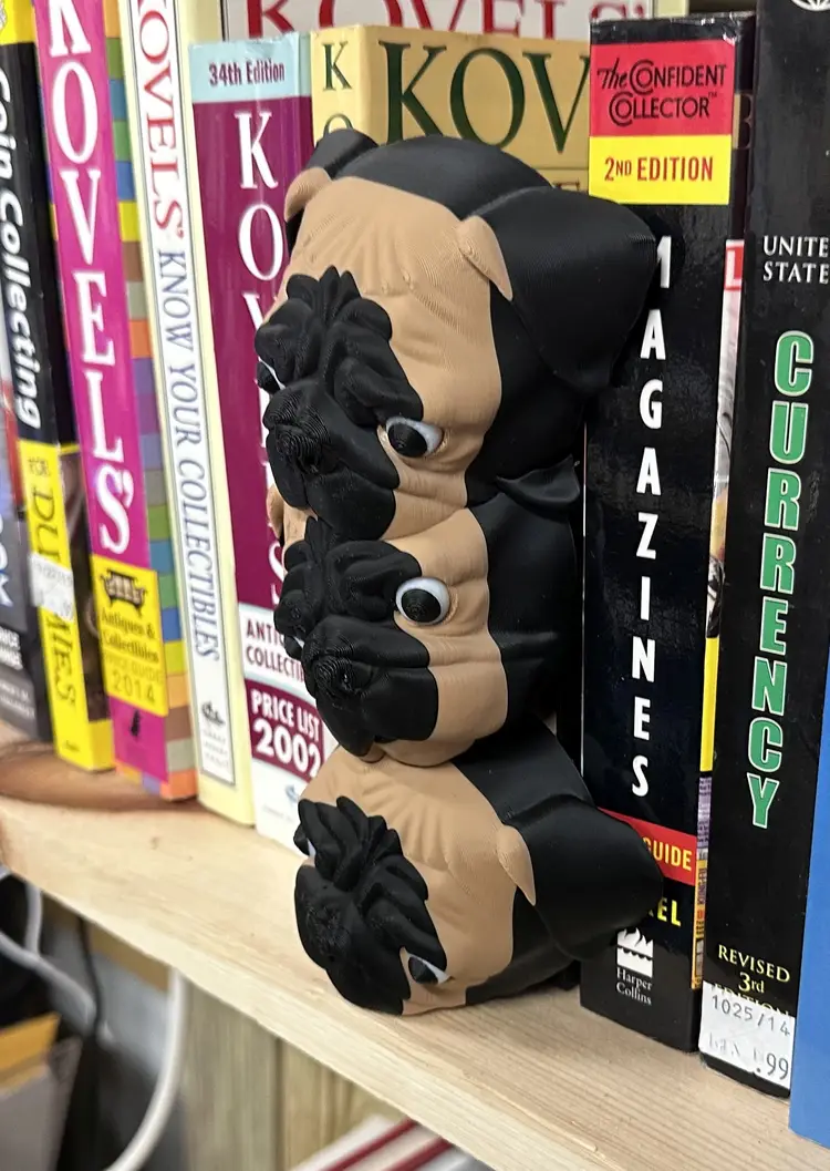Each piece is 3D printed and made to order. Great for pug lovers, bookworms, and anyone who wants a unique conversation piece for their library, office, or living room.