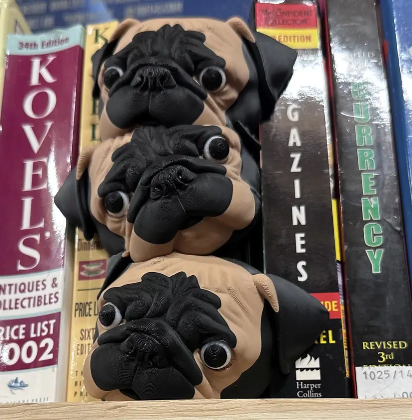 Bring some personality to your bookshelf with this adorable 3-pug “book nook” / shelf sitter! This stacked trio of pugs is designed to tuck between your books (or sit on a shelf) and instantly adds a fun, cozy vibe to any reading space.