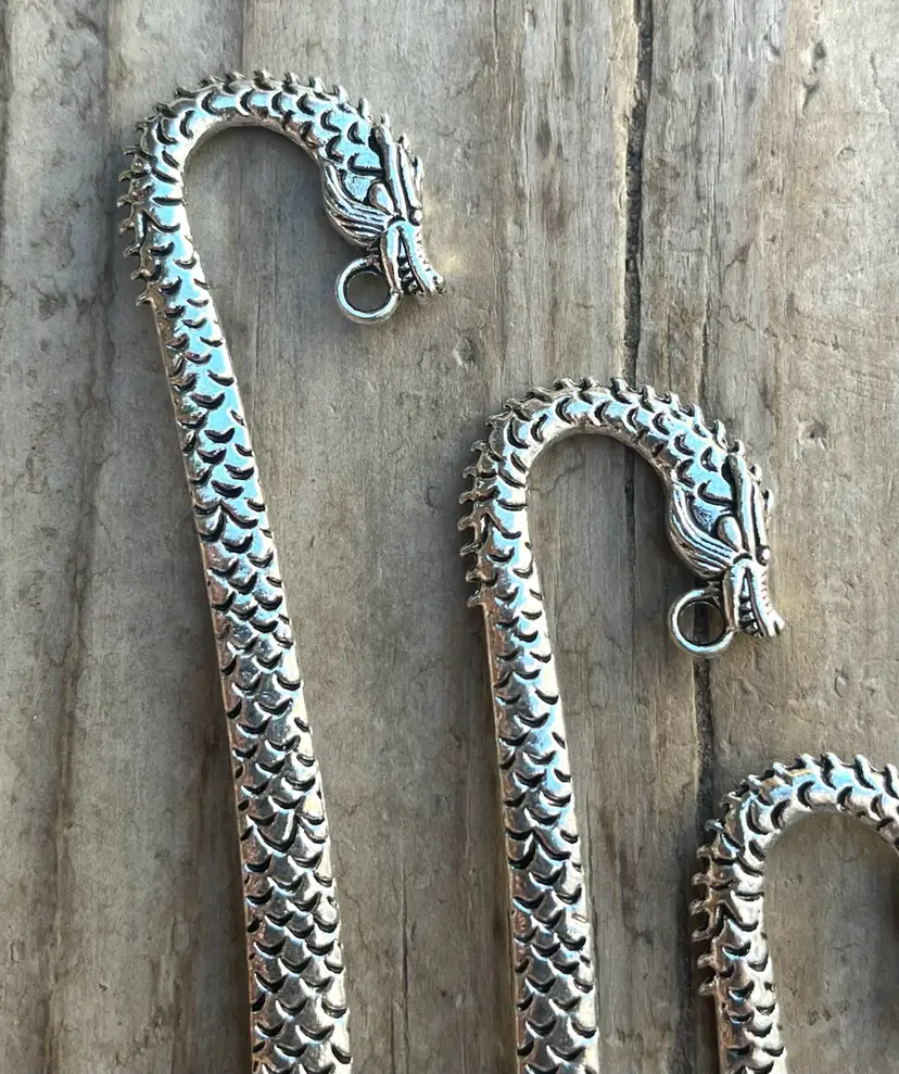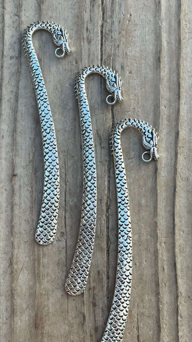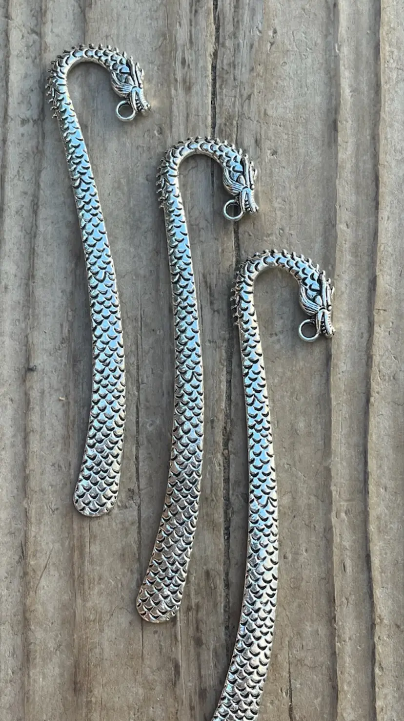 A set of three metal dragon bookmarks to add a charm to. Approximately 4 7/8 inches long and 1 inch wide. New old stock.