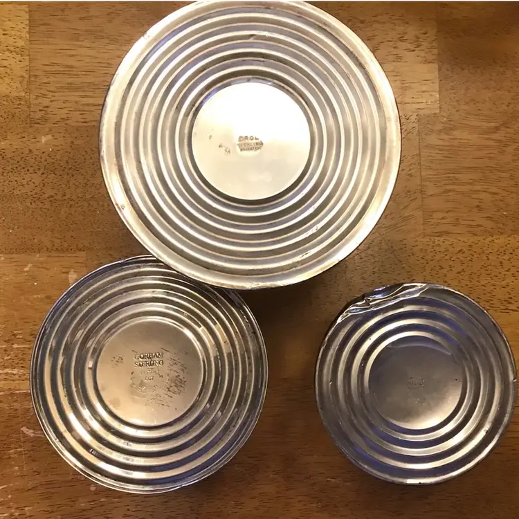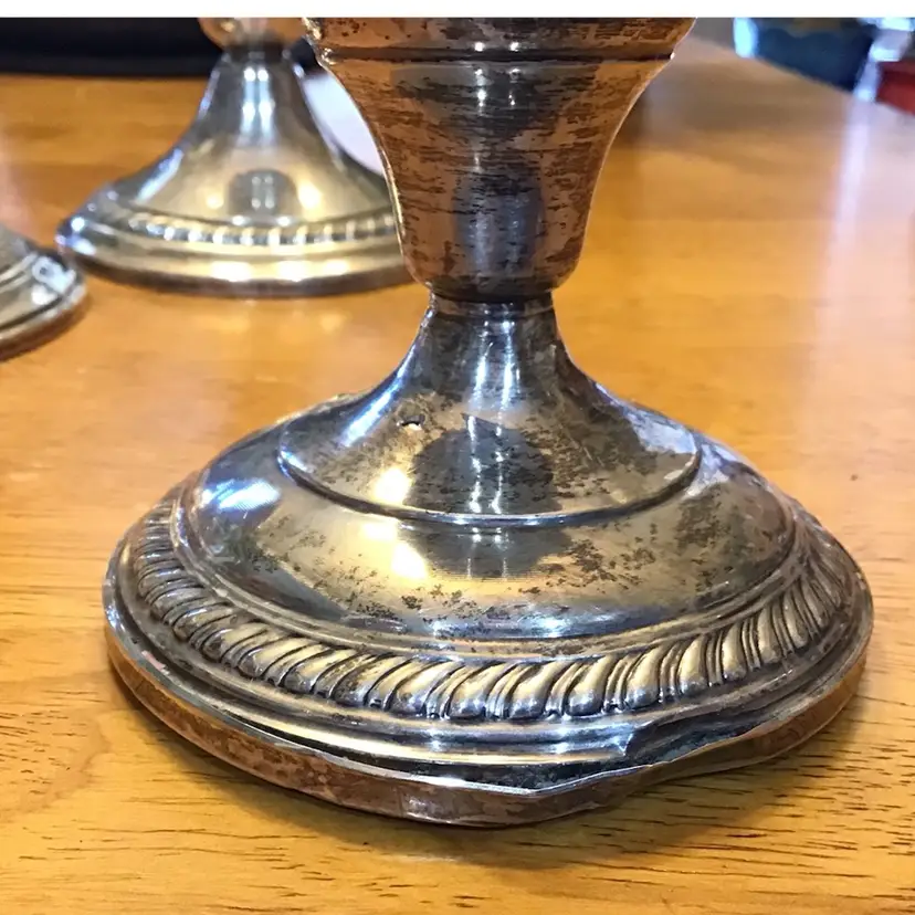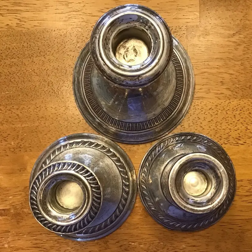 Three sterling candle holders are in great condition except one. One has a sizable dent and small hole. It can be turned around for display or you could just sell it for scrap. All three are weighted and have different manufacturers. They are all less than 5 inches tall and approximately 3 inches wide. See all pictures as they are an important part of the description.
