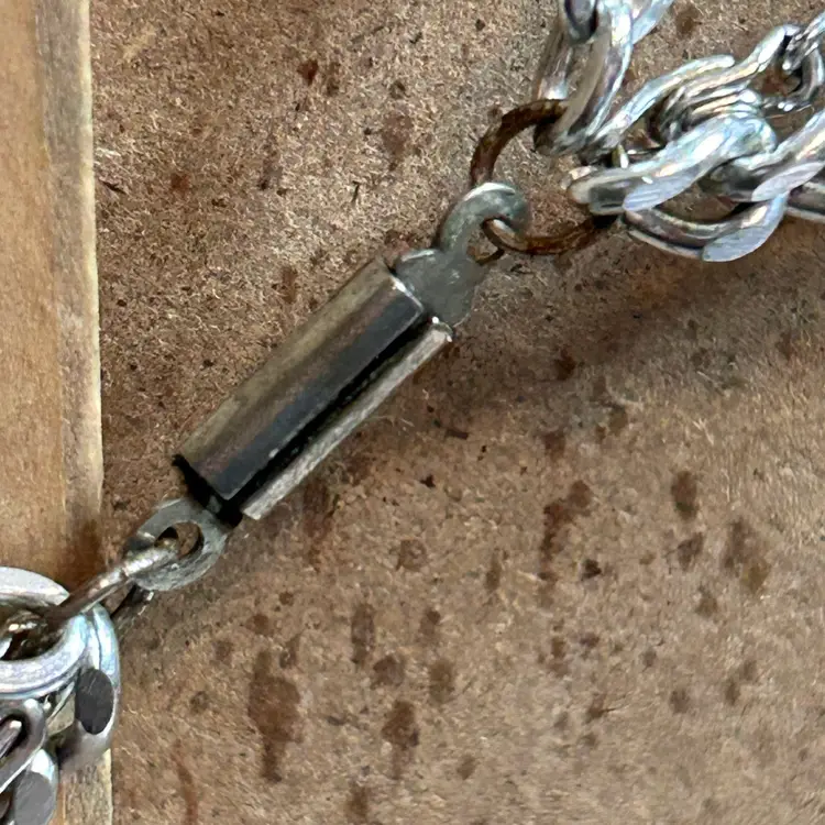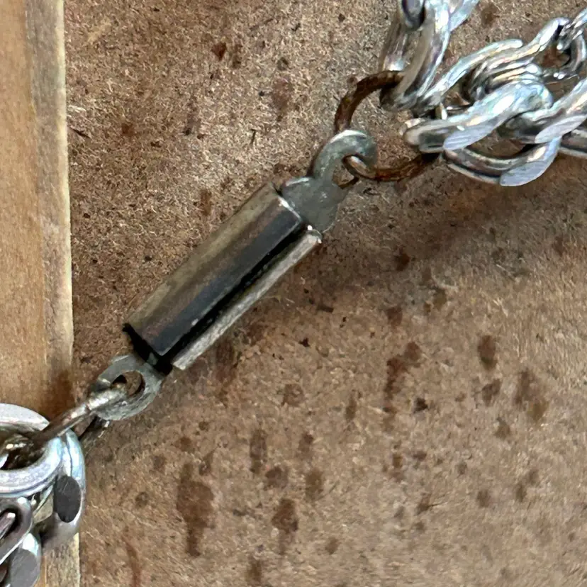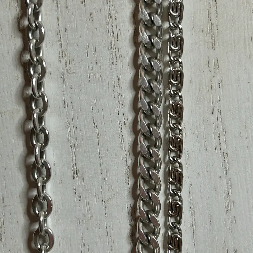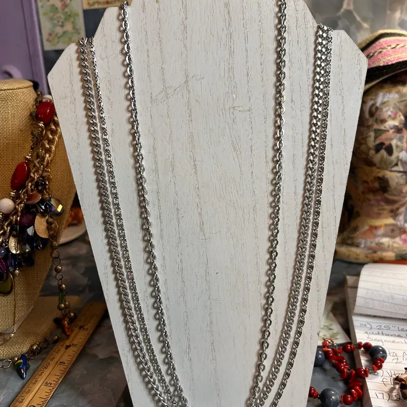 28” length silver tone necklace. Each of the 3 strands are different. In excellent vintage condition. Please see photos as they are part of the description. Thank you for looking!